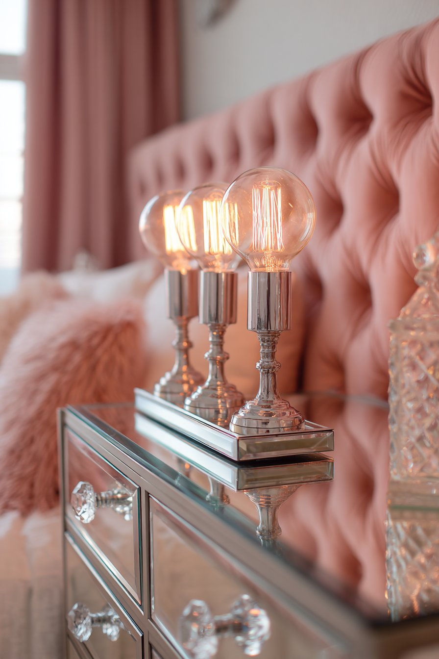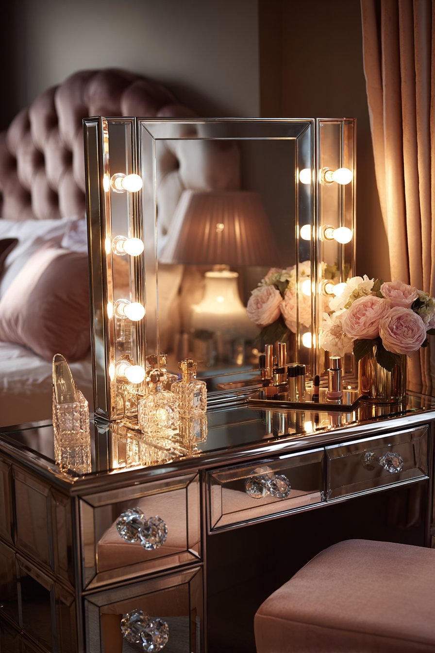 The glamorous Hollywood Regency bedroom dressing mirror idea channels the golden age of cinema with an illuminated vanity mirror surrounded by Edison bulb lighting. This design creates an unmistakably luxurious dressing area that makes every daily grooming ritual feel like preparation for a starring role. The chrome frame gleams under the warm glow of the surrounding bulbs, while the mirror sits atop a mirrored dresser with crystal knobs—a multiplication of reflective surfaces that amplifies light and creates dazzling visual interest.