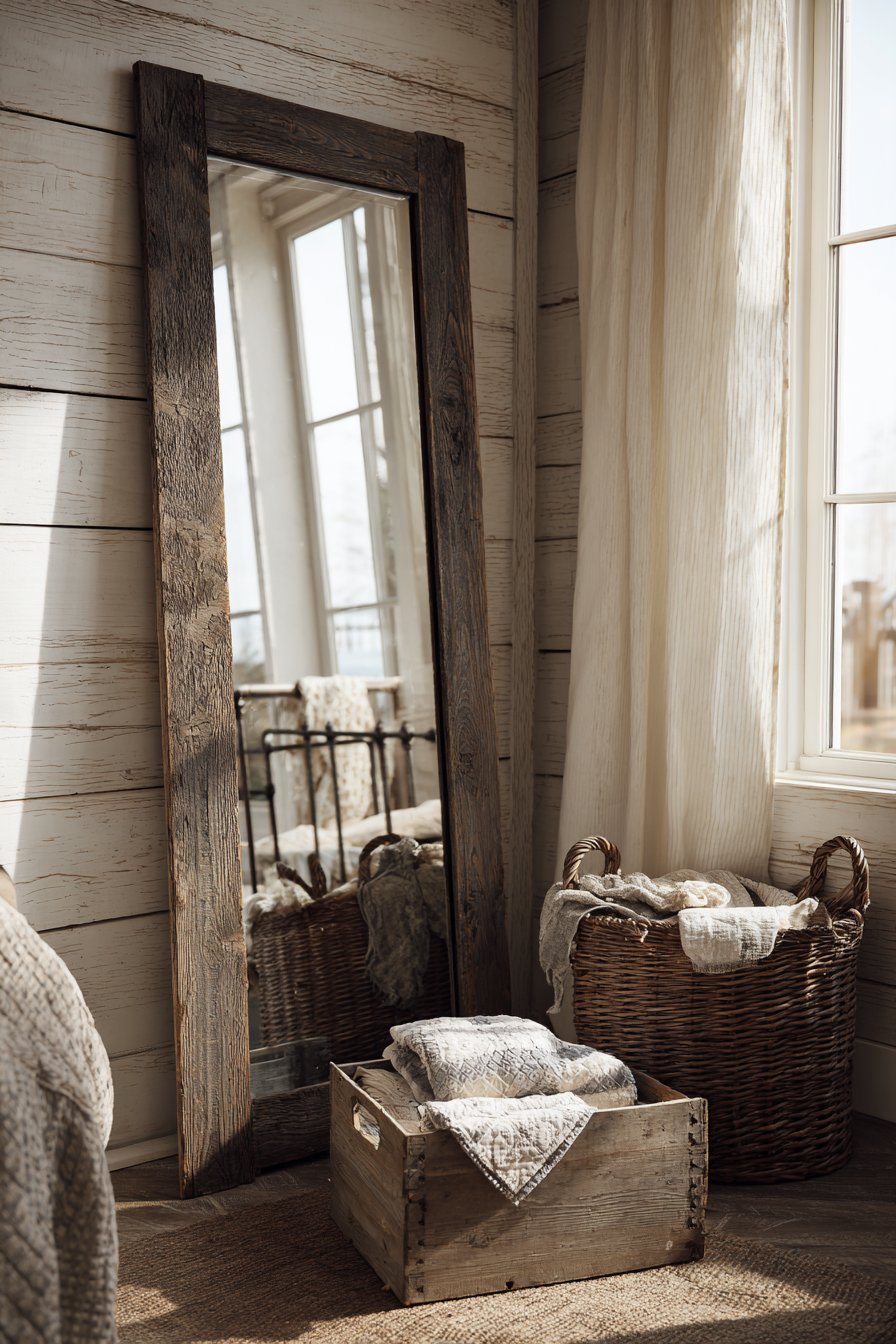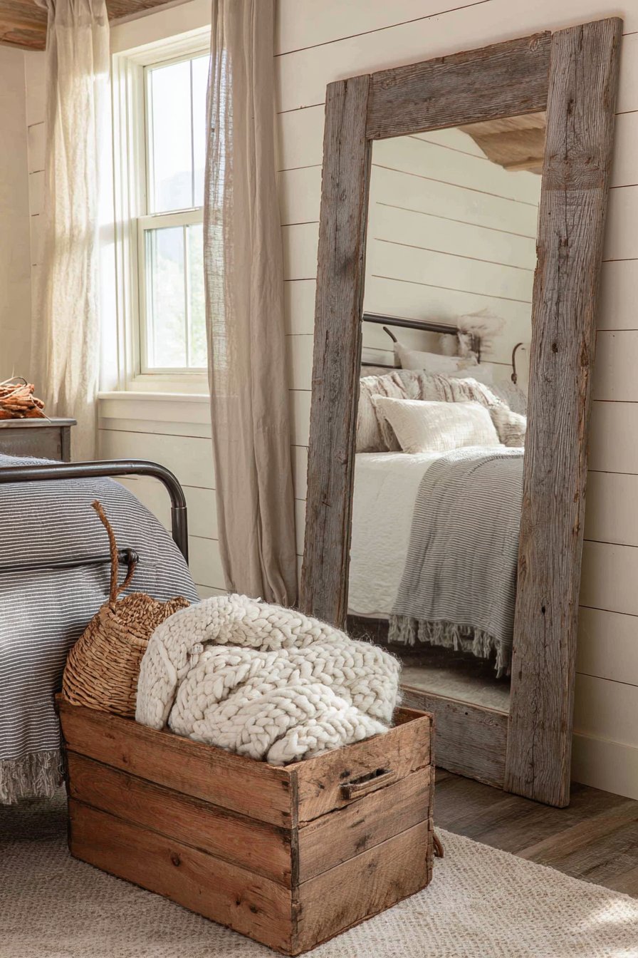 This approach to dressing mirror ideas for bedroom design celebrates imperfection and natural beauty. The weathered finish might reveal multiple layers of paint, knots and grain variations in the wood, or the gentle patina that comes from age and use. Against white or cream shiplap walls, the wood tones create warm contrast while maintaining the light, airy feeling essential to farmhouse style.