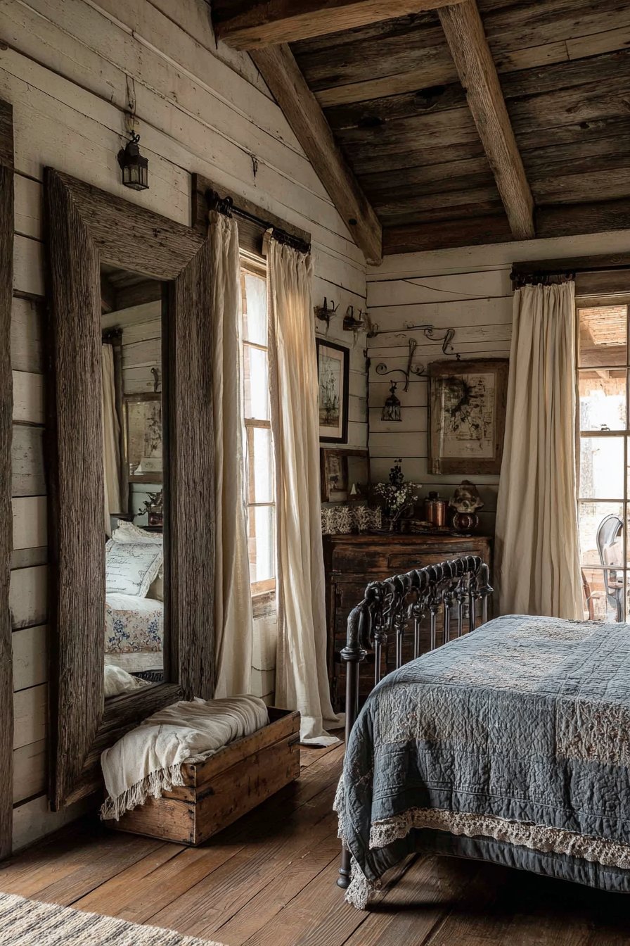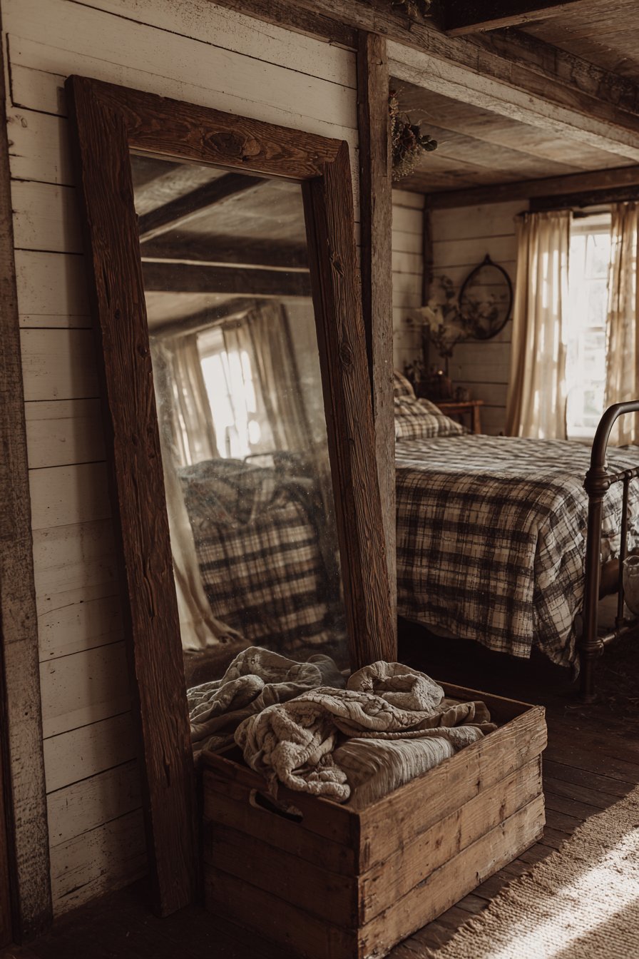 The cozy bedroom setting features complementary elements that reinforce the rustic aesthetic—a wrought iron bed frame with its sturdy, handcrafted appearance; vintage quilts in traditional patterns; and distressed furniture pieces that look like treasured family heirlooms. A simple wooden crate at the mirror’s base holds neatly folded linens, combining practical storage with authentic farmhouse styling.
