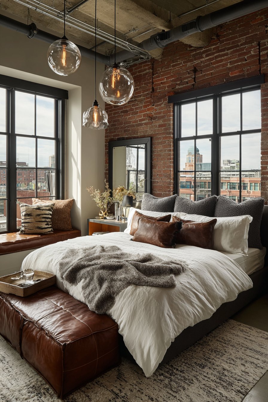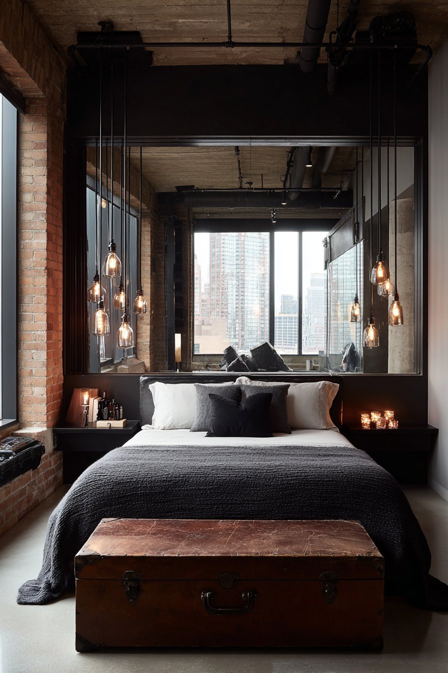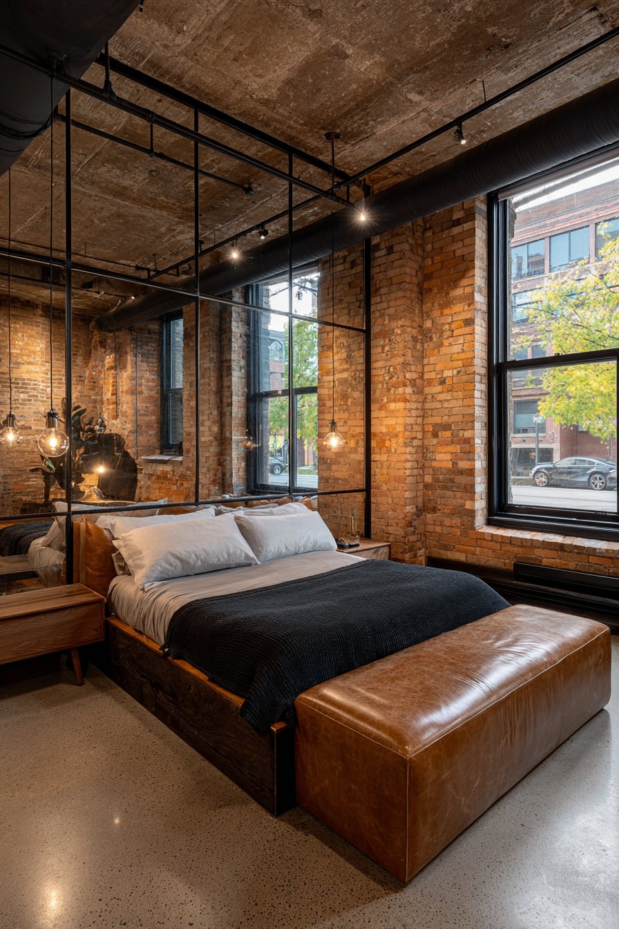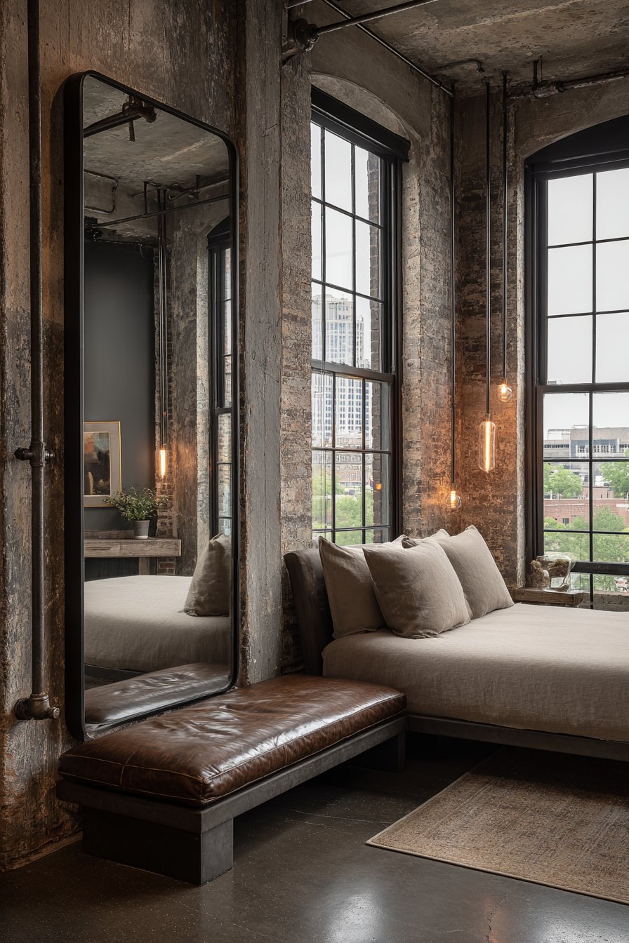 The urban bedroom setting amplifies this industrial vibe with complementary elements: a metal bed frame with clean, angular lines; concrete floors polished to a subtle sheen; and Edison bulb pendant lighting that nods to early industrial lighting while providing warm, ambient illumination. A vintage leather bench positioned before the mirror adds a touch of softness and luxury without compromising the space’s industrial integrity.