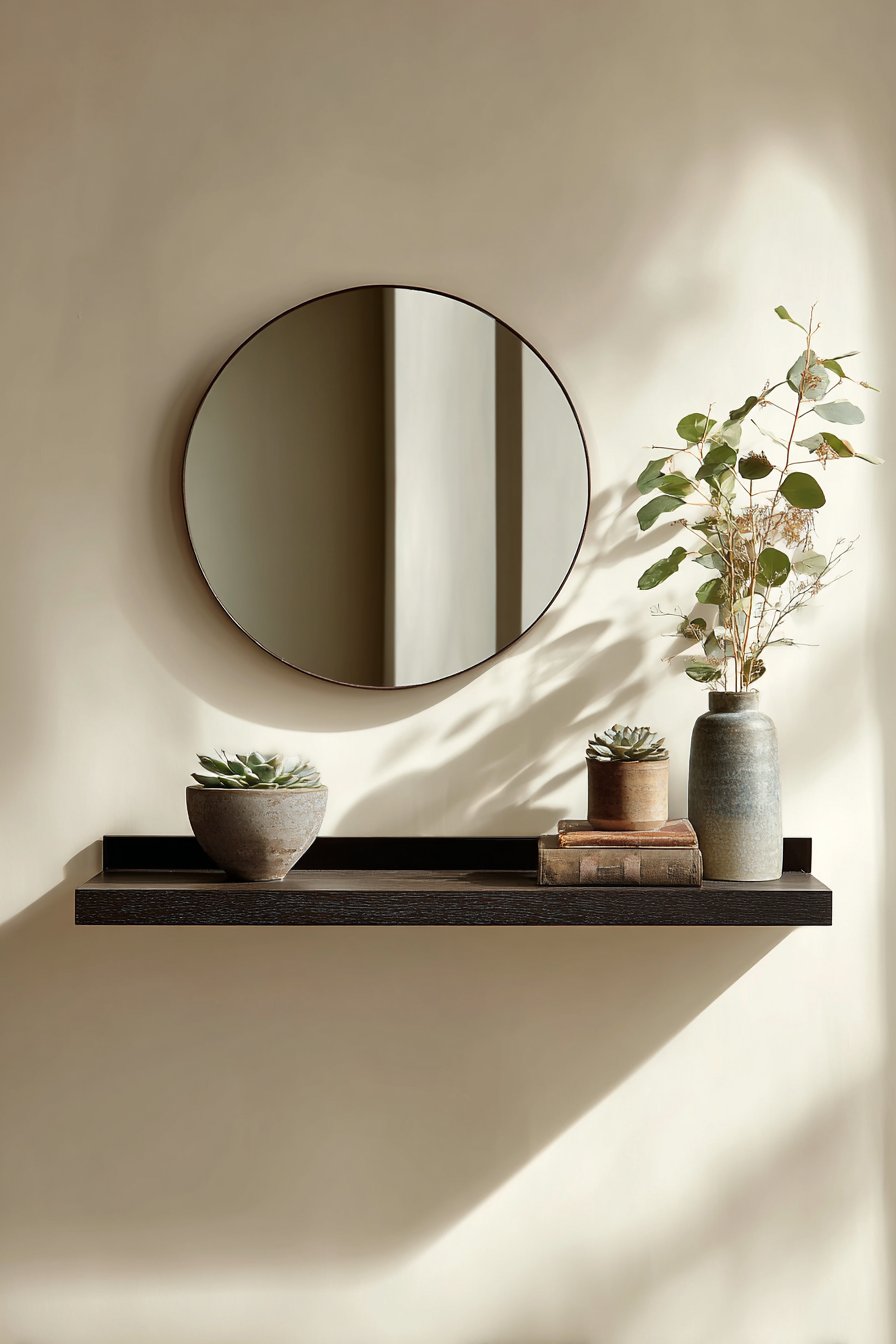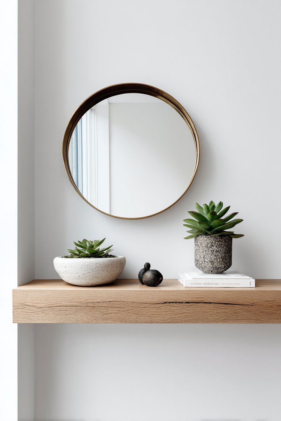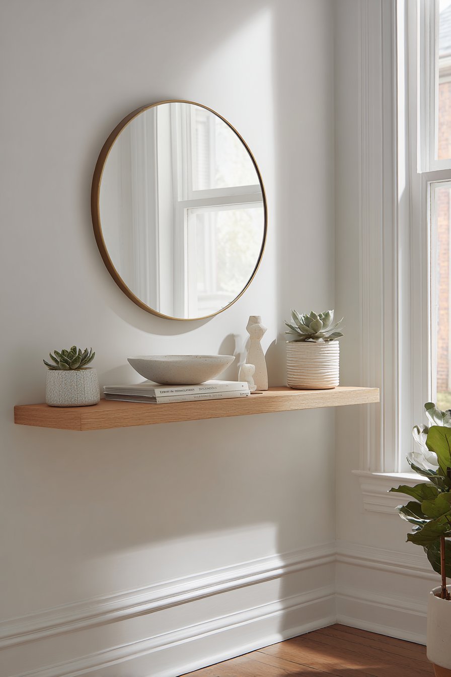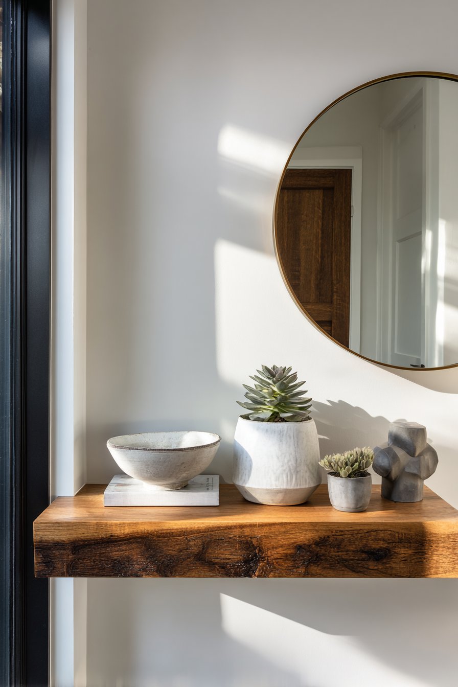 What makes this design particularly effective is how it balances form and function. The floating shelf serves as a practical surface for keys, sunglasses, or mail, while the mirror provides a last-minute appearance check before heading out the door. The succulent requires minimal maintenance yet brings life to the space, while the ceramic bowl and sculpture add artistic interest without cluttering the visual field. Natural daylight creates subtle shadows that emphasize the shelf’s floating effect, adding dimension and interest throughout the day as light conditions change.