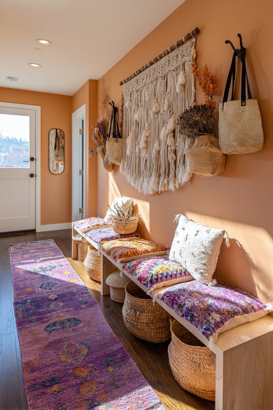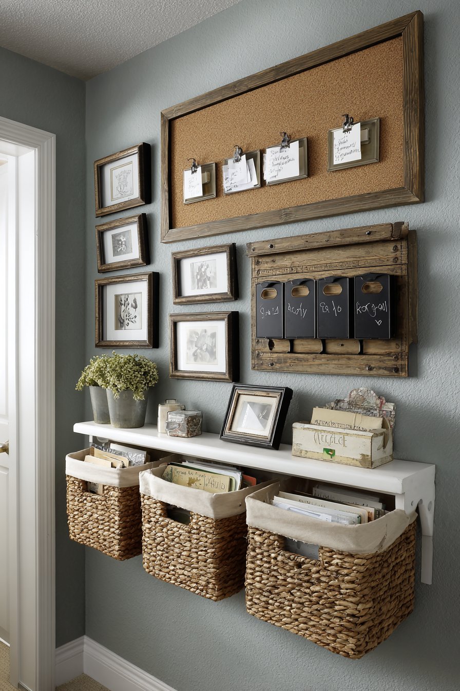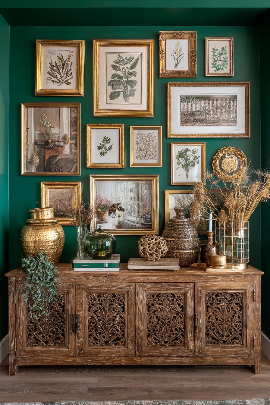 The color strategies employed across these designs demonstrate sophisticated understanding of how hue, value, and saturation impact spatial perception and emotional response. The soft sage green of the mudroom-style system creates calm in what’s often a chaotic space. The deep navy blue accent wall adds drama without overwhelming. The warm terracotta behind the bohemian display enhances the organic materials. The crisp white wainscoting brightens and opens. The deep emerald green supports the visual weight of the maximalist gallery. Each color choice is intentional, serving both aesthetic and functional purposes while demonstrating how paint—one of the most affordable design tools—can completely transform a space.