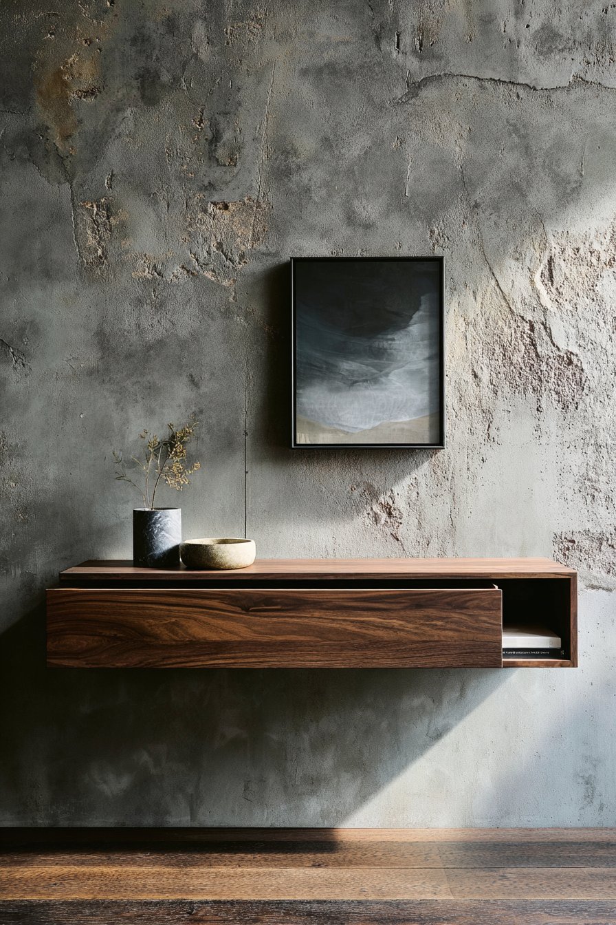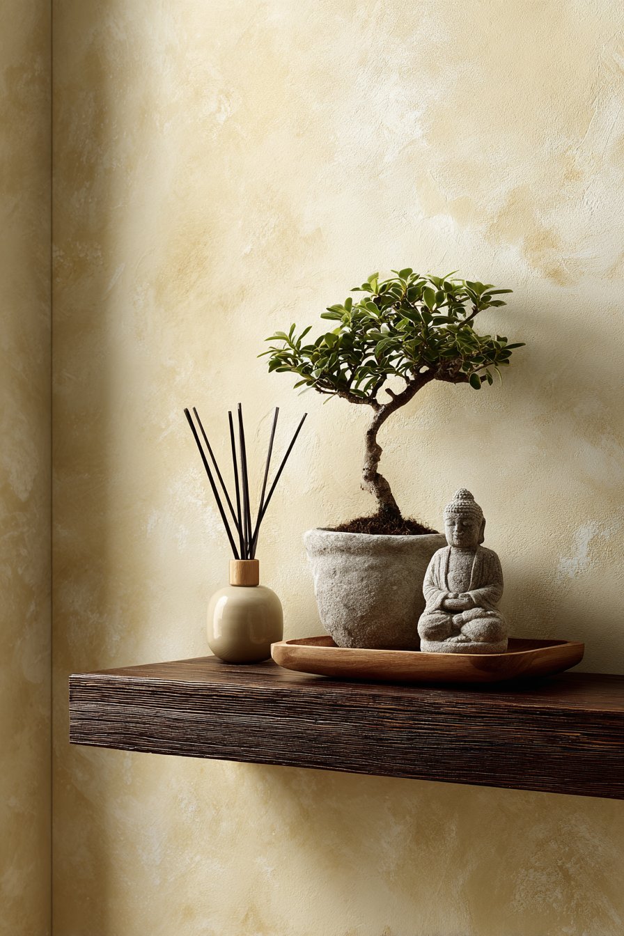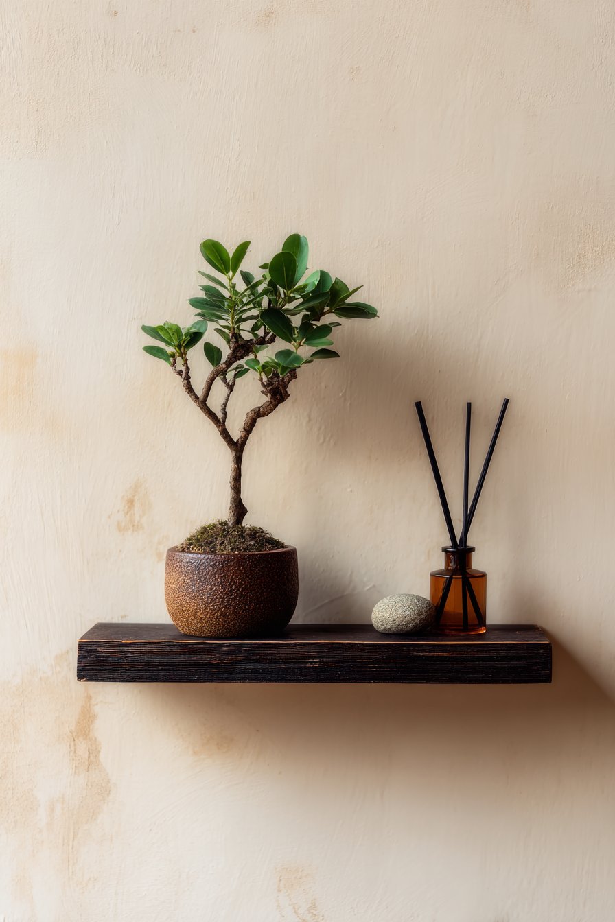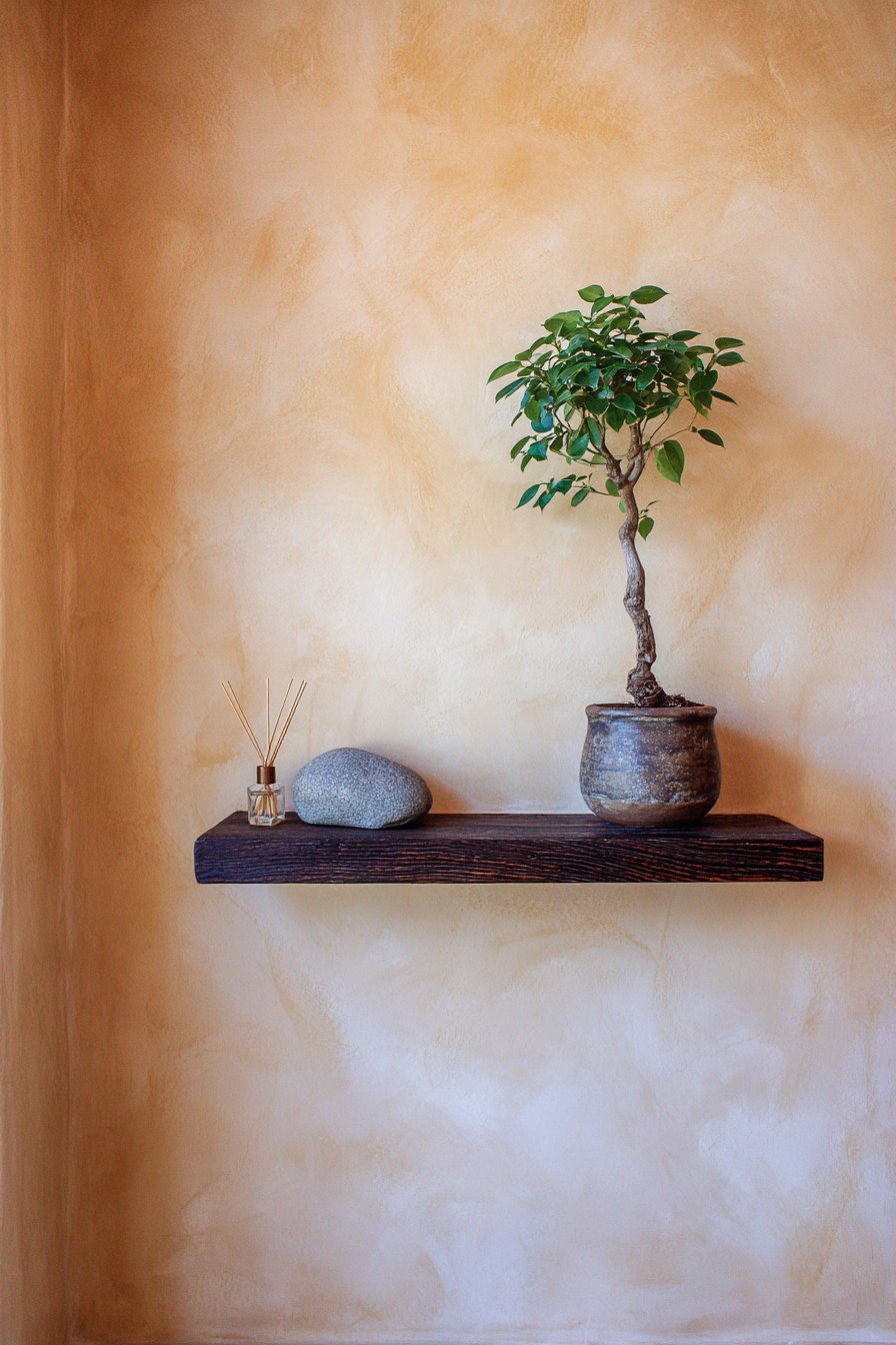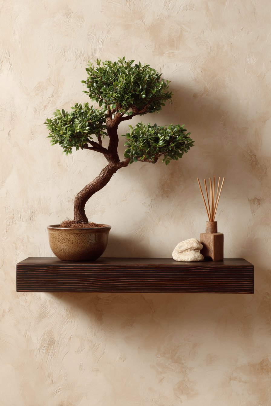 The principles of Japanese design—simplicity, natural materials, mindful placement, and appreciation of negative space—create a sense of calm and intentionality in this entryway wall idea. A simple floating shelf in dark stained wood appears to hover against a smooth plaster wall in warm cream tone, the minimal intervention allowing the wall itself to be appreciated as a design element. On the shelf, a single bonsai tree in a ceramic pot represents the Japanese appreciation for nature and careful cultivation, while a small stone sculpture adds natural material and sculptural form. A reed diffuser provides subtle fragrance, its simple glass container and natural reeds maintaining the aesthetic purity.