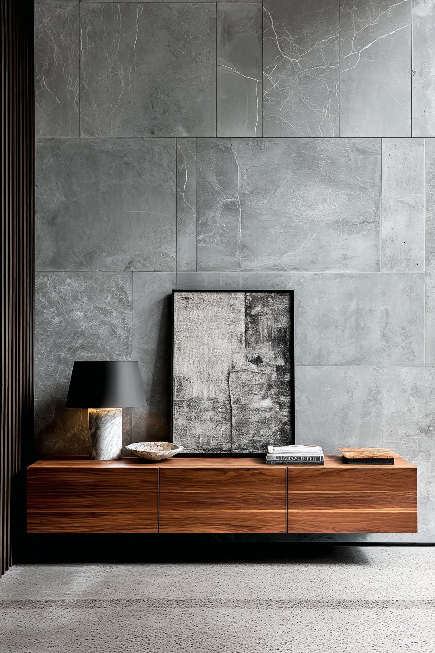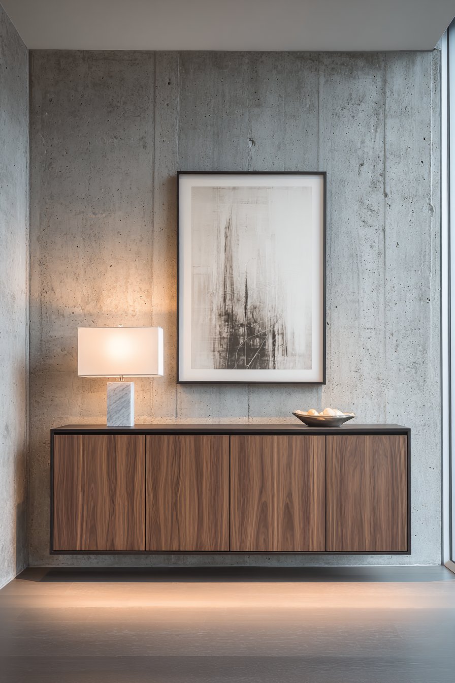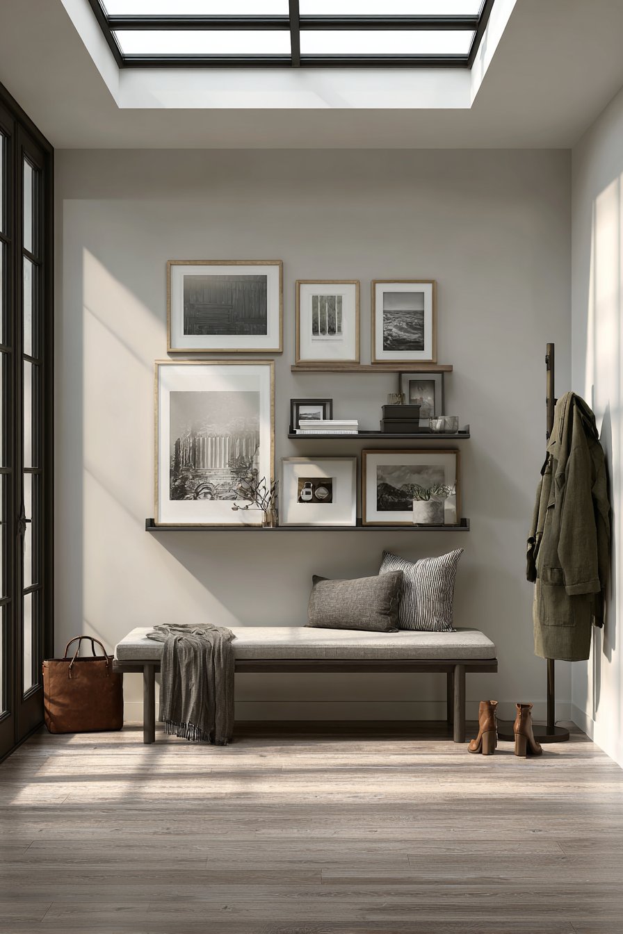 The beauty of minimalist design lies in its restraint, and nowhere is this more elegantly demonstrated than in a carefully curated floating shelf display against a soft warm white wall. This entryway wall idea centers on a sleek white oak floating shelf that appears to hover effortlessly, creating a sense of weightlessness that’s both modern and inviting. The magic happens in the careful selection and placement of objects: a handcrafted ceramic bowl with organic curves, a small potted succulent adding a touch of living greenery, and an abstract sculpture that serves as a conversation starter. Each piece is chosen not just for its individual beauty but for how it contributes to the overall composition.