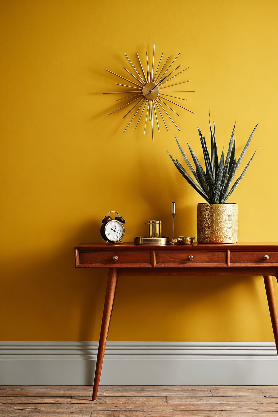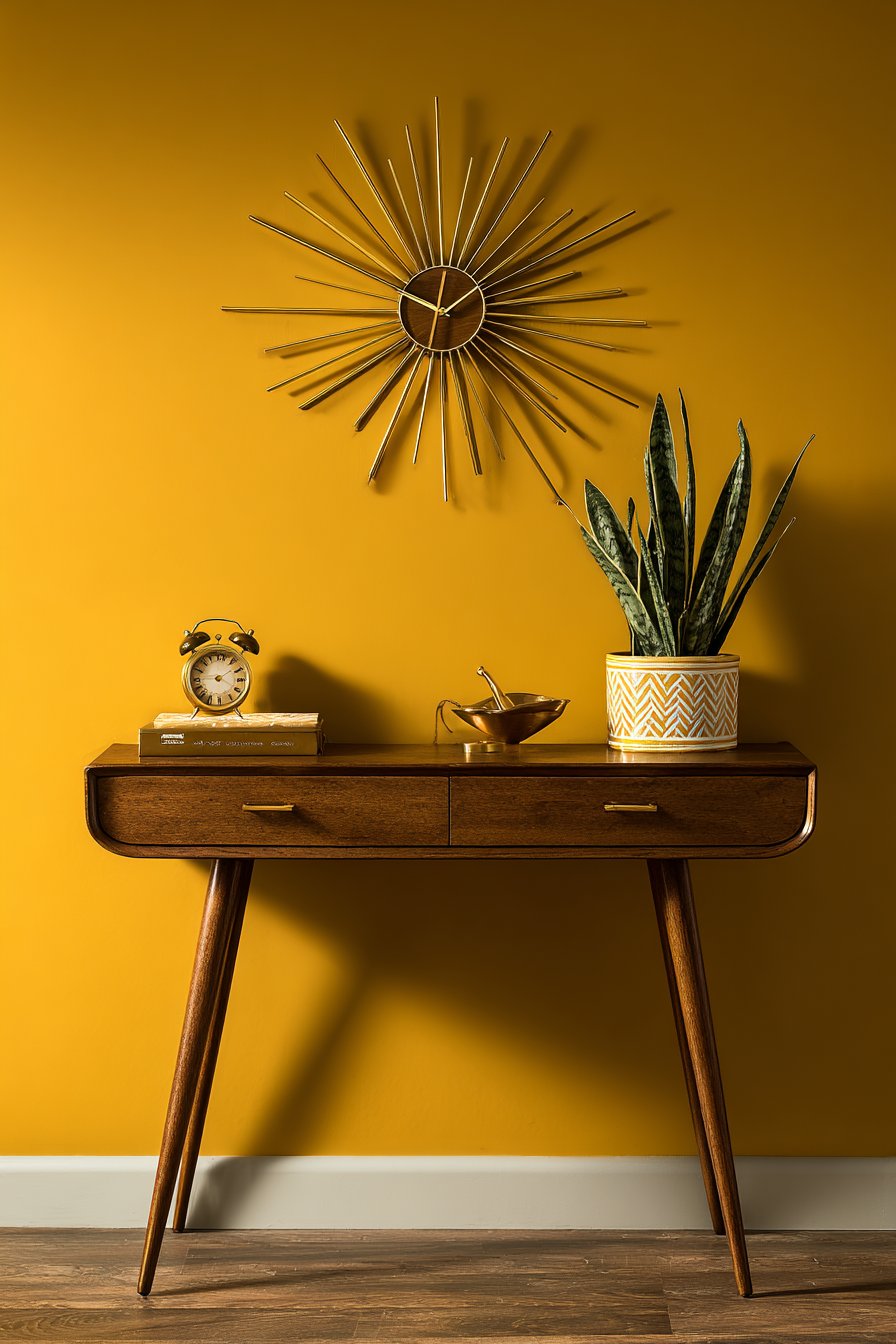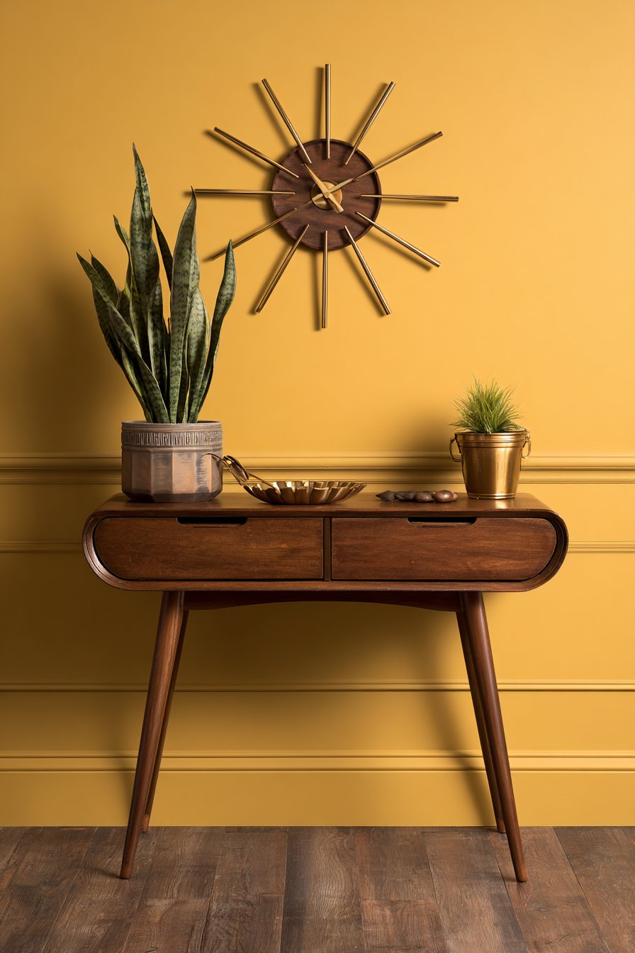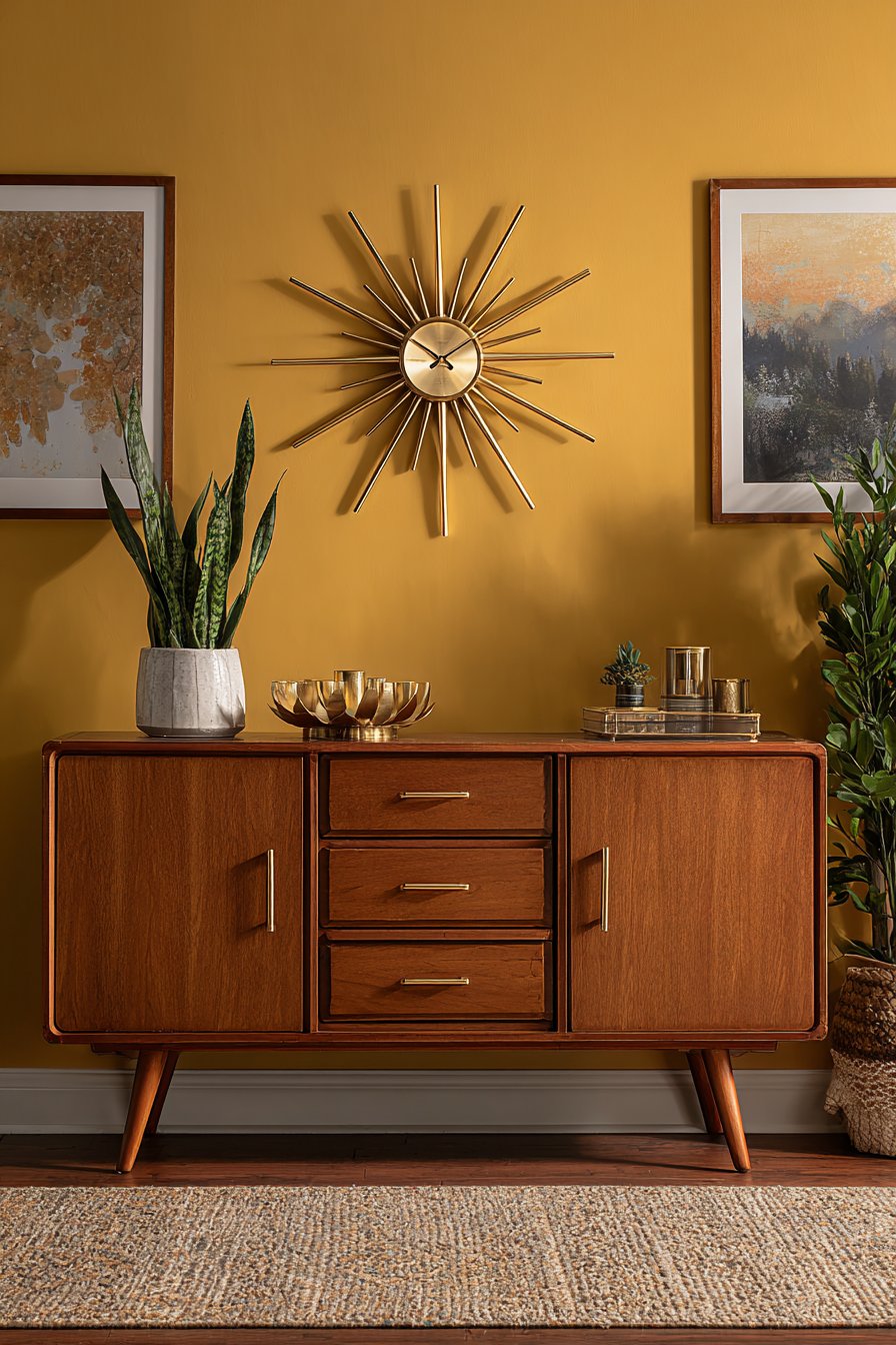 Color psychology principles are evident in the wall color choices throughout these designs. The calming blue-gray of the command center reduces stress in what could be a chaotic organizational space. The energizing mustard yellow of the mid-century design creates optimism and warmth. The serene seafoam of the coastal entry promotes relaxation. The grounding sage green of the mudroom system creates calm. The sophisticated navy blue adds depth and drama. The warm terracotta of the bohemian display creates coziness and earthiness. These aren’t random color choices but intentional selections based on the psychological and emotional effects of different hues.