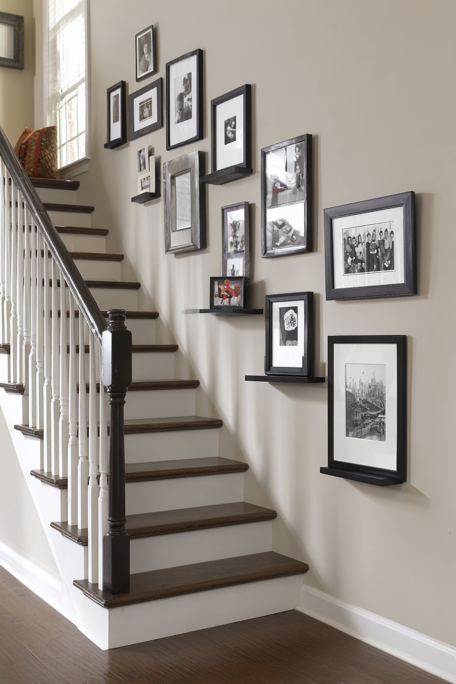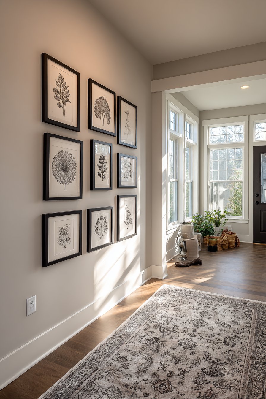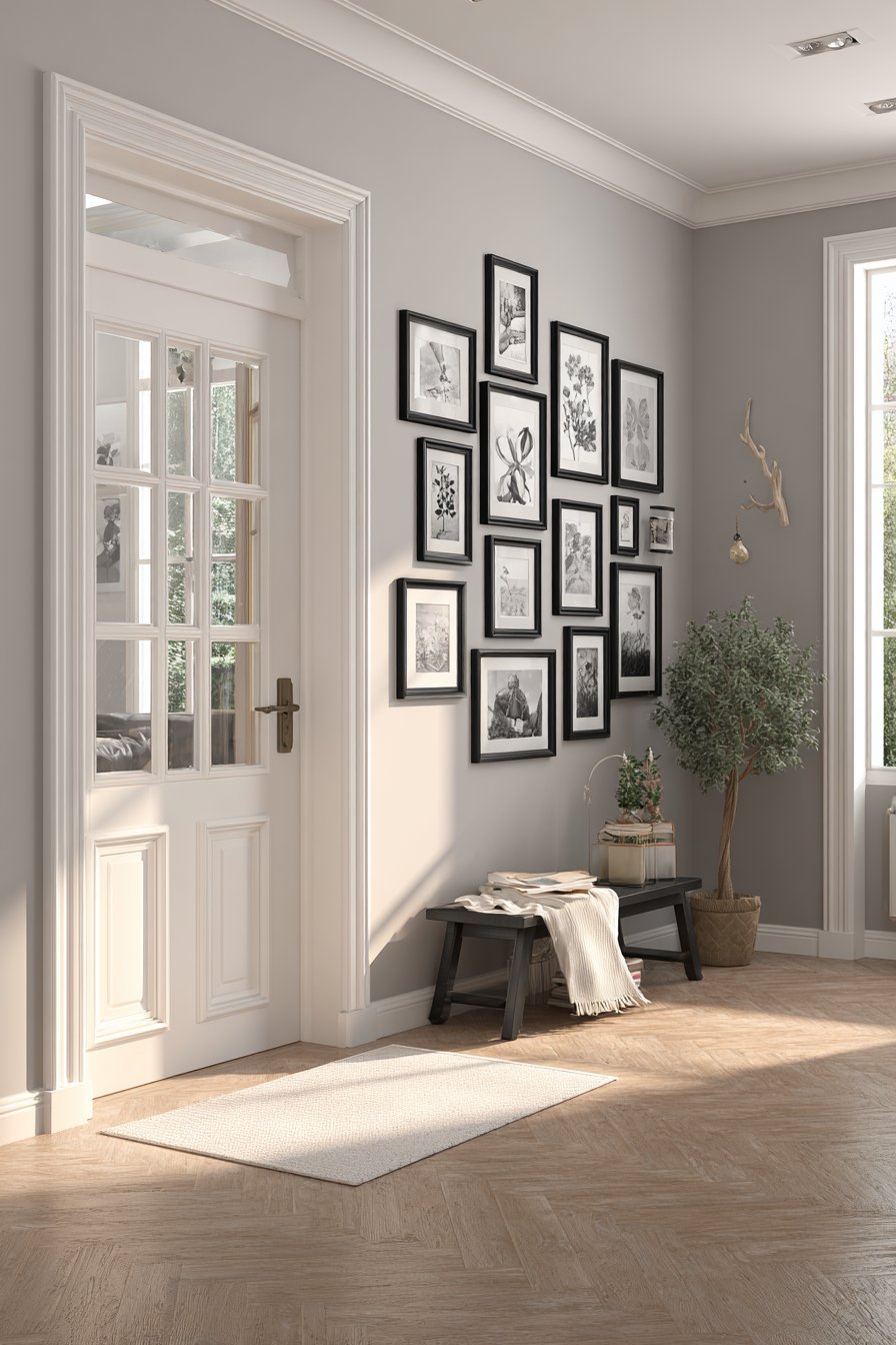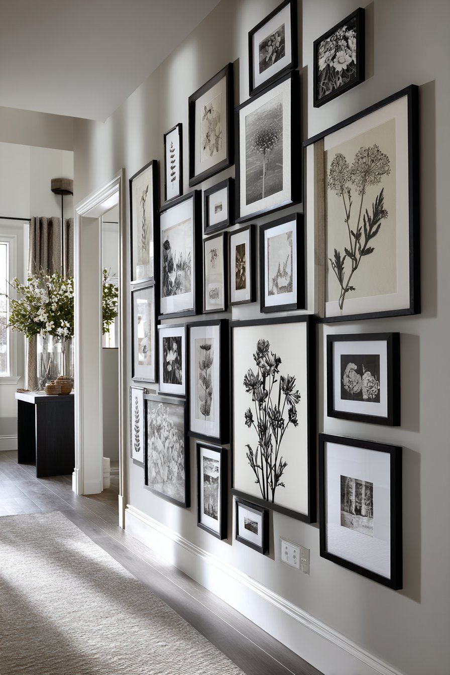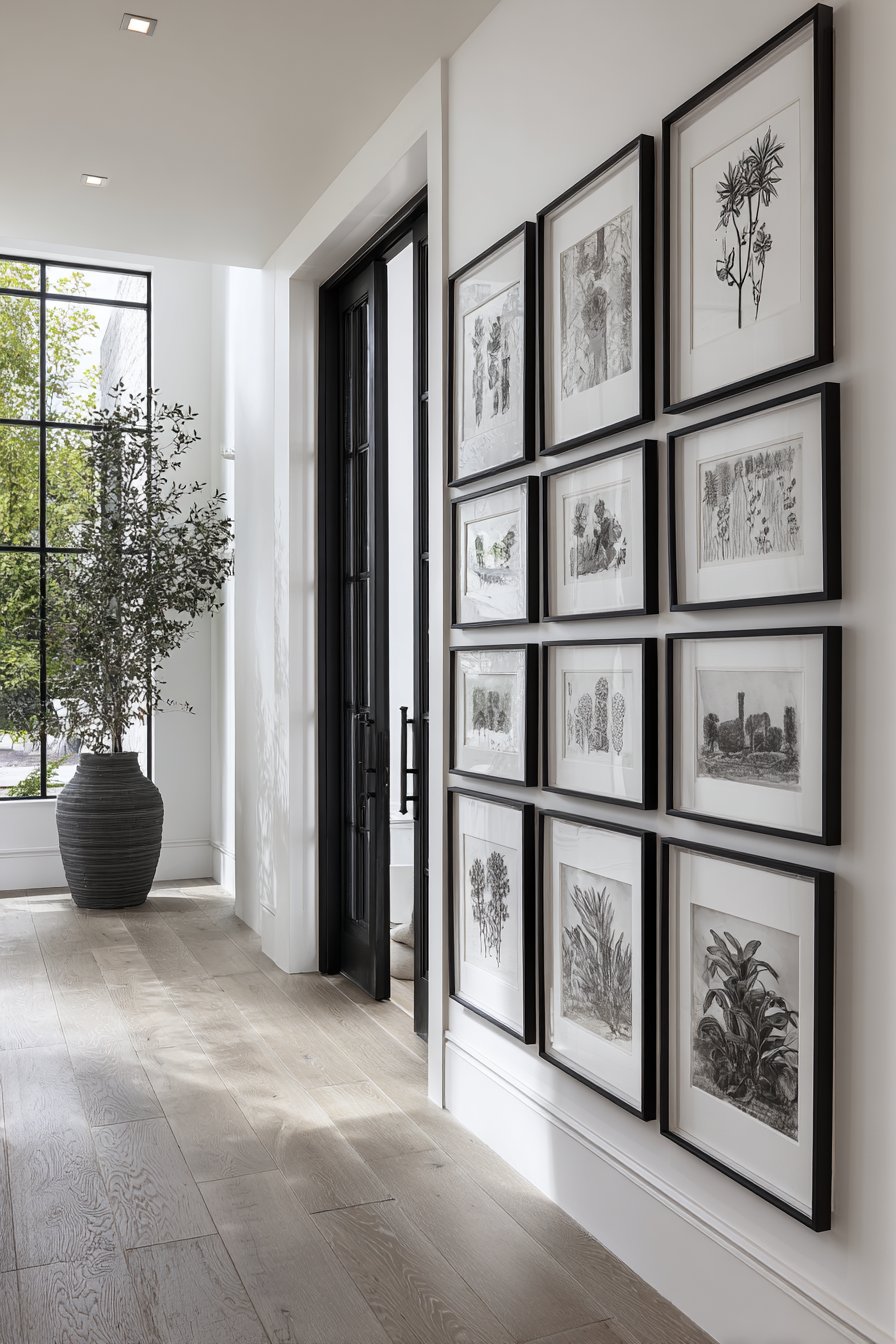 The gallery wall remains one of the most popular entryway wall ideas, and for good reason—it offers unparalleled opportunity for personal expression and visual impact. This particular approach emphasizes symmetry and cohesion through the use of matching matte black frames in various sizes, all arranged in a carefully planned grid pattern against a light gray wall. The frames contain a curated collection of black and white photography and botanical prints, creating a sophisticated monochromatic display that feels both timeless and contemporary. The grid arrangement brings order and intentionality to the composition, making even a large collection of images feel organized and purposeful rather than chaotic.