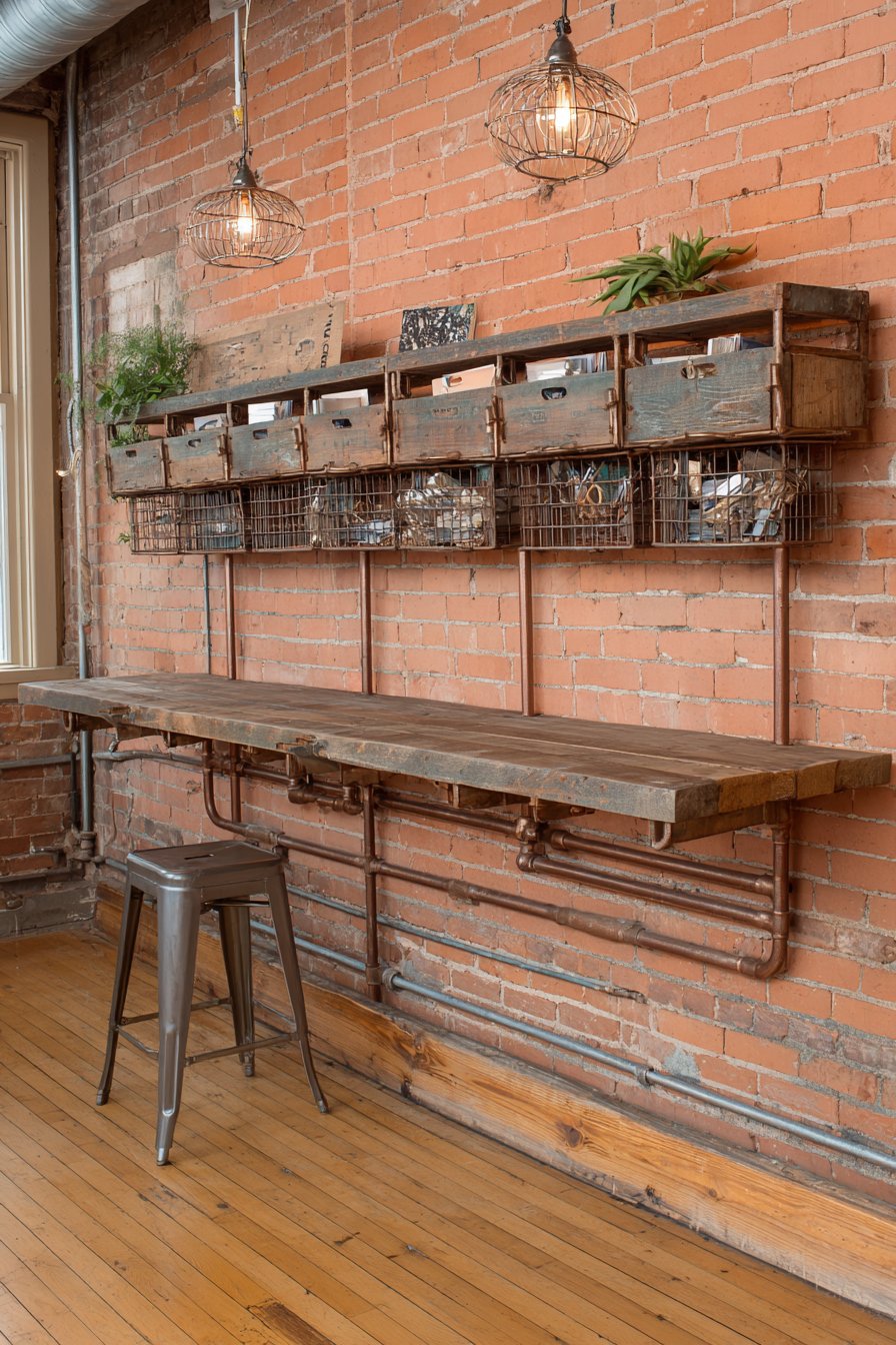 A vintage-style cage pendant light hangs nearby, its exposed bulb and metal cage construction continuing the industrial theme while providing necessary task lighting. A metal stool serves as additional surface space, its simple construction and raw metal finish maintaining the utilitarian aesthetic. This combination of brick, metal, and reclaimed wood creates the authentic industrial look that’s become so popular in loft conversions and urban homes.
