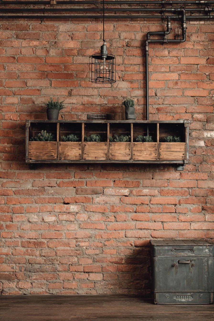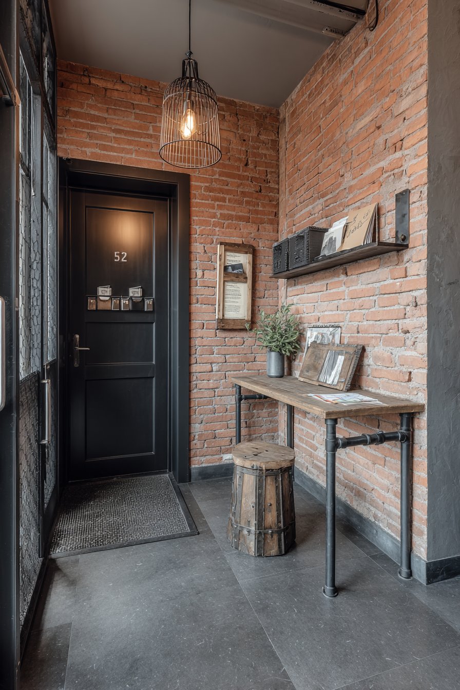 Wide-angle photography captures the raw, urban character essential to industrial design. The lighting emphasizes the brick texture—each mortar line, color variation, and surface irregularity that gives exposed brick its appeal. The metal patina on the pipe shelving and pendant light shows the age and character that make industrial materials so visually interesting. This is design for those who appreciate authenticity, who value materials with history and visible age, who want their entryway to feel like it belongs in a renovated warehouse or factory building rather than a suburban tract home.