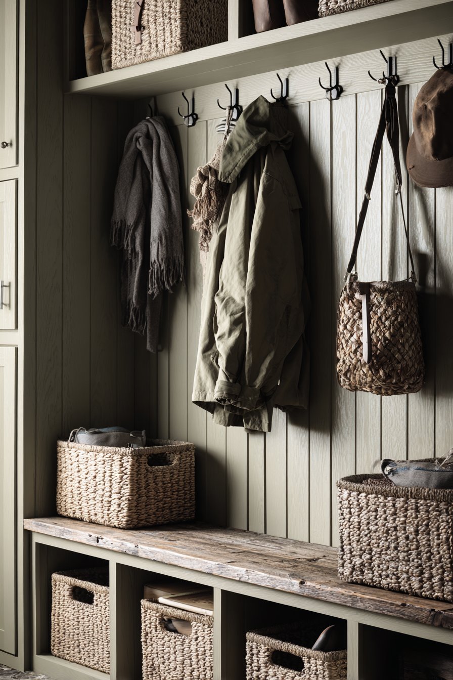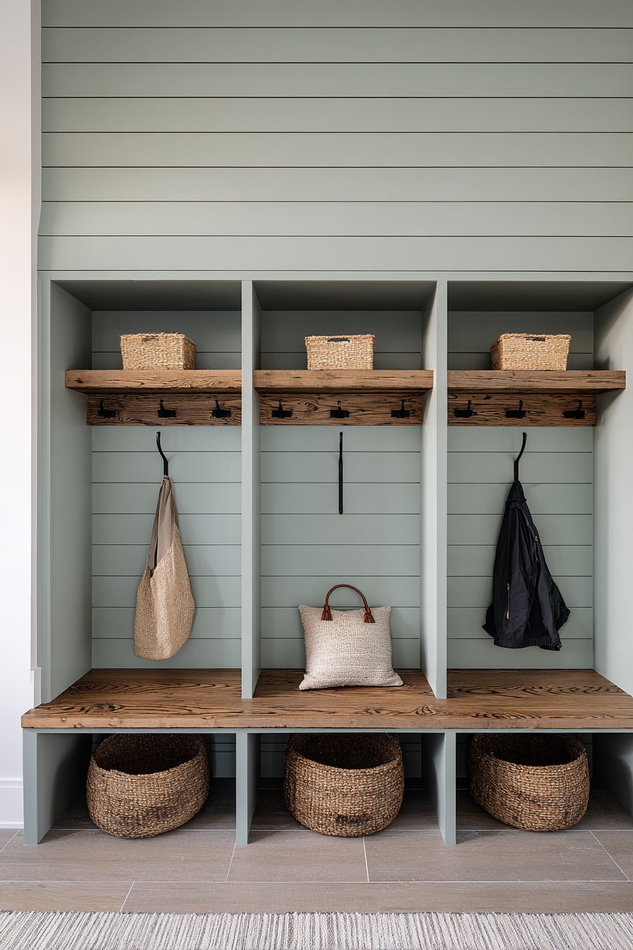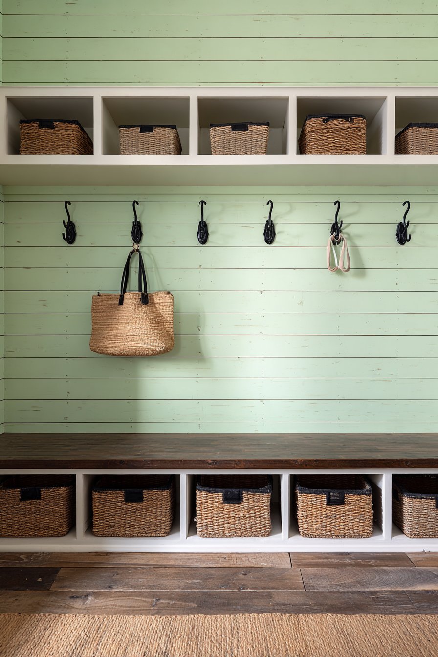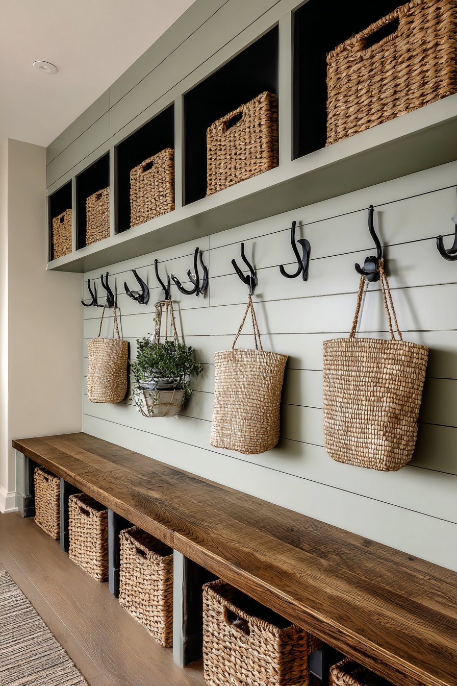 The soft sage green wall color deserves special attention for its versatility and calming effect. This shade works beautifully with the natural wood tones of the bench and the organic texture of the woven baskets, creating a cohesive palette that feels both current and timeless. The shiplap paneling adds architectural interest and texture without overwhelming the space, its horizontal lines creating a sense of width that can make even a narrow entryway feel more spacious. The matte black hardware provides crisp contrast and a modern edge that keeps the design from feeling too traditional or country-cottage sweet.