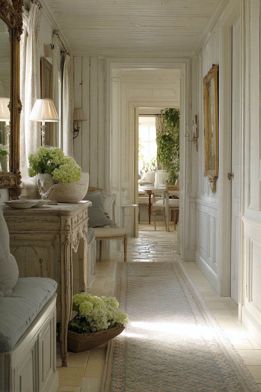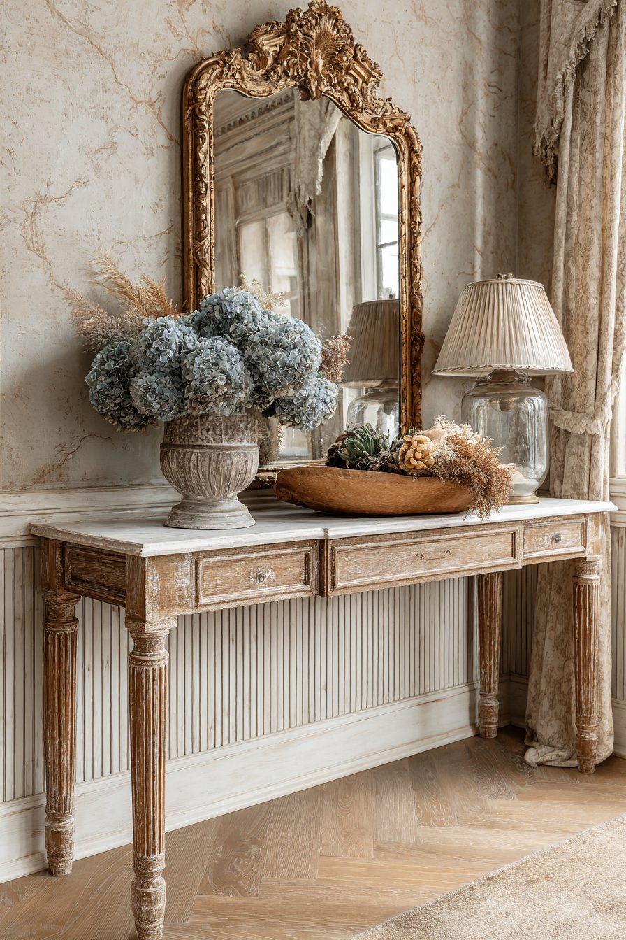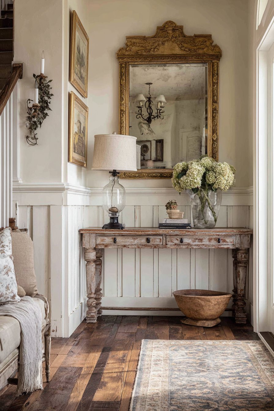 Interior photography with soft romantic lighting captures the elegant, lived-in French aesthetic and vintage material finishes. The lighting should be warm and gentle, creating the kind of soft glow you’d find in a French countryside home. The distressed wood finish, the tarnished mercury glass, the faded hydrangeas—these elements of gentle aging and patina are essential to the style and deserve photographic emphasis. This is design for those who appreciate European influences, who value comfort and elegance equally, who want their entryway to feel like it belongs in a French cottage rather than a modern suburban home.