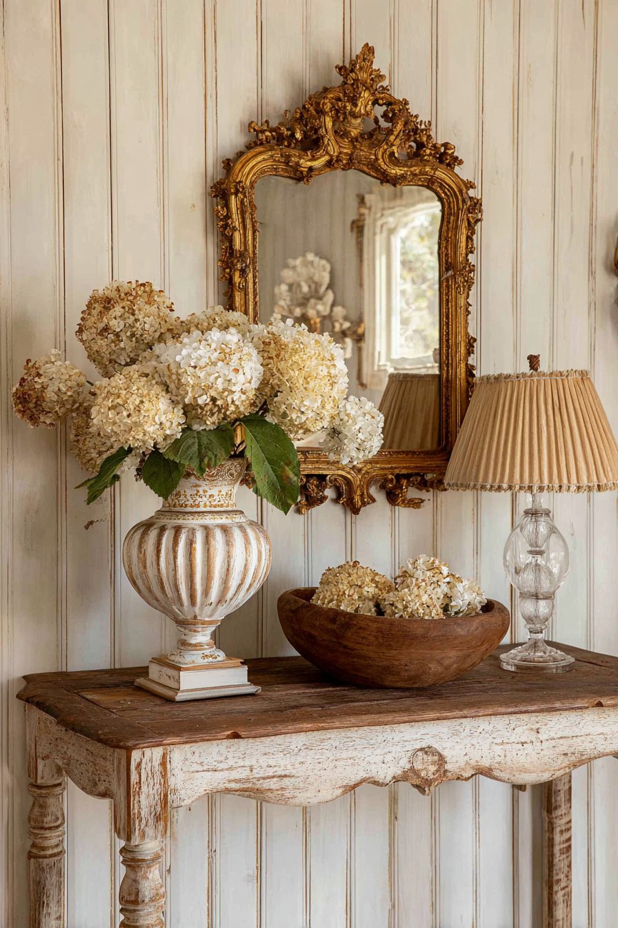 The console is styled with quintessentially French country elements: a mercury glass lamp that provides soft, romantic lighting, and a wooden dough bowl filled with preserved hydrangeas in soft, faded tones. An ornate gilt mirror hangs above, its decorative frame adding a touch of formality and elegance that balances the rustic elements. The combination of refined shapes—the cabriole legs, the ornate mirror—with rustic materials and weathered finishes creates the sophisticated-yet-comfortable aesthetic that defines French country style.