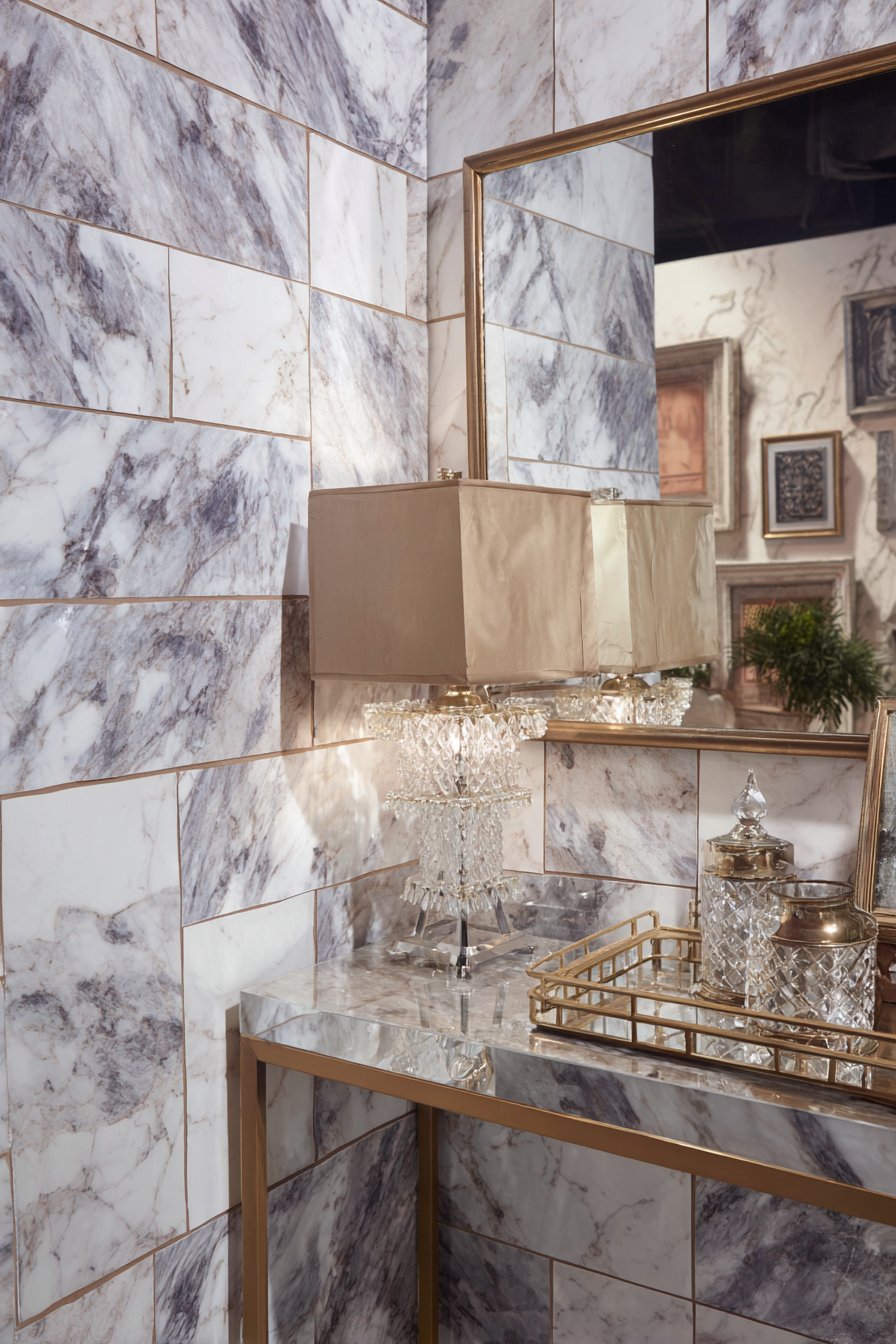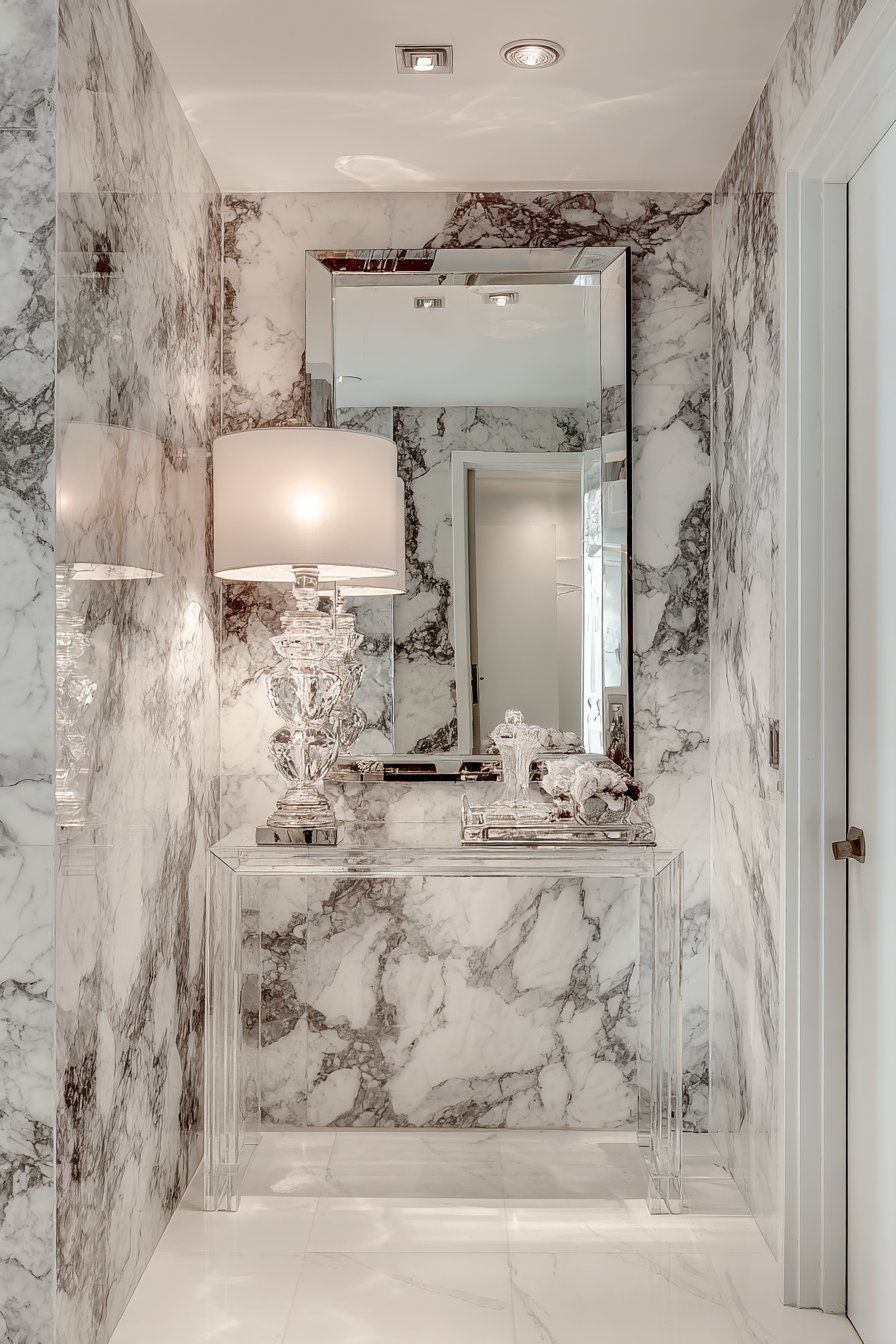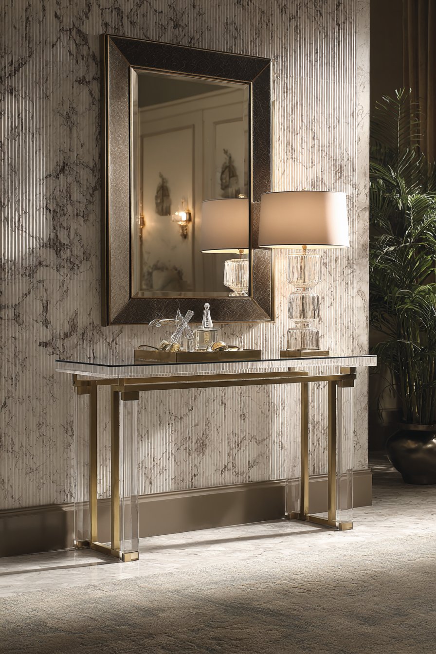 The console styling continues the luxe theme with carefully chosen accessories: a crystal table lamp that sparkles and refracts light, and a mirrored tray that adds another layer of reflection and glamour. Above, a large frameless mirror with beveled edges hangs, its reflective surface multiplying light and creating the illusion of expanded space. The combination of marble-look tile, lucite, brass, crystal, and mirror creates a symphony of reflective, luxurious surfaces that define modern glamour.