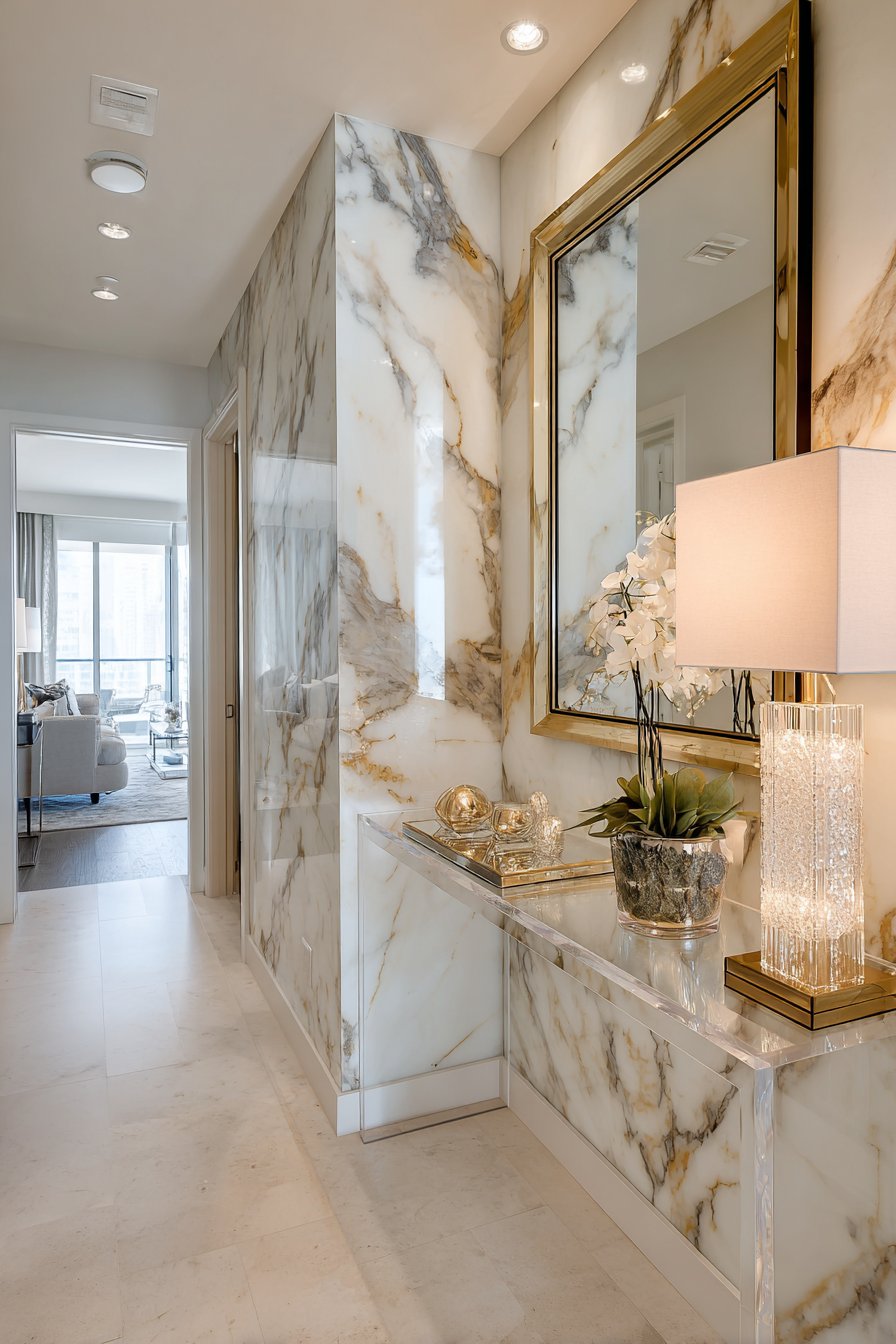 For those who appreciate luxury and contemporary style, this modern glam entryway wall idea delivers sophistication and visual impact. A marble-look porcelain tile accent wall in white with gray veining creates an instantly luxurious backdrop, the natural stone appearance adding elegance without the maintenance challenges of actual marble. Against this backdrop, a lucite console table with brass frame appears to float, its transparent acrylic panels maintaining visual lightness while the brass provides warm metallic glamour.