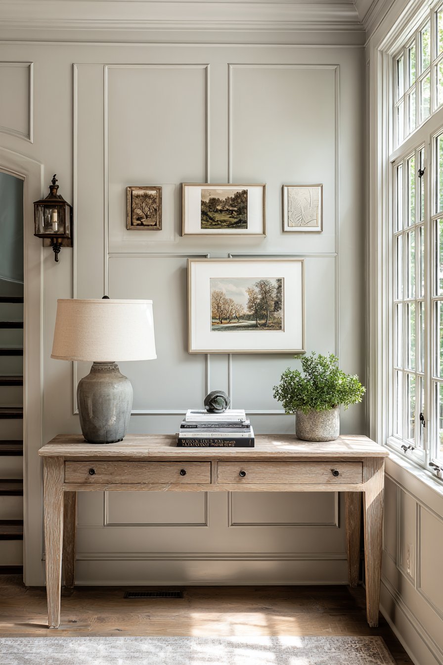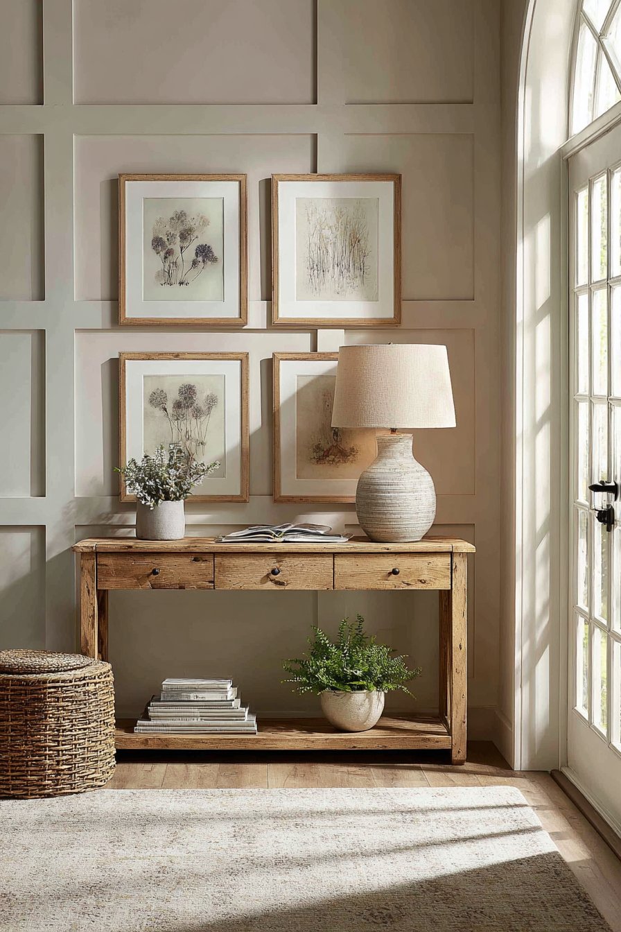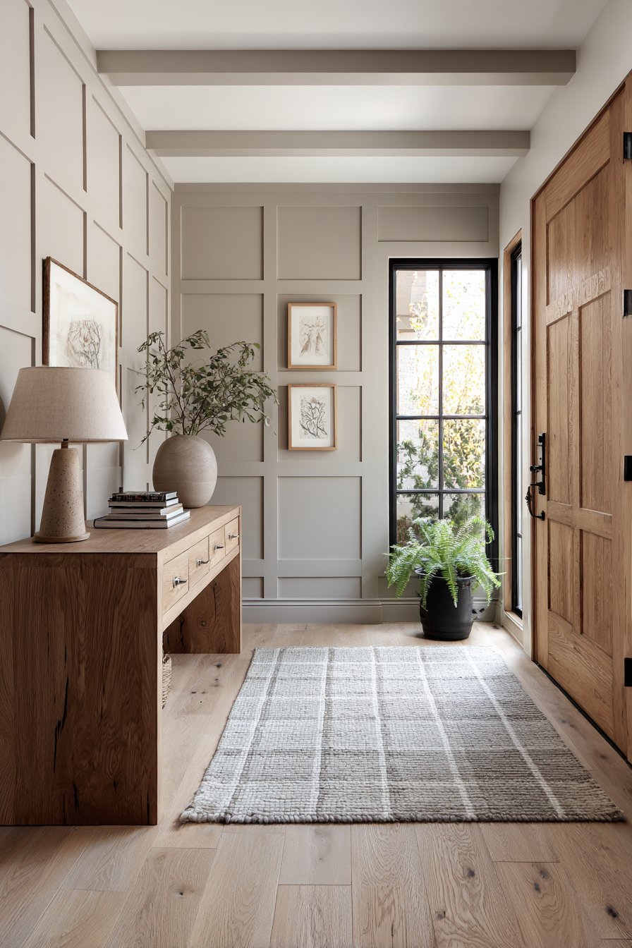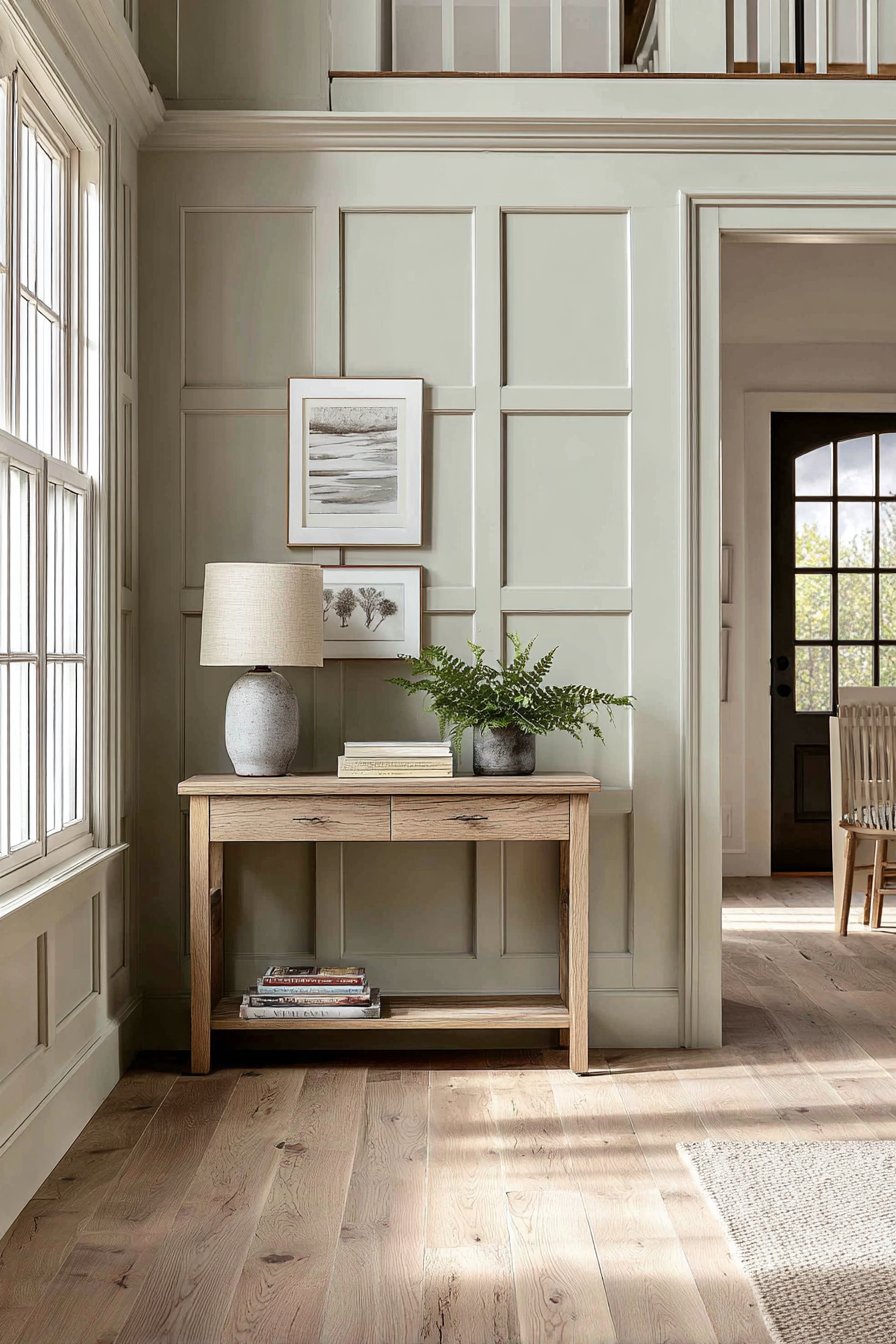 Transitional design bridges traditional and contemporary styles, and this entryway wall idea demonstrates that versatile aesthetic perfectly. Board and batten wall treatment painted in soft greige adds architectural detail that feels both classic and current—the vertical lines are traditional, but the soft greige color and simplified molding details read as contemporary. A console table in medium-toned wood with simple drawer pulls maintains the transitional balance, neither too ornate for modern tastes nor too plain for traditional preferences.