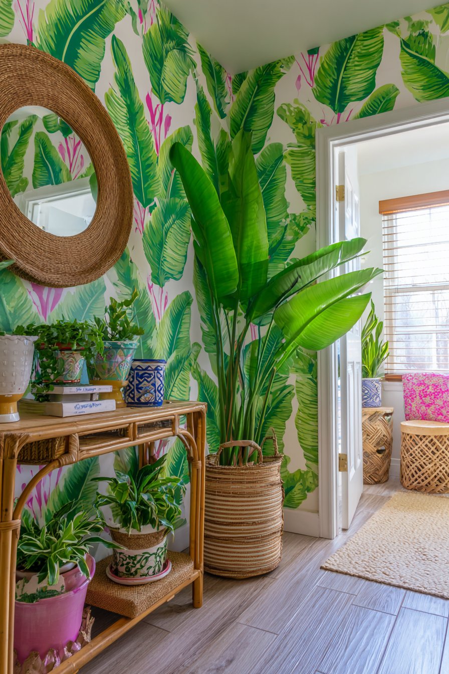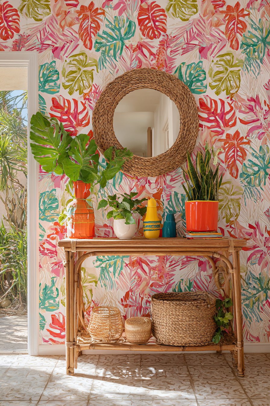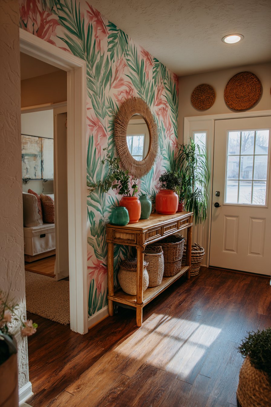 For those who embrace color, pattern, and personality, this eclectic entryway wall idea celebrates joyful self-expression. Peel-and-stick removable wallpaper featuring a bold tropical leaf pattern in greens and pinks transforms the wall into an instant focal point, the oversized botanical print adding drama and contemporary style. The removable aspect makes this a renter-friendly option that delivers maximum impact with minimal permanent commitment.