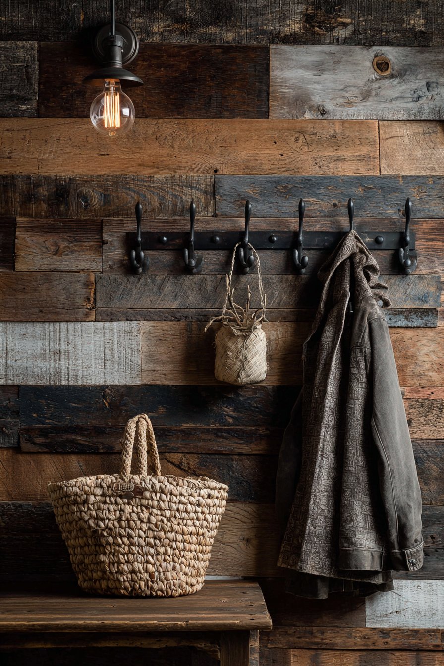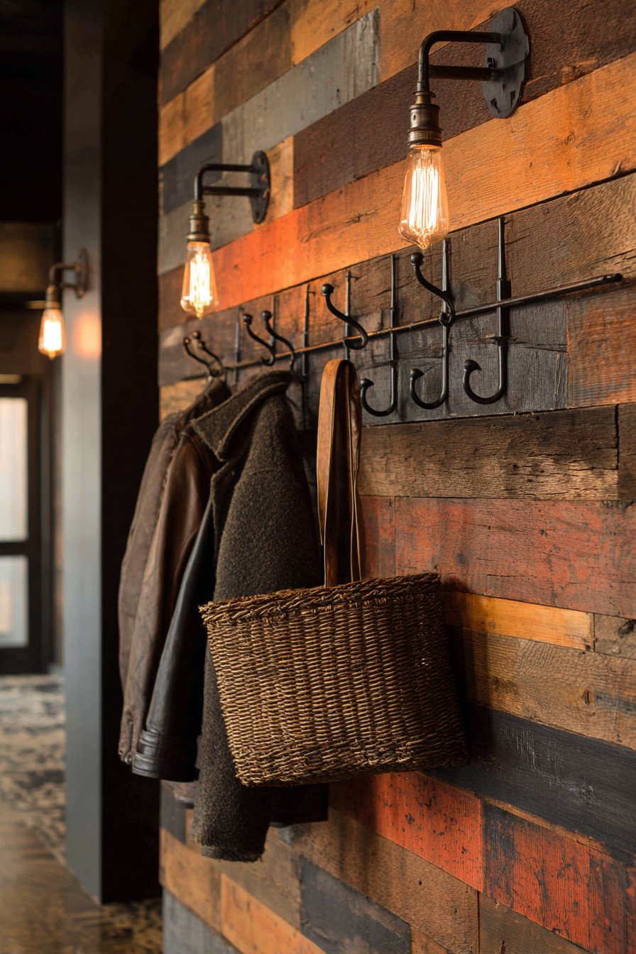 Mounted against this textured backdrop, a wrought iron coat rack with multiple hooks provides functional beauty. The industrial-style metalwork complements the rustic wood without competing with it, the dark iron finish creating visual weight and presence. The hooks hold practical items—a woven basket perfect for corralling small essentials, a seasonal jacket ready for quick departures—demonstrating how form and function can coexist seamlessly. An industrial-style Edison bulb wall sconce adds both ambient lighting and another layer of vintage-industrial charm, its exposed filament creating warm, inviting light that enhances the wood’s natural tones.