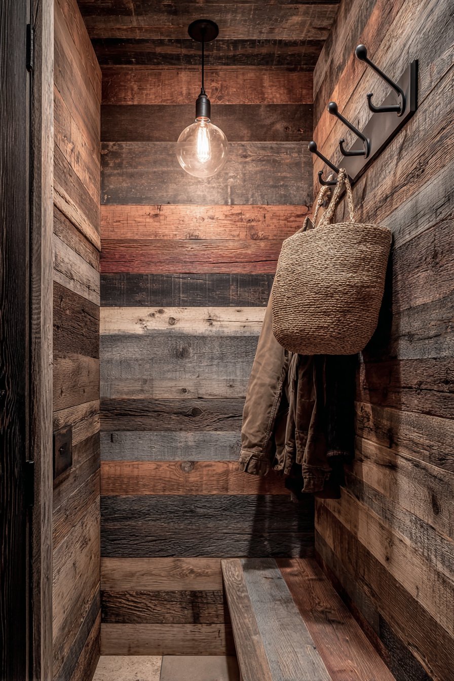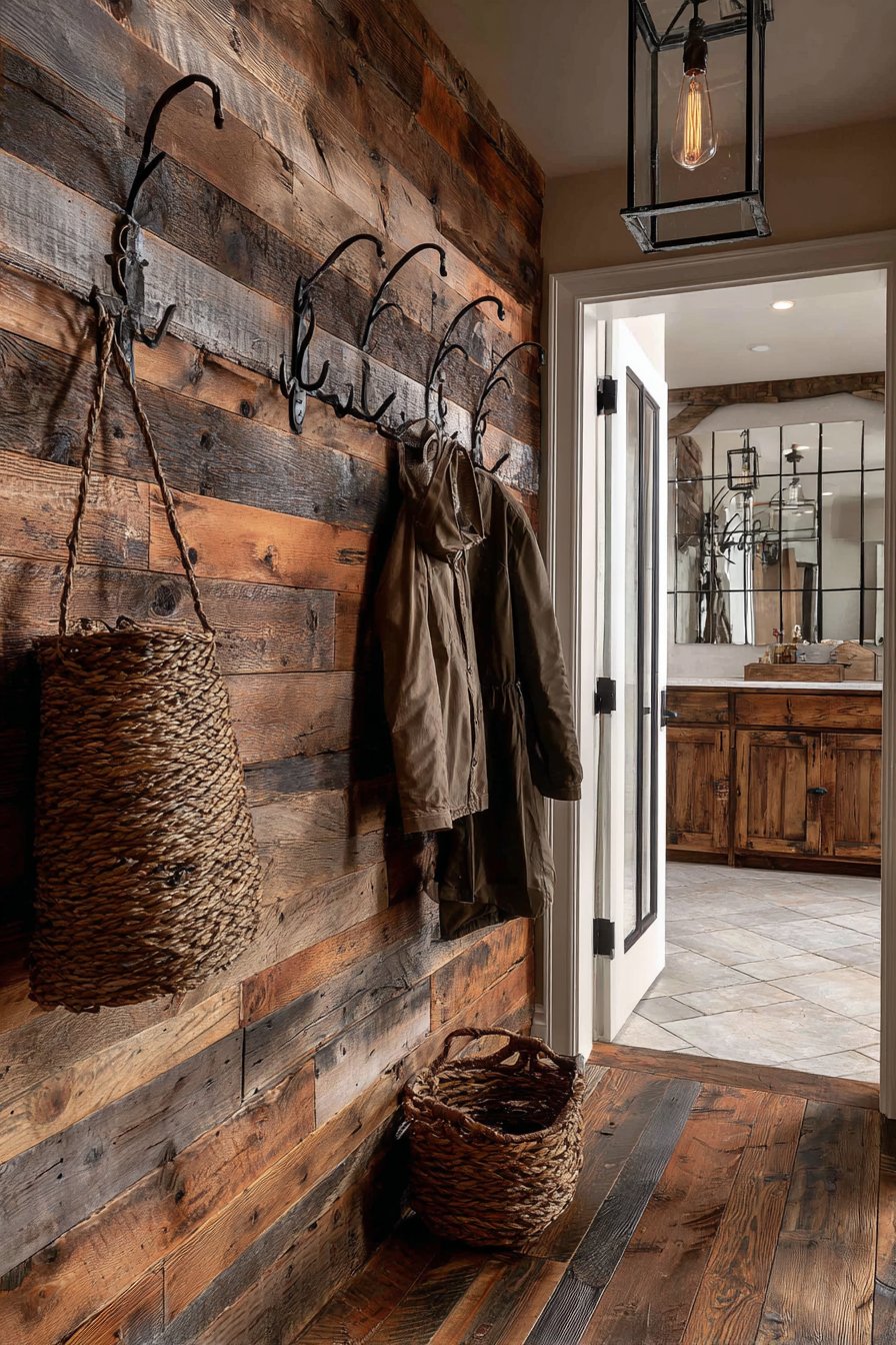 The photography of this space requires special attention to capture the rich texture and authentic character of the reclaimed wood. Professional lighting emphasizes the natural material variations, bringing out the depth of the grain and the subtle color shifts from plank to plank. The interplay of light and shadow across the uneven surface creates visual interest that changes throughout the day, ensuring the wall never looks flat or one-dimensional. This is entryway wall design for those who appreciate authenticity, who value materials with history and character, and who want their home’s first impression to convey warmth and genuineness.