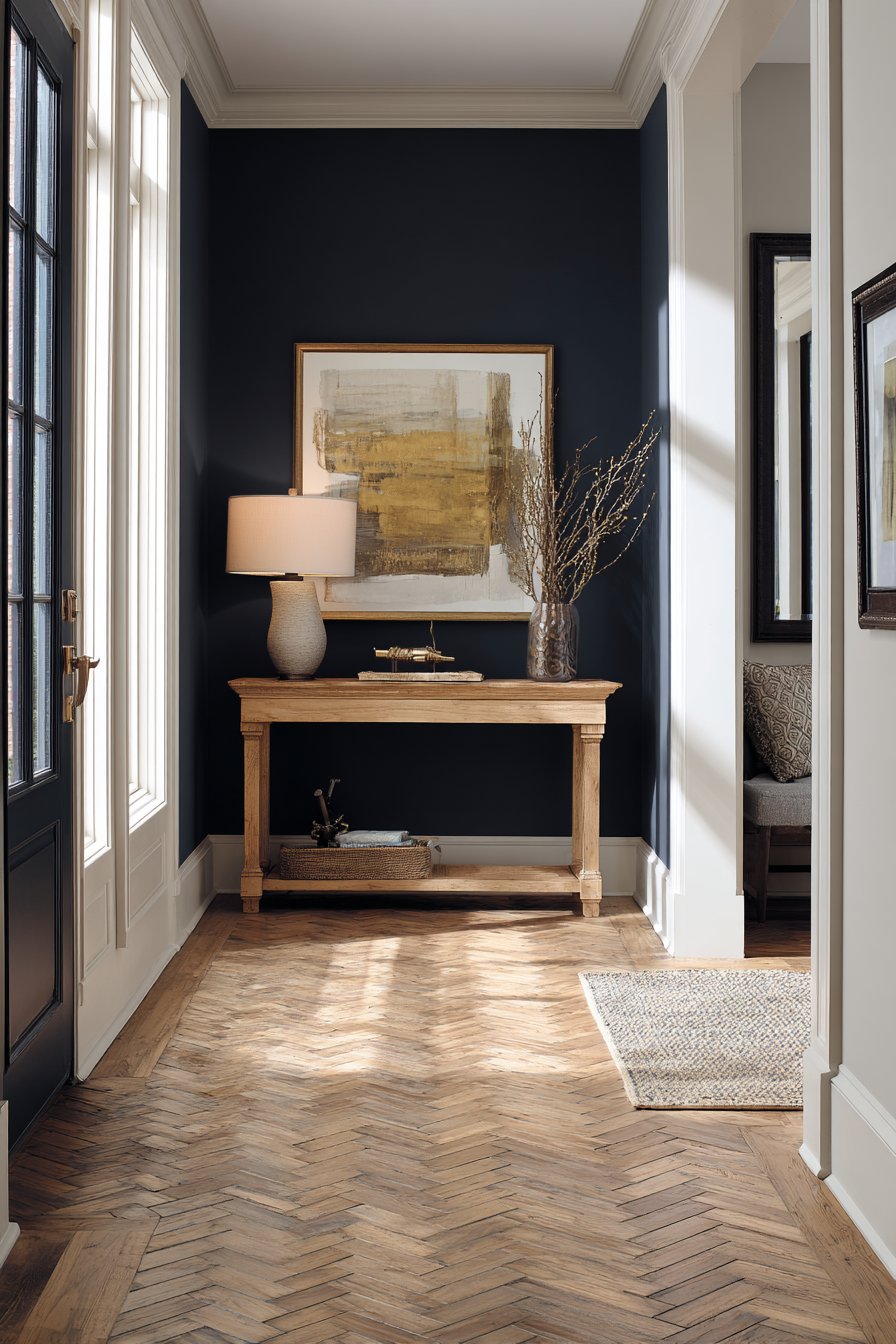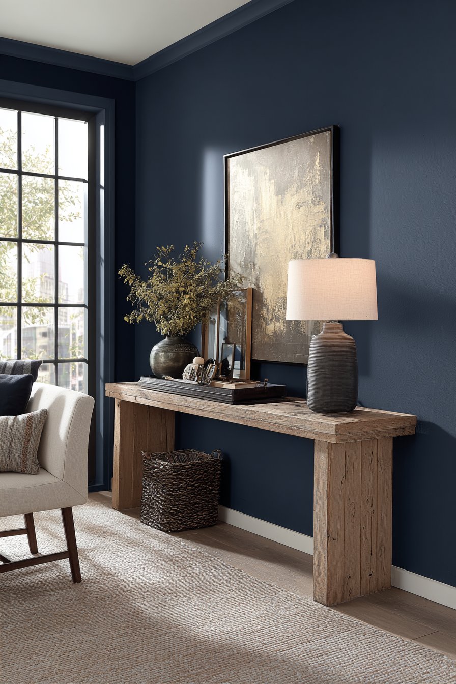 Bold color choices can transform an entryway from forgettable to unforgettable, and this design demonstrates the sophisticated impact of a deep navy blue accent wall. The rich, saturated color creates immediate drama and depth, serving as a striking backdrop for a narrow console table in light natural wood. This pairing of deep blue and natural wood is design gold—the warmth of the wood grain balances the coolness of the navy, creating a contrast that feels both modern and inviting. The console holds carefully selected items: a table lamp with a neutral linen shade that provides soft lighting, a decorative tray for corralling keys and everyday essentials, and a small framed mirror leaning casually against the wall with intentional informality.