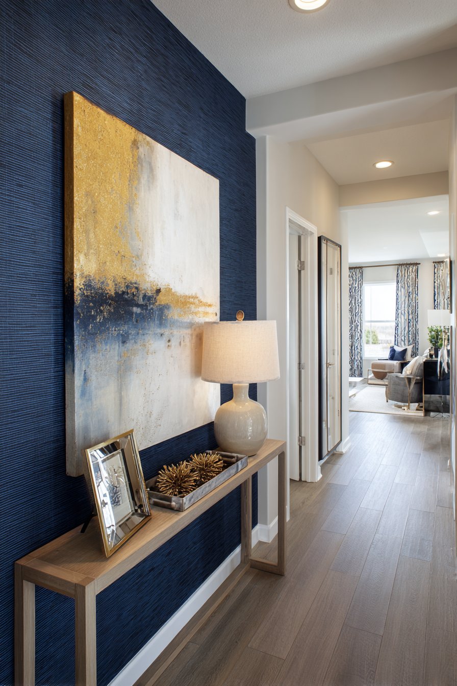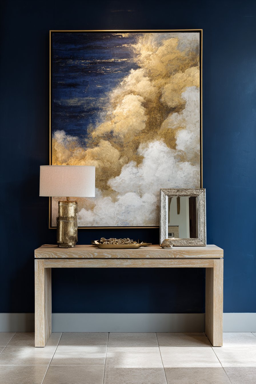 Above the console, a large abstract canvas featuring gold and navy tones serves as the focal point, its generous size making a bold statement that anchors the entire composition. The artwork picks up the wall color while introducing metallic gold accents that add a layer of luxury and visual warmth. This repetition of the navy blue in both the wall and the artwork creates cohesion, while the gold tones tie to the warm wood of the console, demonstrating how thoughtful color coordination elevates design from good to exceptional.