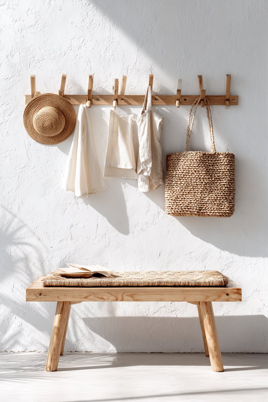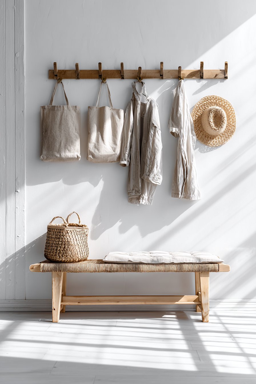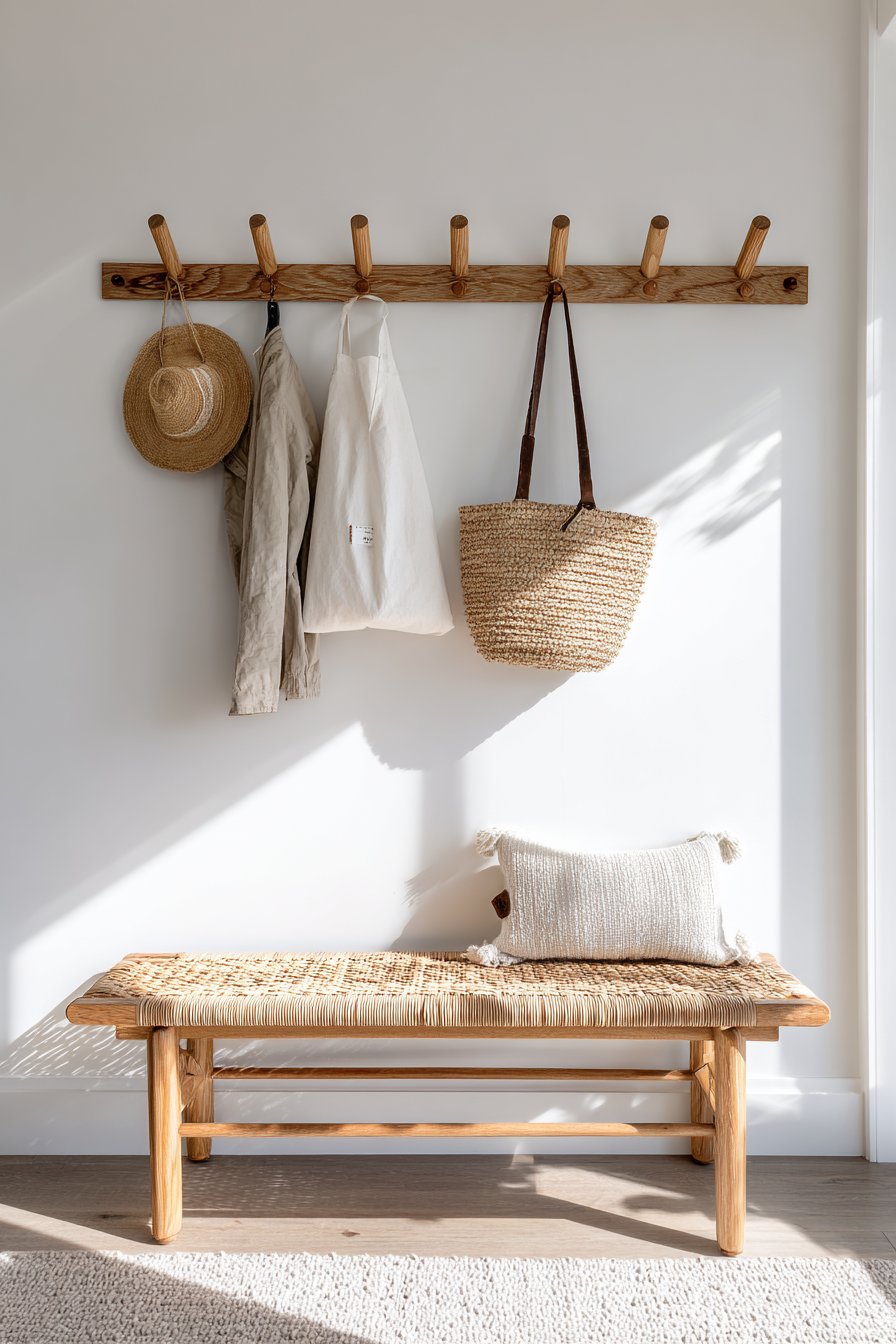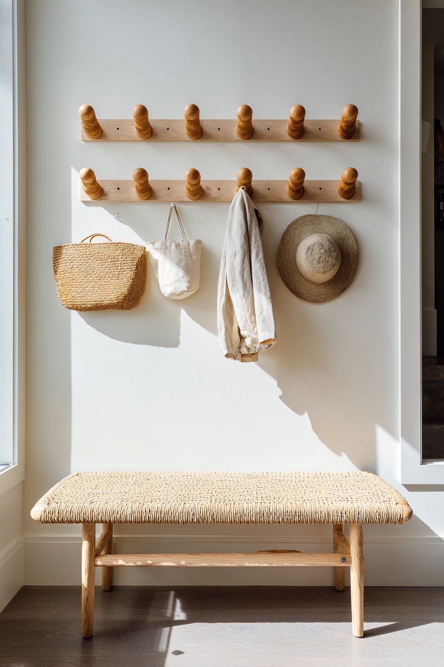 Scandinavian design principles—simplicity, functionality, natural materials, and light—come together beautifully in this peg rail entryway wall idea. The wooden pegs mounted on a pristine white wall at varying heights create a display that’s both practical and aesthetically pleasing, embodying the Scandinavian philosophy that everyday objects can and should be beautiful. Simple canvas tote bags, a woven straw hat, and a light jacket hang from the pegs, their natural materials and neutral colors contributing to the overall sense of calm and order. Below, a low wooden bench with elegant hairpin legs and a woven seat cushion provides a place to sit while maintaining the light, airy aesthetic.