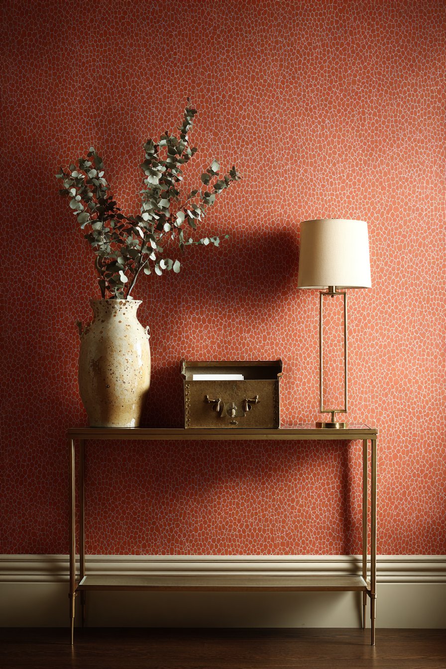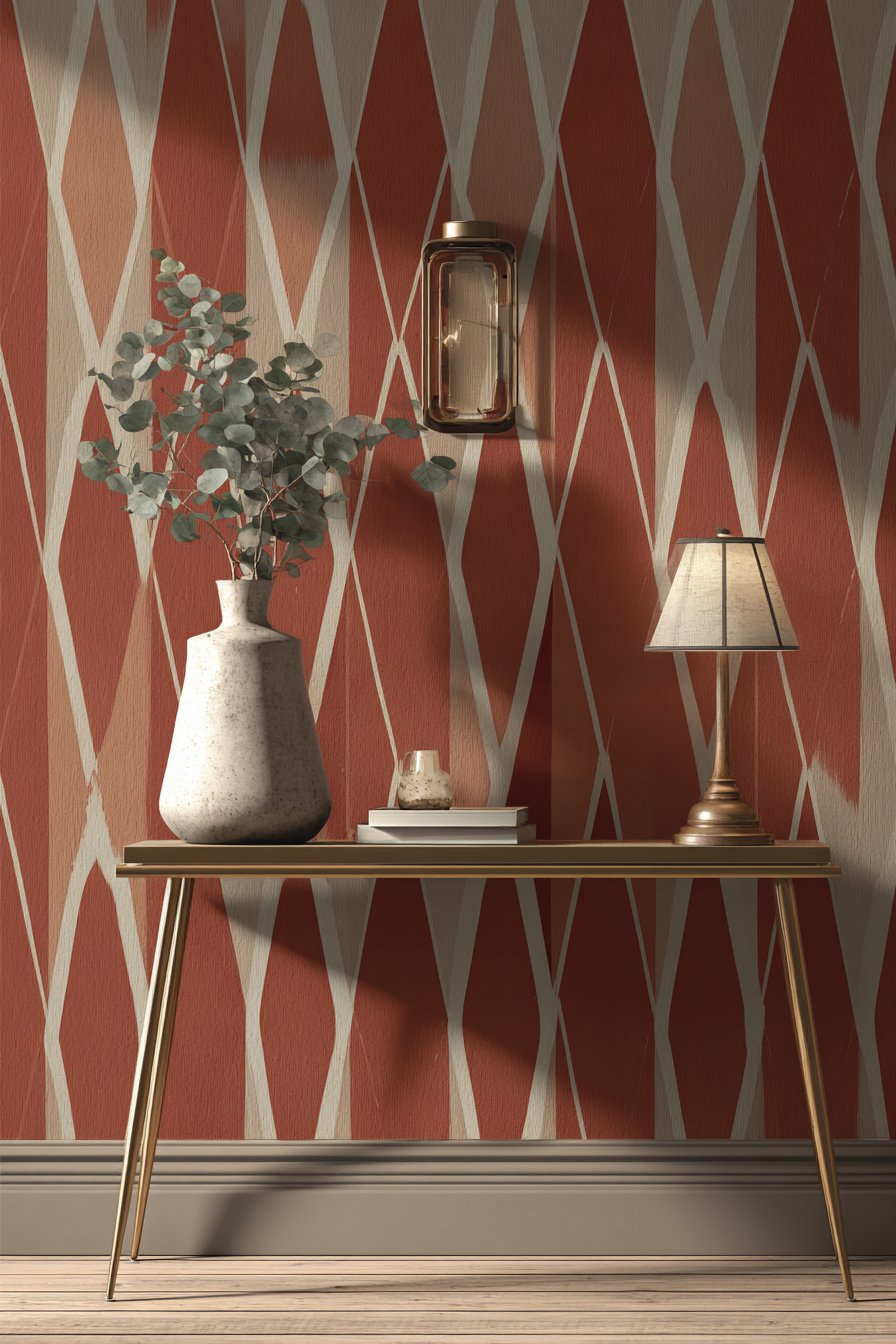 Interior design photography captures both the pattern detail and the warm color scheme, requiring balanced exposure that doesn’t blow out the lighter cream tones while maintaining the richness of the terracotta. The styling of the console demonstrates how to accessorize a patterned wall—keeping accessories simple and minimal allows the wallpaper to shine while preventing visual chaos. The eucalyptus branches add organic movement and natural color that complements rather than competes with the geometric pattern, while the brass mail organizer proves that practical additions can also be beautiful.