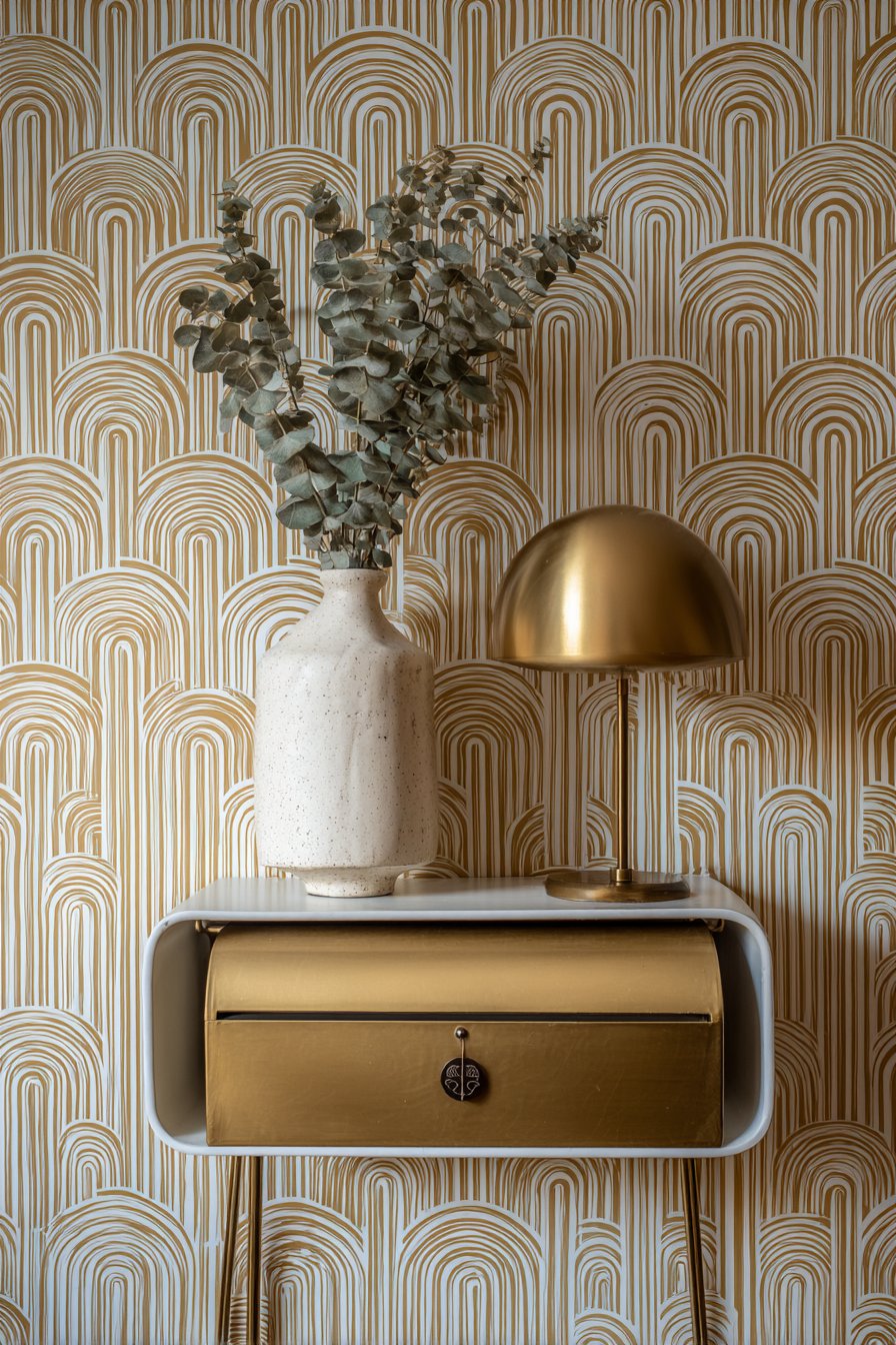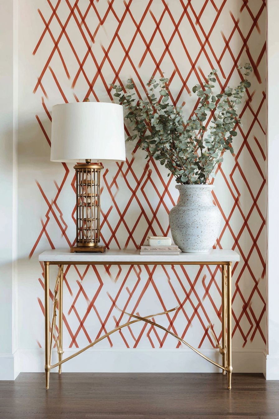 The choice of muted terracotta rather than bright, saturated colors is key to this design’s success. The warm, earthy tone feels inviting rather than aggressive, while the cream creates breathing room within the pattern. The geometric design adds modern edge and personality, transforming a simple entryway wall into a design feature that makes a statement about the homeowner’s confidence and style. A decorative wall-mounted mail organizer in brass finish adds functional detail while picking up the gold tones of the console legs, creating subtle metallic accents that add a touch of glamour.