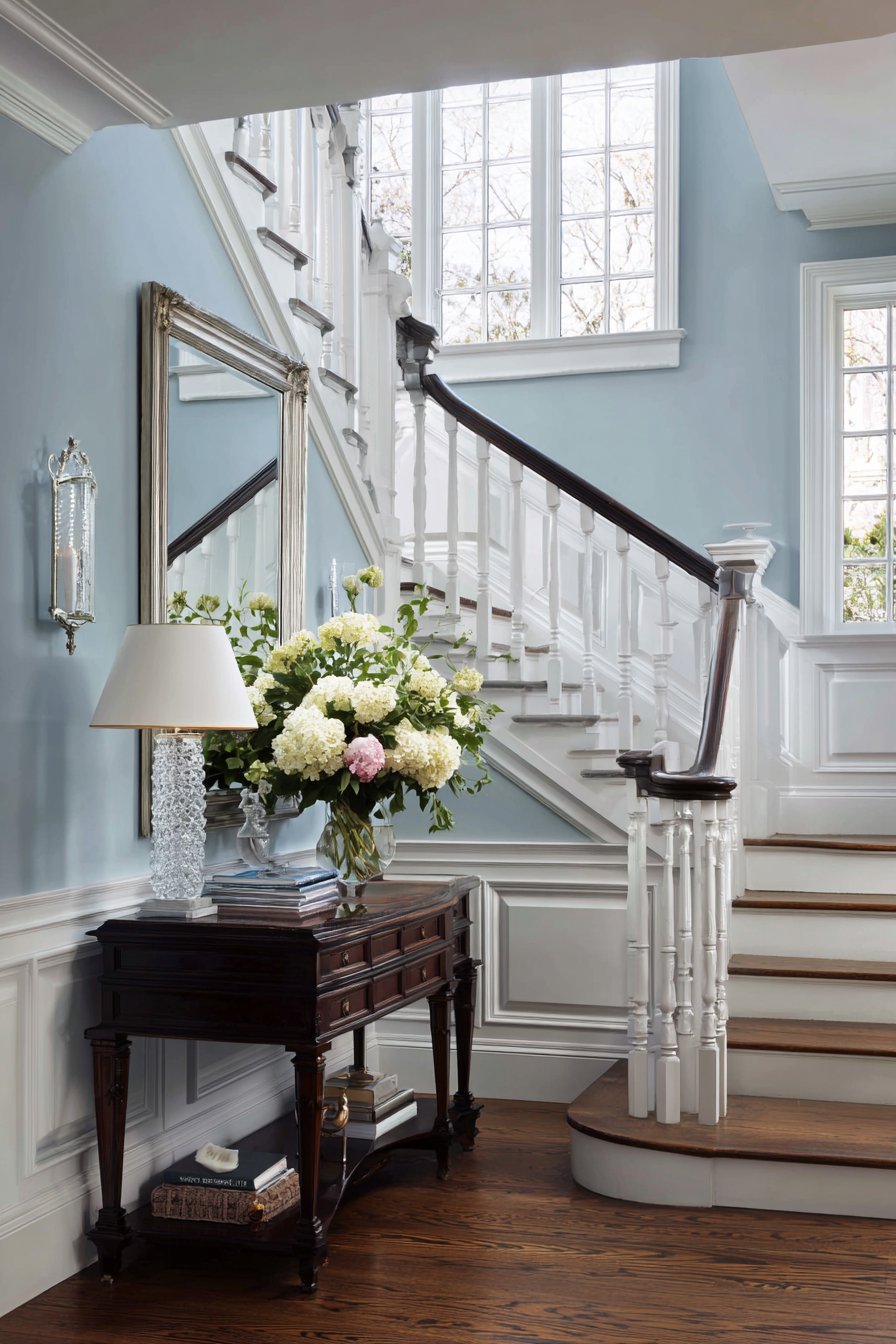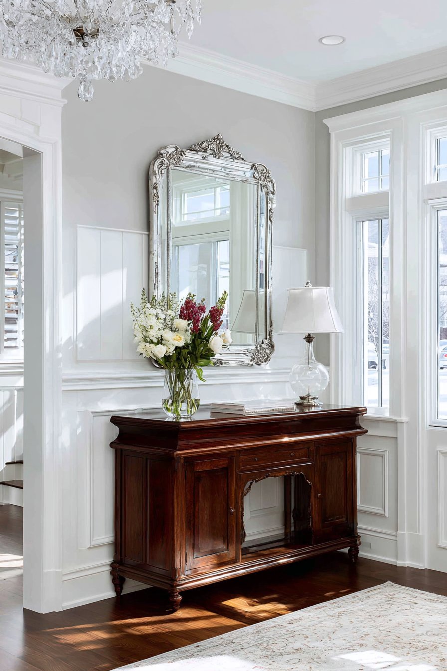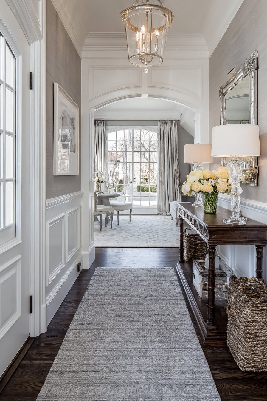 Below the wainscoting, a traditional console table in dark wood provides rich contrast to the white millwork. The wood’s deep tone grounds the design and adds warmth, preventing the white and gray color scheme from feeling cold or sterile. Above the console, a silver-framed mirror hangs at the perfect height for functionality, its frame finish introducing another metallic element that adds subtle glamour. The console is elegantly styled with a crystal table lamp and fresh flowers, accessories that enhance the refined traditional aesthetic without appearing stuffy or overly formal.
