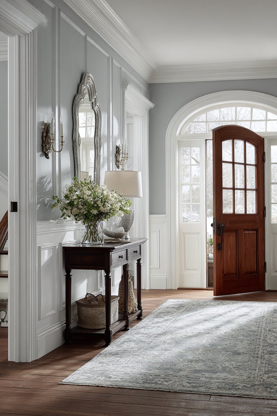 Traditional architectural details like wainscoting bring timeless elegance to entryway walls, and this design showcases how classic elements can create sophisticated first impressions. The raised panel molding covers the lower two-thirds of the wall, painted in crisp white that emphasizes the dimensional detail and craftsmanship. A chair rail provides the transition point to the upper wall, which features soft gray paint—a combination that feels both traditional and current. This two-tone approach adds visual interest and architectural substance to even basic walls, creating the impression of quality and attention to detail.