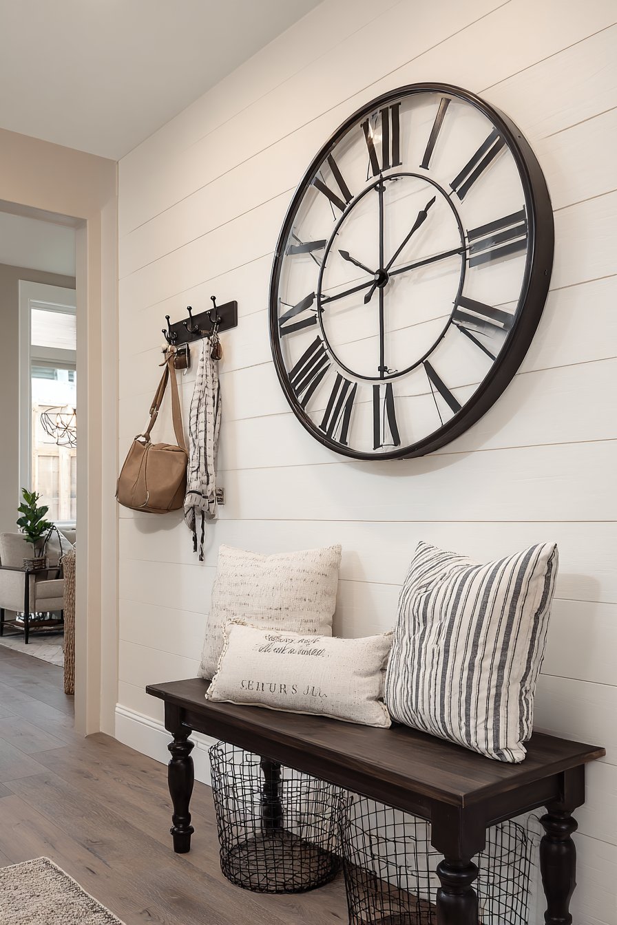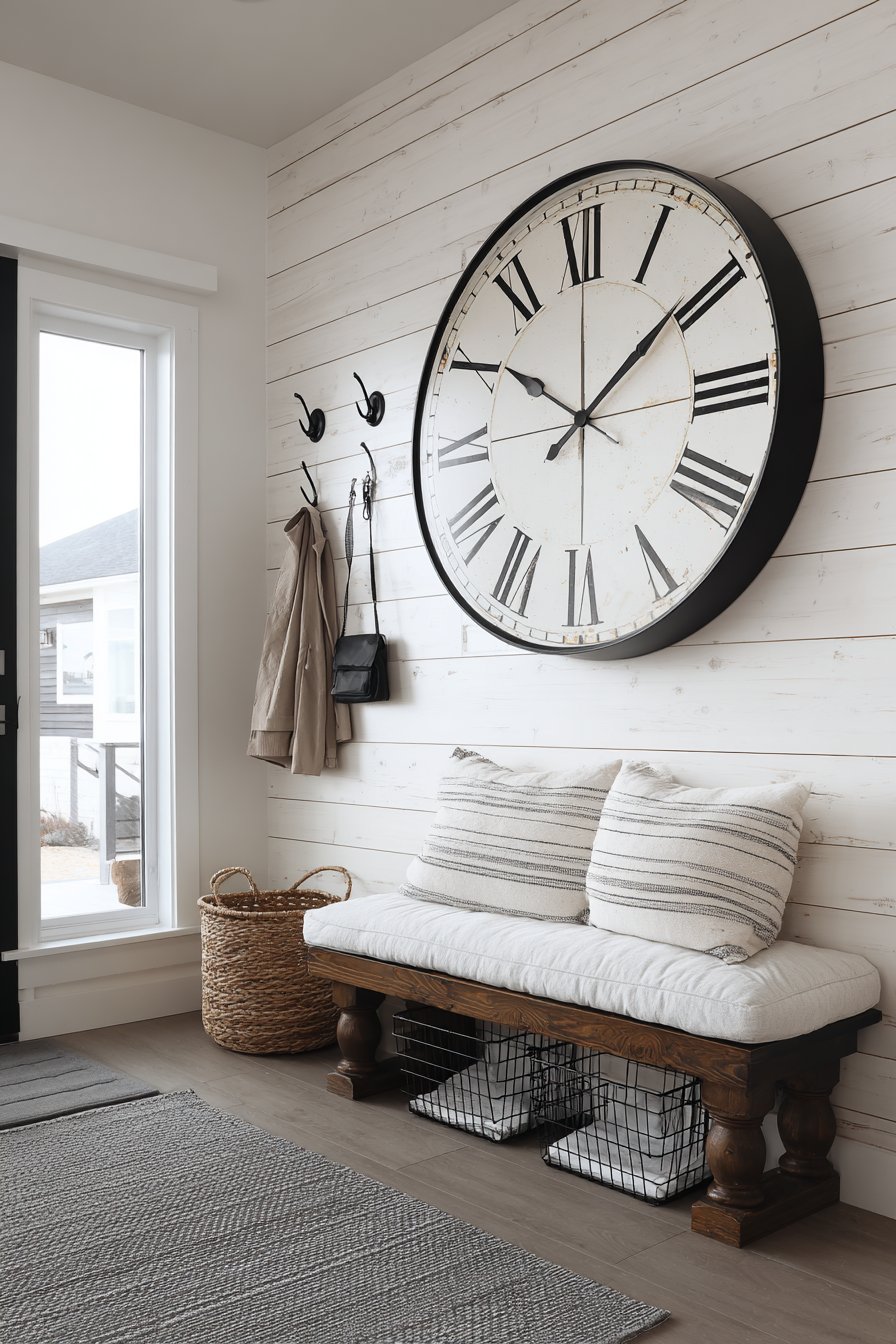 The modern farmhouse style continues its reign as one of the most popular design aesthetics, and this shiplap entryway wall idea demonstrates why. The white-washed shiplap finish creates subtle texture and horizontal lines that add architectural interest without overwhelming the space. The large vintage-inspired clock serves as the focal point, its oversized proportions and distressed finish adding character and practical functionality—no more fumbling for your phone to check the time as you head out the door. Below, a bench with turned legs and a cushion in classic ticking stripe fabric provides comfortable seating that balances the rustic wall treatment.