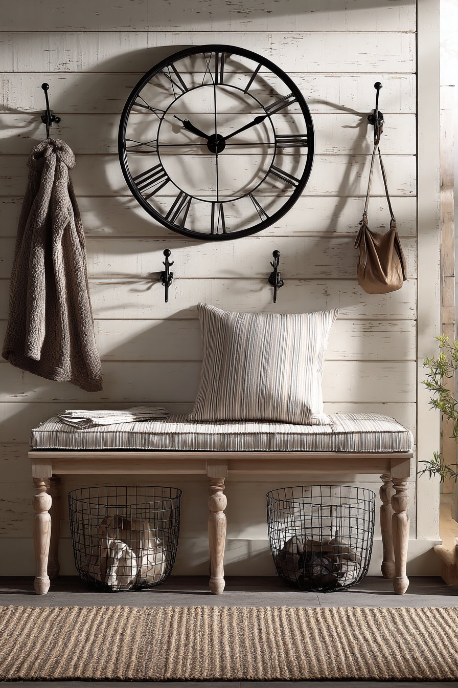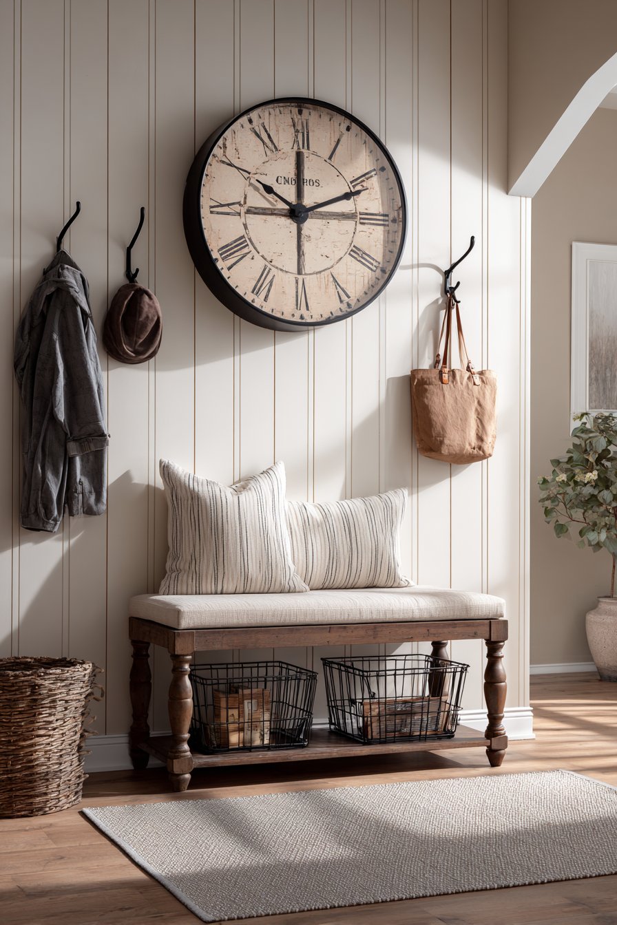 Wire baskets tucked underneath the bench offer practical storage that looks intentional rather than afterthought. They’re perfect for shoes, pet supplies, or seasonal items that need to be accessible but hidden from view. Black metal hooks mounted beside the clock create designated spots for keys and small bags, their simple industrial style complementing the farmhouse aesthetic without competing with it. This combination of rustic charm and modern functionality is the hallmark of successful modern farmhouse design—spaces that feel warm and collected while serving the practical needs of contemporary life.