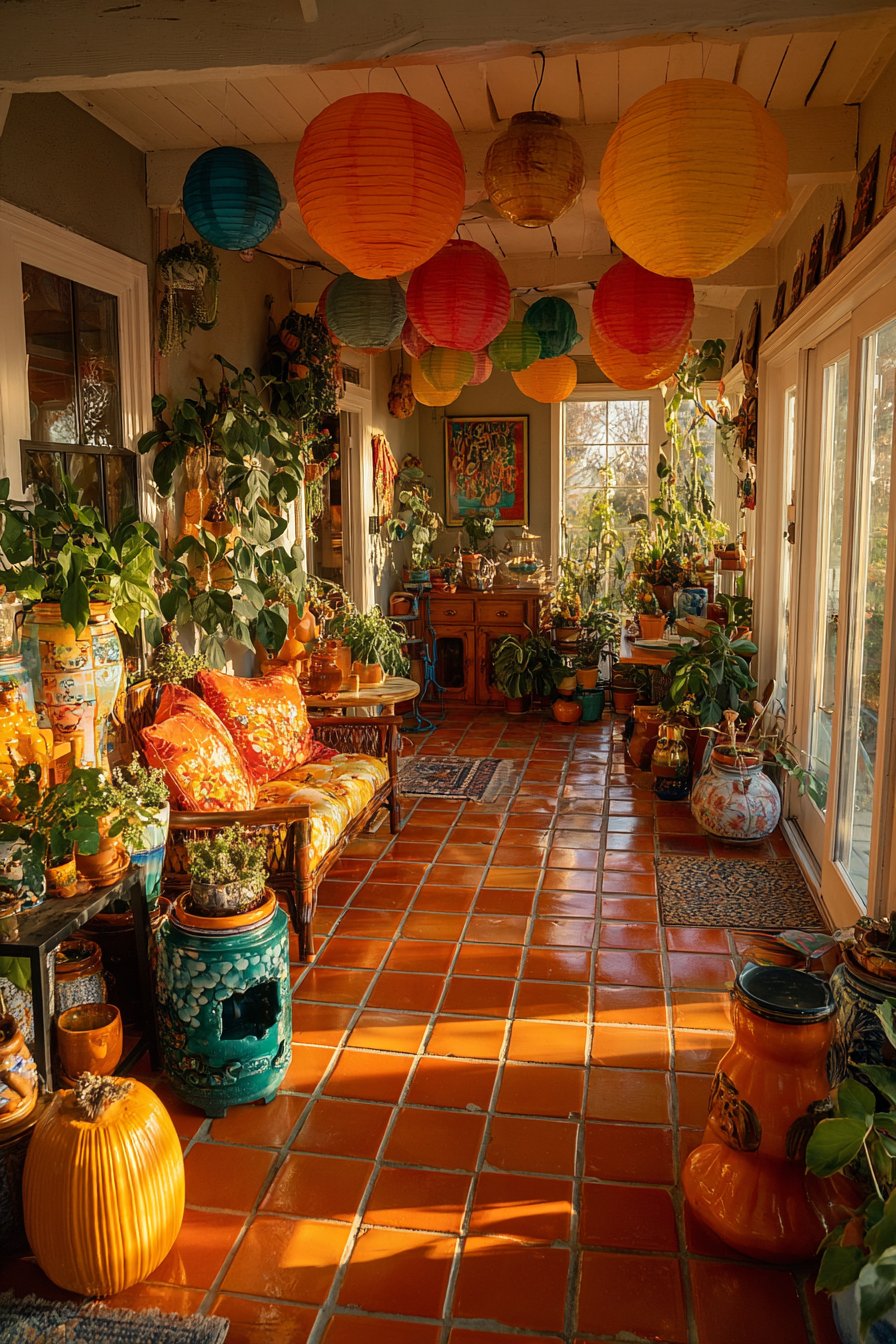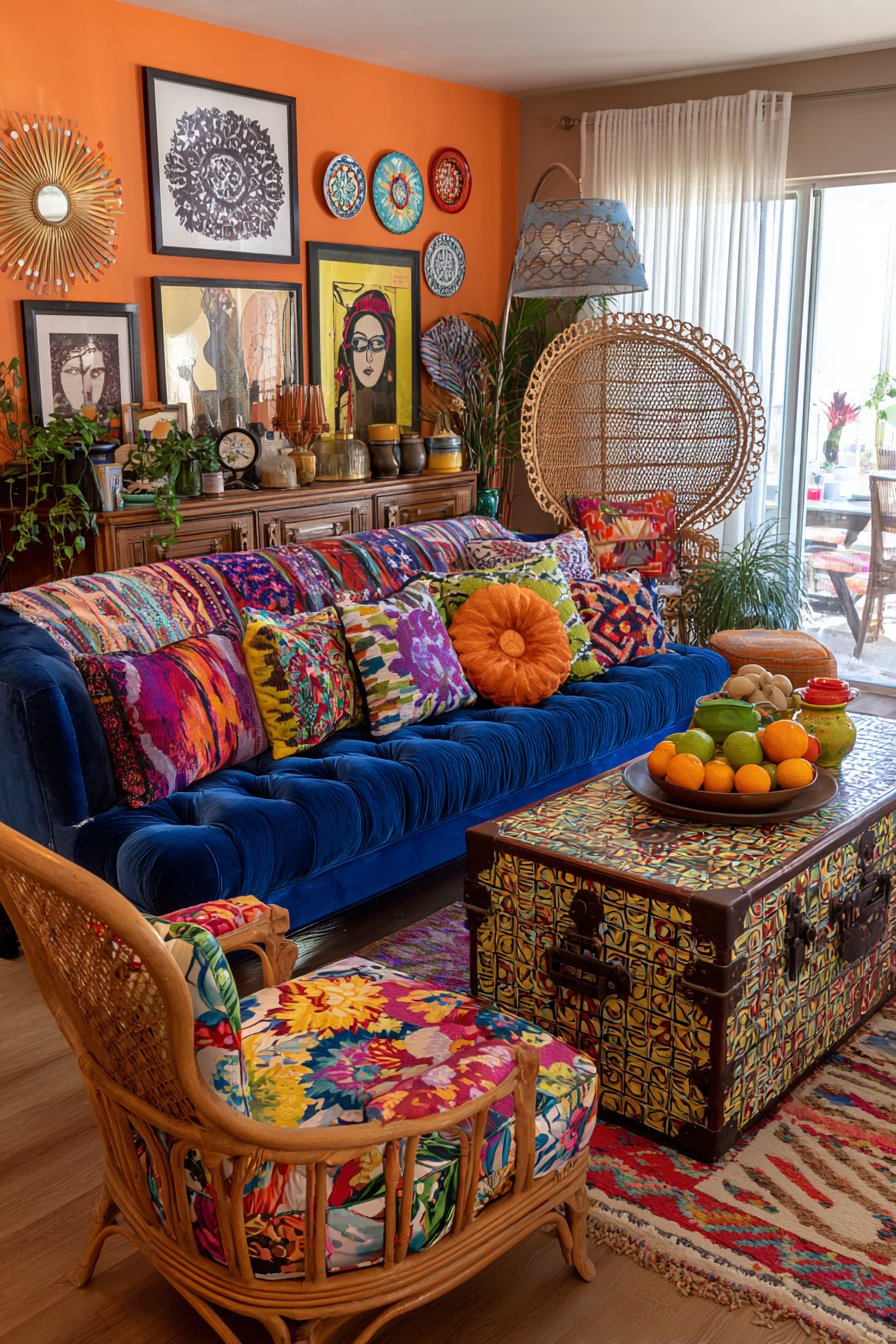 Macramé plant hangers suspended at varying heights hold trailing pothos plants, their cascading green vines adding organic movement and softening the room’s geometric patterns. The interior design photography captures soft morning light filtering through sheer curtains, illuminating the textural variety—the smooth brass, the nubby embroidery, the woven kilim, the ceramic glazes—and creating a sanctuary that feels simultaneously energizing and deeply restful. This space demonstrates how a cohesive color story can unite diverse patterns and origins.