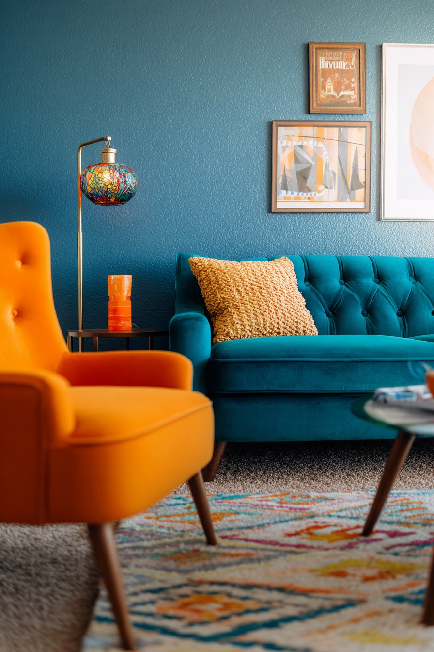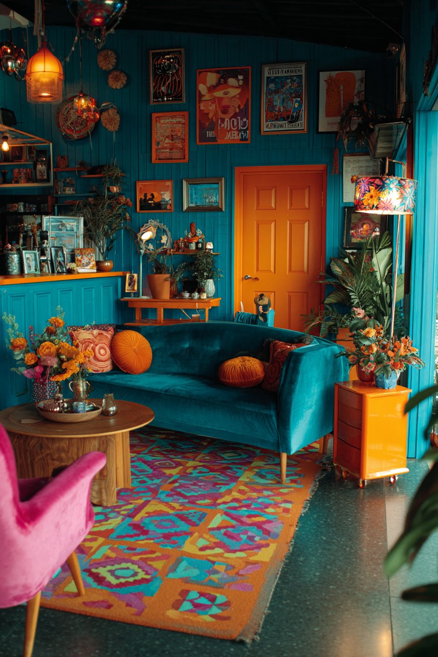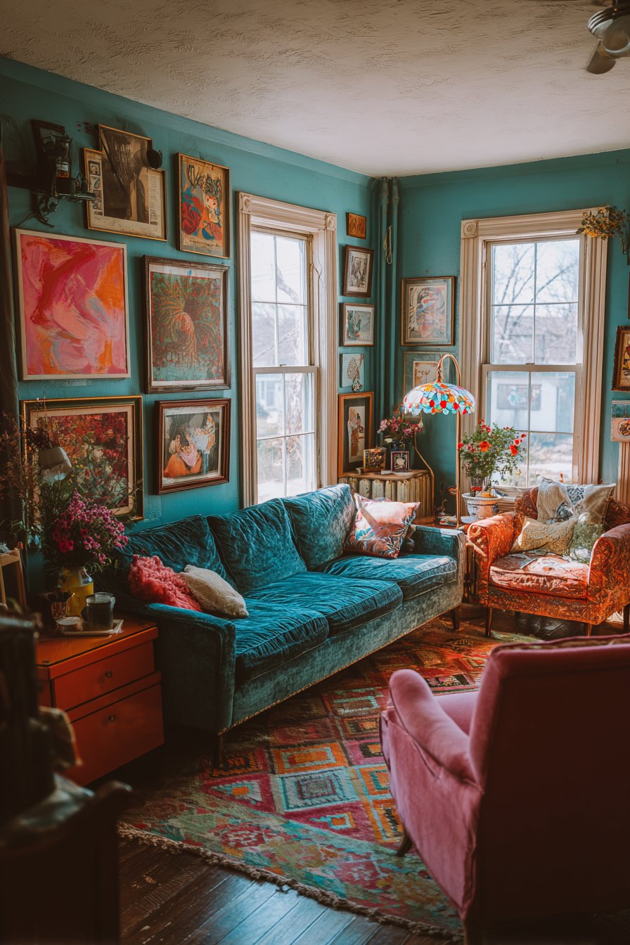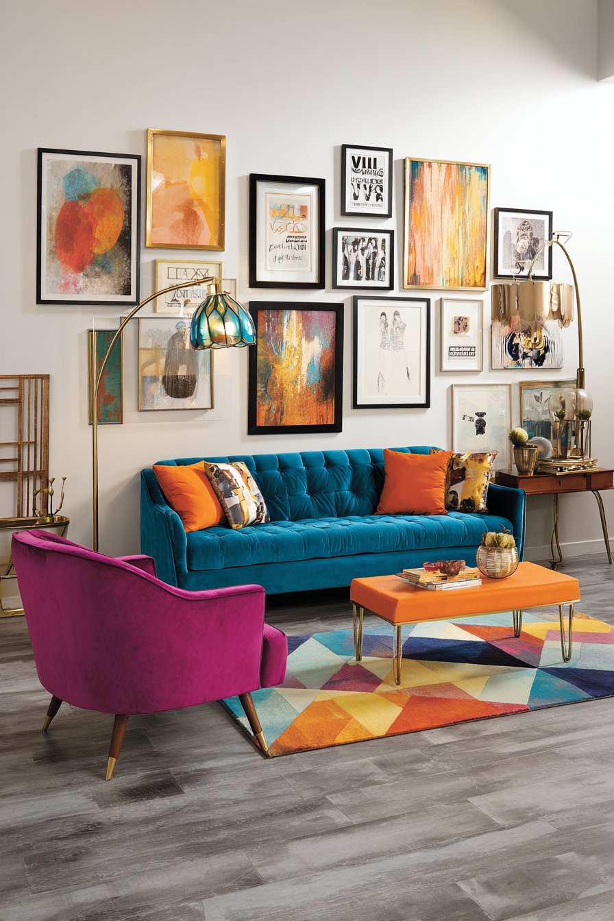 Step into a living room where color takes center stage with unabashed confidence, featuring a stunning teal velvet sofa that anchors the space with luxurious texture and saturated hue. This showstopper is beautifully contrasted by a hot pink vintage armchair positioned at an angle, creating dynamic visual tension and inviting conversation. An orange mid-century modern side table completes this fearless color trio, proving that bold hues from different families can coexist harmoniously when balanced with intention. The walls serve as a curated gallery, displaying mismatched frames in various sizes, styles, and finishes—from sleek modern black frames to ornate vintage gold—containing everything from abstract contemporary art to vintage travel posters and cherished family photographs.