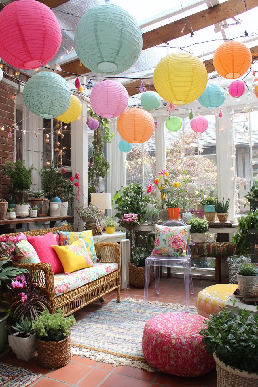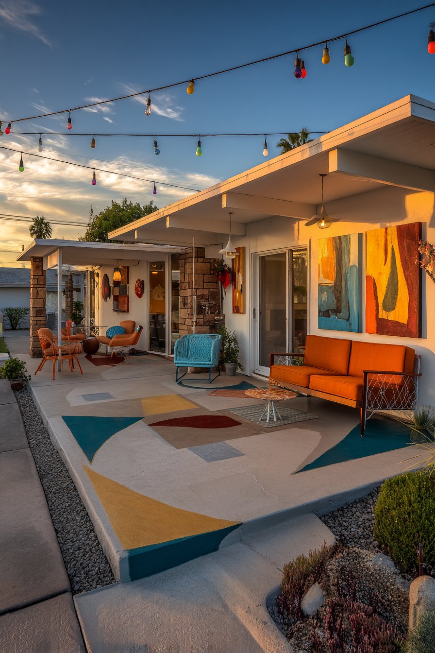 String lights with large colorful bulbs overhead transform the patio into magical evening space, their warm glow creating ambiance for outdoor dining and conversation while the colored bulbs—perhaps in red, orange, yellow, green, and blue—add playful character that feels festive without being juvenile. Wide-angle photography captures the space during golden hour, that magical time just before sunset when natural light takes on warm, honey-colored tones that make everything look beautiful. This lighting shows the cohesive outdoor room where furniture diversity creates energy rather than chaos, where bold colors feel appropriate in the outdoor context, and where the eclectic aesthetic extends seamlessly from indoor spaces to outdoor living areas, proving that personal style knows no boundaries.