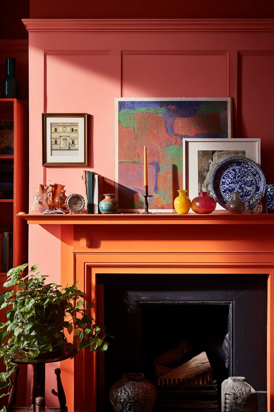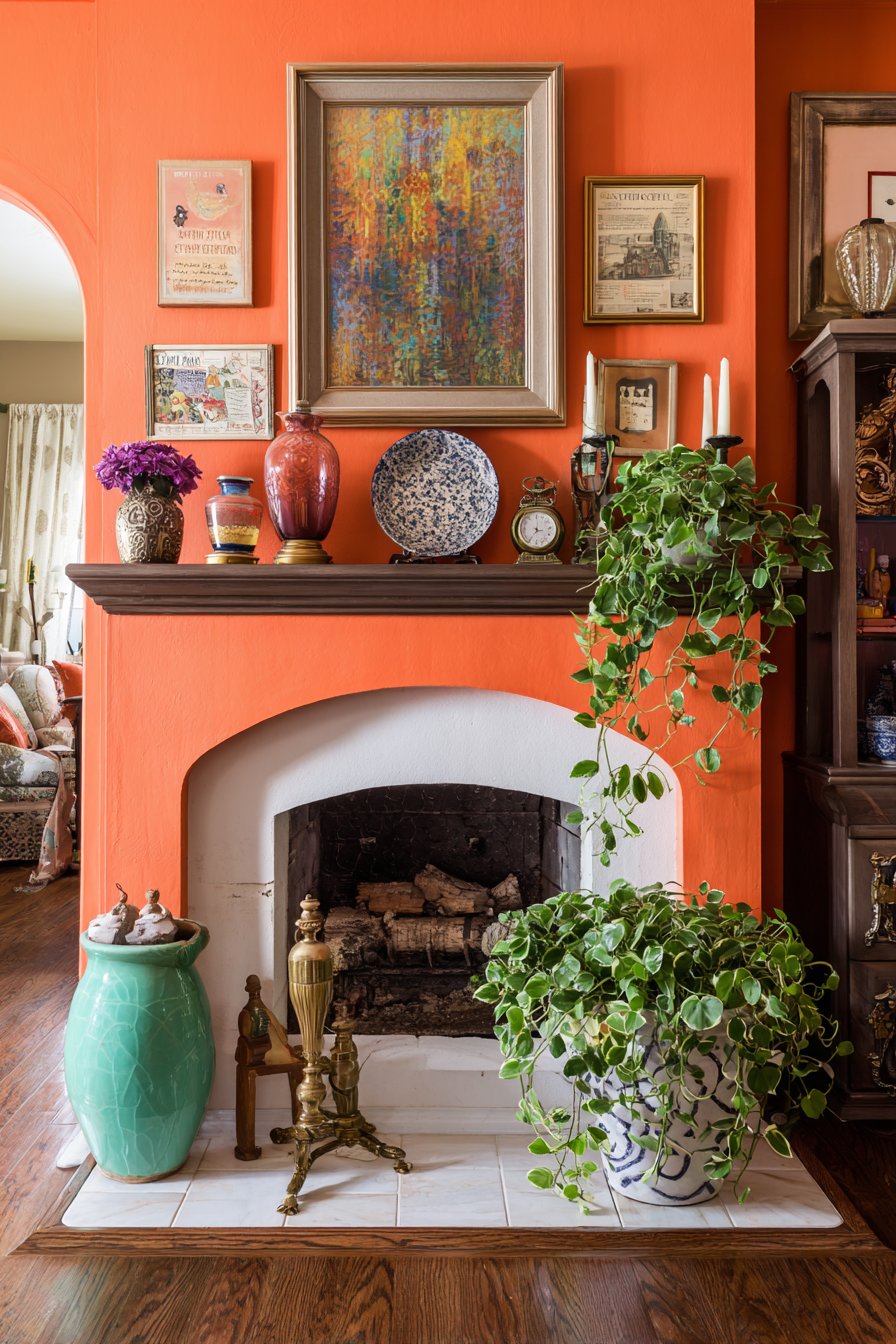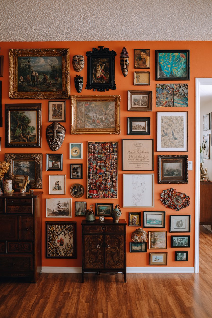 The warm burnt orange wall color provides a unifying backdrop that makes diverse artwork and frames appear intentional rather than random. This bold wall choice creates enough visual strength to support the busy arrangement while warm undertones complement both metallic frames and colorful artwork. Professional interior photography with carefully balanced lighting shows the careful curation within the apparent randomness—how larger pieces anchor corners, how color repetitions create visual pathways across the wall, how varying frame depths create subtle dimension, and how the overall effect feels collected over time rather than purchased in one shopping trip. This gallery wall demonstrates that eclectic design succeeds through thoughtful editing despite its “more is more” philosophy.