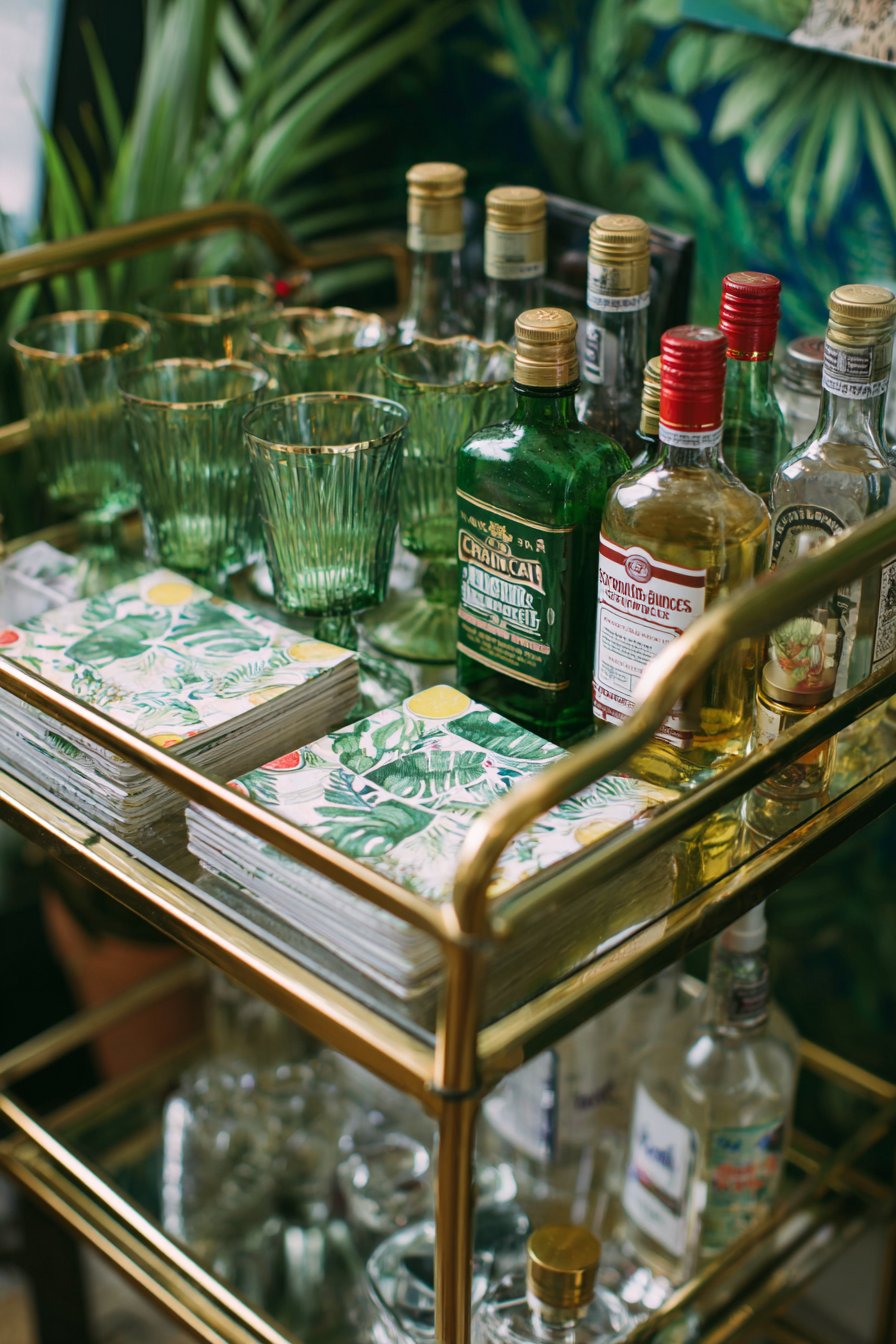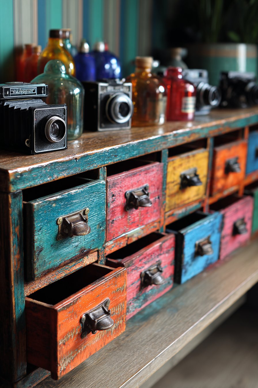 The cabinet top serves as a curated display platform for collections that reflect the inhabitant’s interests and aesthetic. Vintage cameras—perhaps including a Polaroid Land Camera, a twin-lens reflex, and a 35mm rangefinder—create a sculptural grouping celebrating analog photography’s mechanical beauty. Colorful glass bottles in various heights and hues catch light beautifully, perhaps including cobalt blue apothecary bottles, amber medicine bottles with embossed labels, and emerald green seltzer bottles. Potted cacti and succulents in small ceramic containers add living elements requiring minimal maintenance while their geometric forms and varied greens create organic contrast with the manufactured objects.