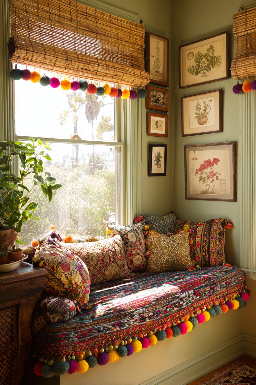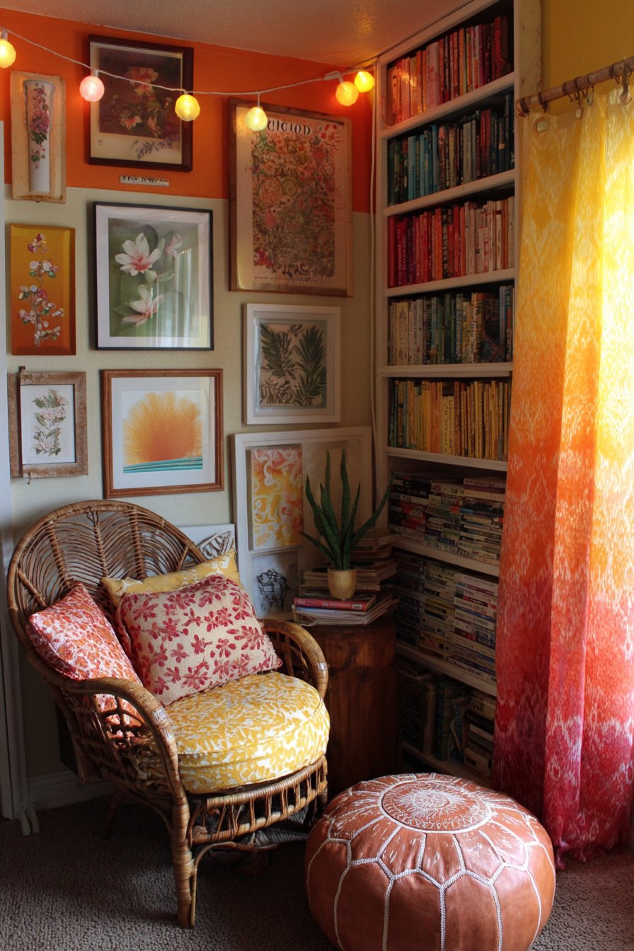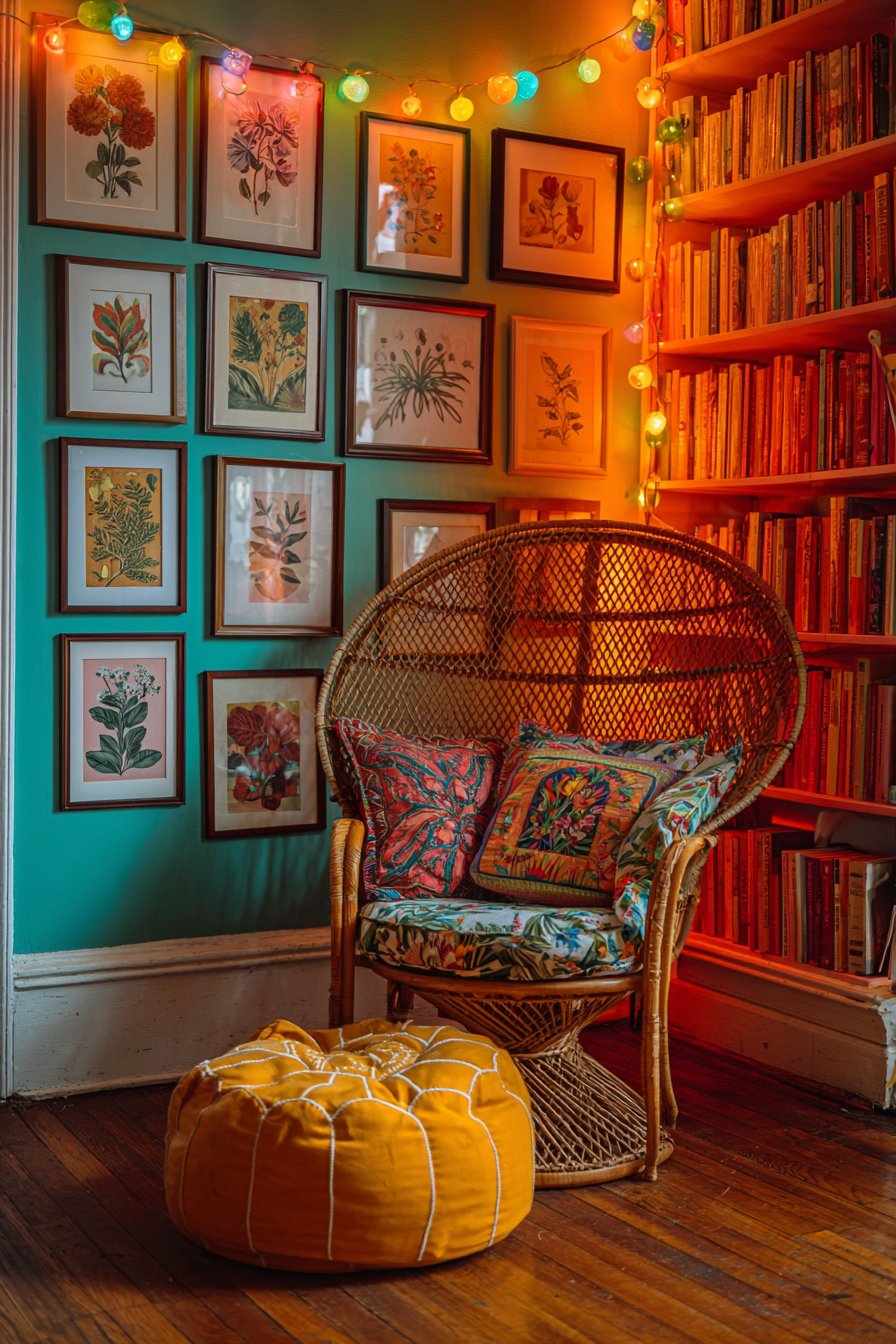 String lights with colorful bulbs drape overhead in casual swoops, creating a magical canopy effect that transforms the nook into an enchanted space, especially during evening reading sessions. These lights provide soft, flattering ambient illumination that’s gentle on eyes during extended reading while adding whimsical charm. The surrounding walls display a curated mix of framed vintage botanical prints—featuring detailed scientific illustrations of plants, flowers, and ferns—alongside contemporary graphic art with bold shapes and limited color palettes. This combination honors both traditional and modern aesthetics while maintaining the space’s literary, contemplative character. Detail-focused interior photography captures this cozy corner bathed in soft natural lighting from a nearby window, highlighting the interplay of textures—woven rattan, soft textiles, smooth book spines, hand-painted wood—and the progressive rainbow of colors that makes this nook feel like a personal treasure.