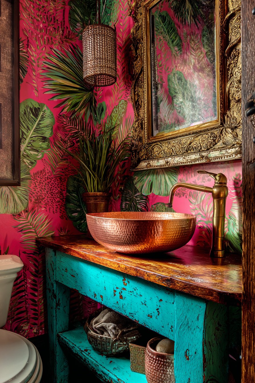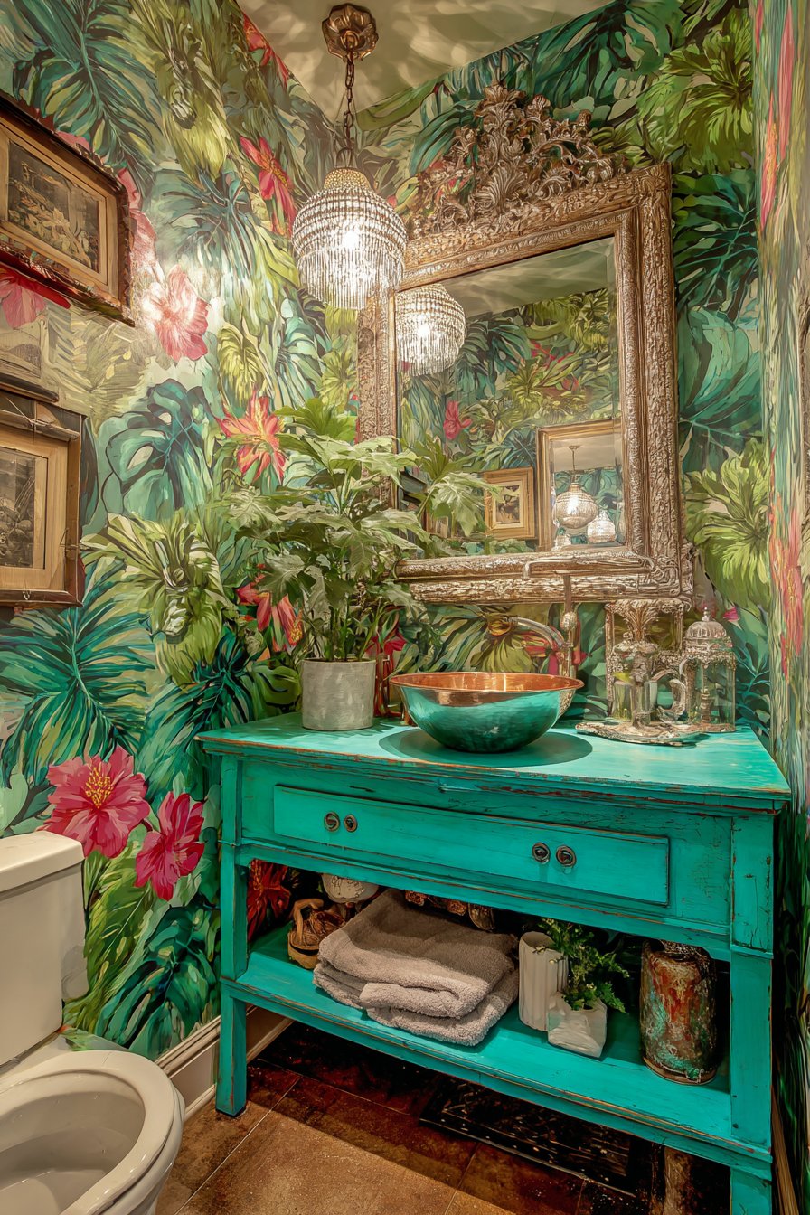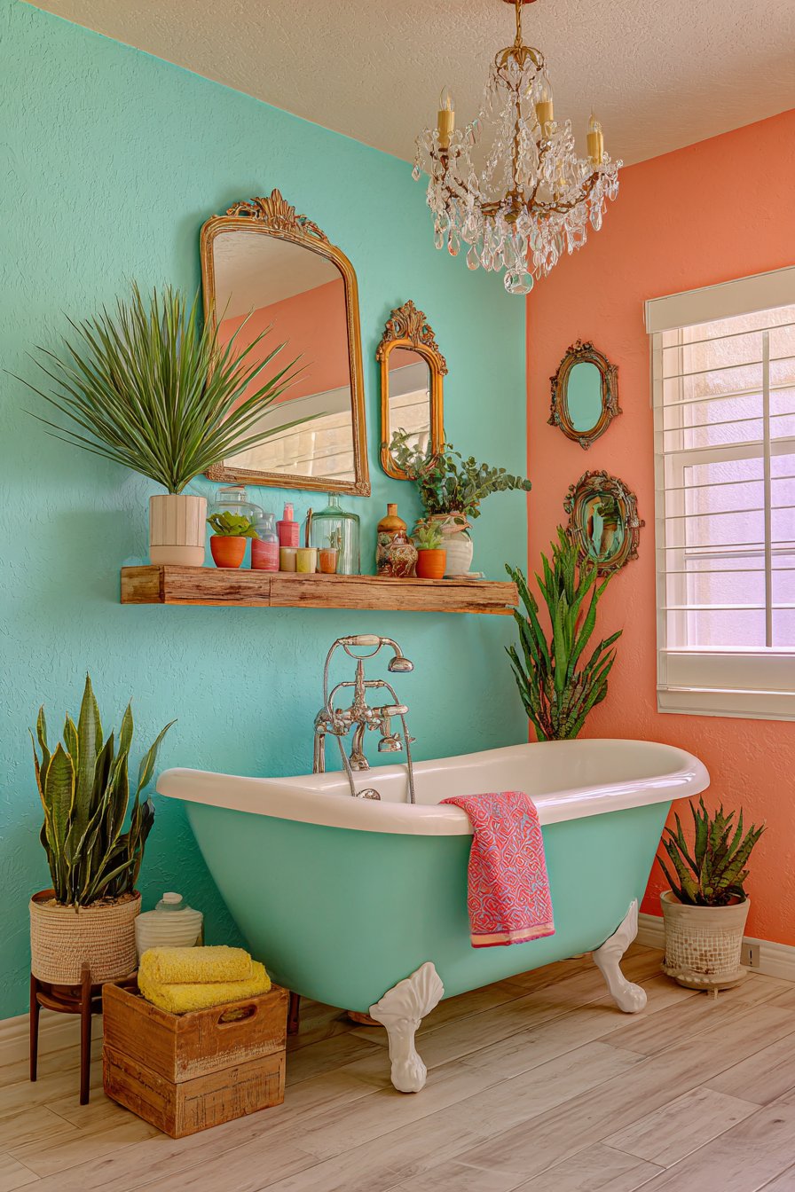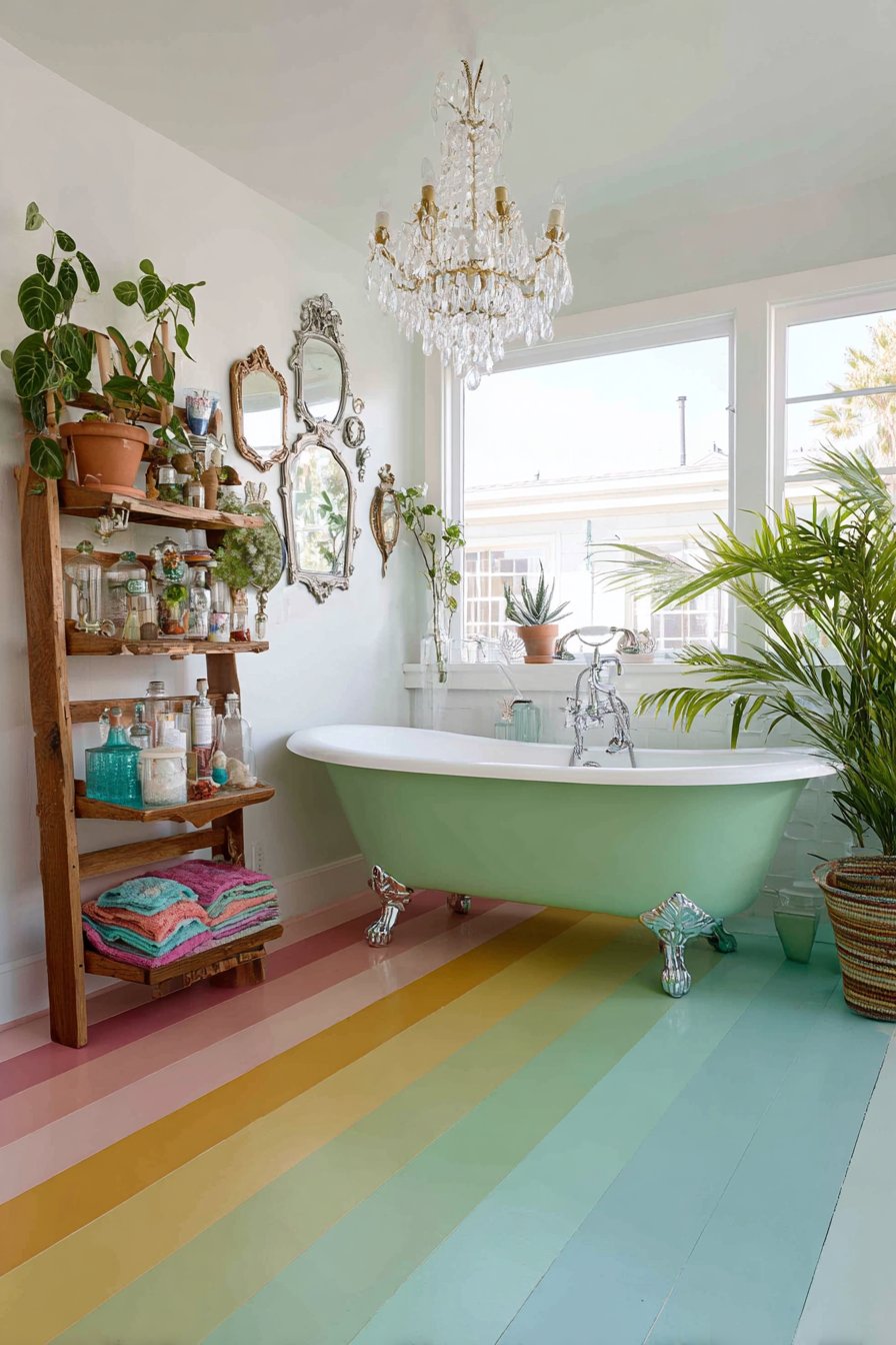 Against this colorful foundation, a classic clawfoot tub painted on the exterior in soft sage green provides a surprising twist on a traditional bathroom fixture. While most clawfoot tubs retain their original white enamel or are left in natural cast iron, this painted exterior approach personalizes the piece and connects it to the room’s overall color story. Above this unexpected bathing centerpiece hangs a vintage crystal chandelier—a dramatic juxtaposition of formal elegance and casual bathroom function that epitomizes eclectic design’s rule-breaking spirit. The chandelier catches light from windows and fixtures, casting prismatic reflections across the colorful floor and creating magical lighting effects.