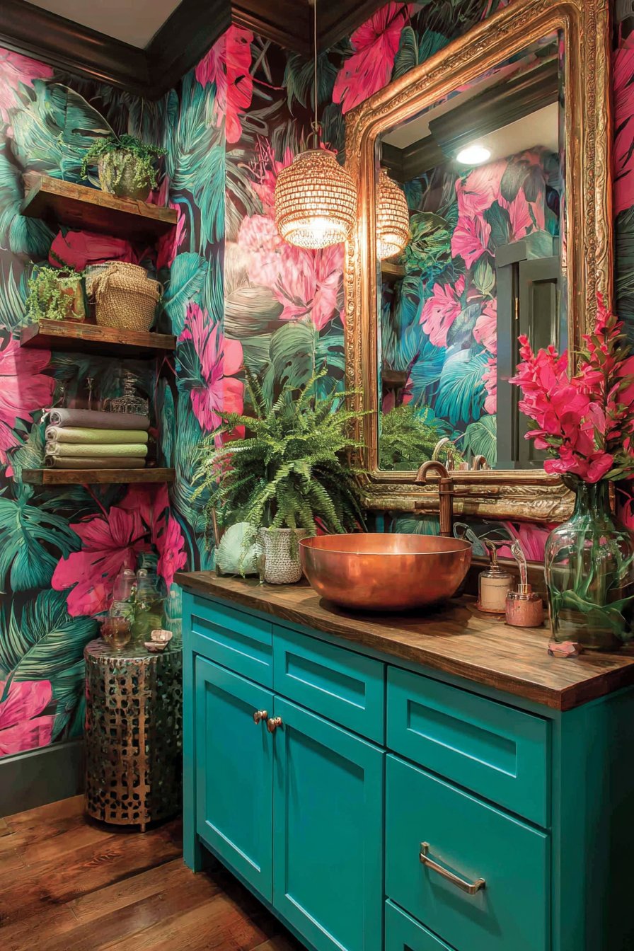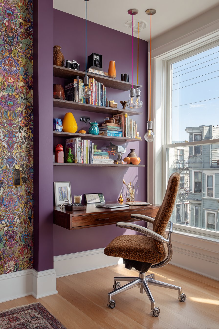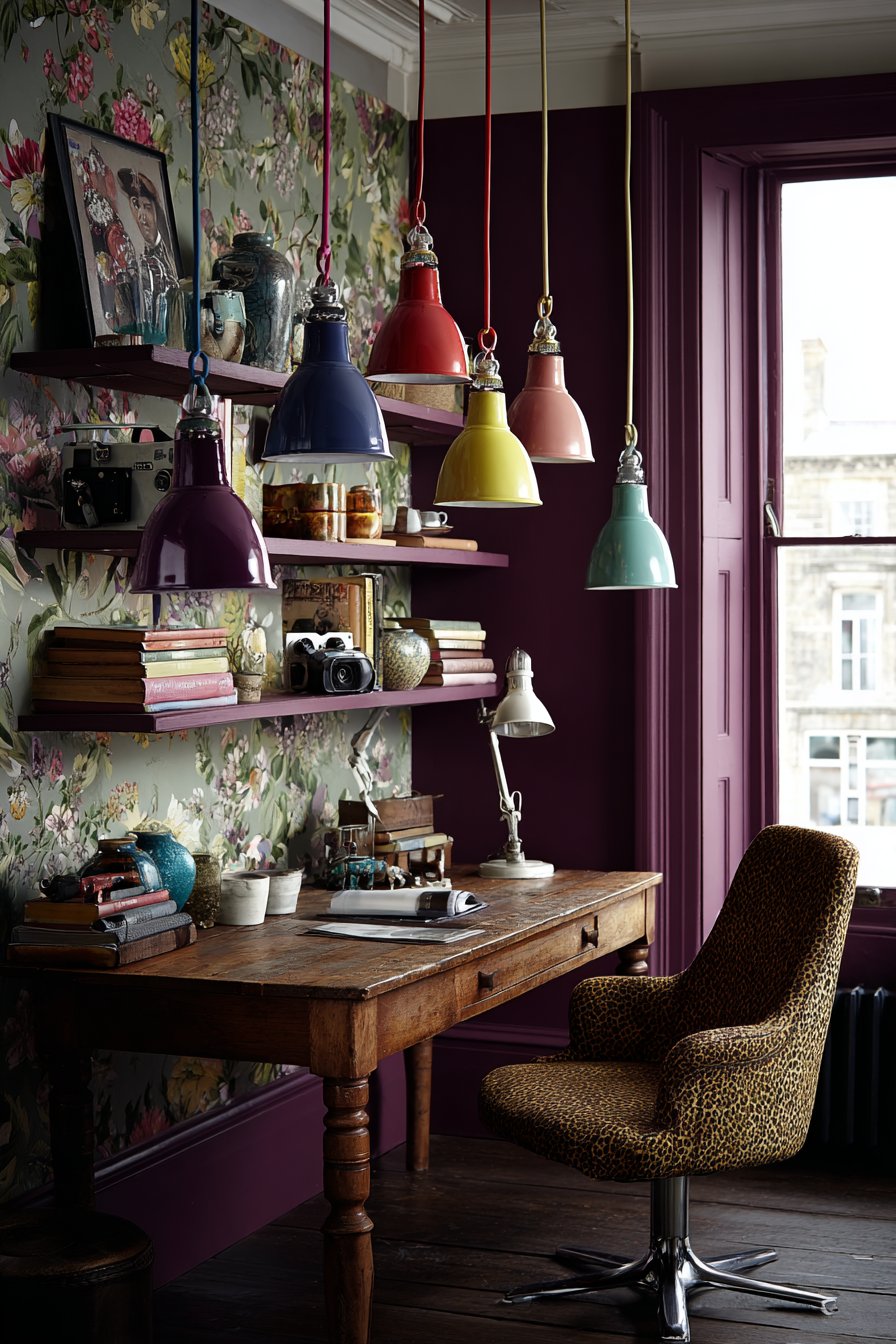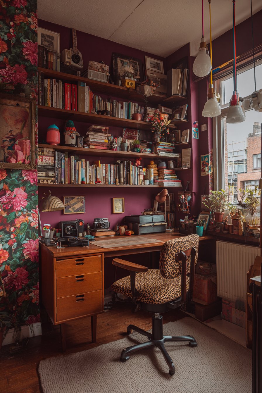 Floating shelves mounted on one deep plum accent wall create both practical storage and curated display opportunities. The shelving showcases what appears to be “curated chaos”—books arranged by color or subject, vintage cameras celebrating analog photography, colorful pottery in various glazes and forms, and small sculptures that might include anything from African art to modern abstract pieces. This deliberate disorder creates visual interest while revealing the inhabitant’s diverse interests and aesthetic sensibilities. The remaining walls feature botanical print wallpaper with detailed illustrations of leaves, flowers, and vines in complementary tones, creating an immersive environment that brings nature indoors and provides visual respite during long work sessions.