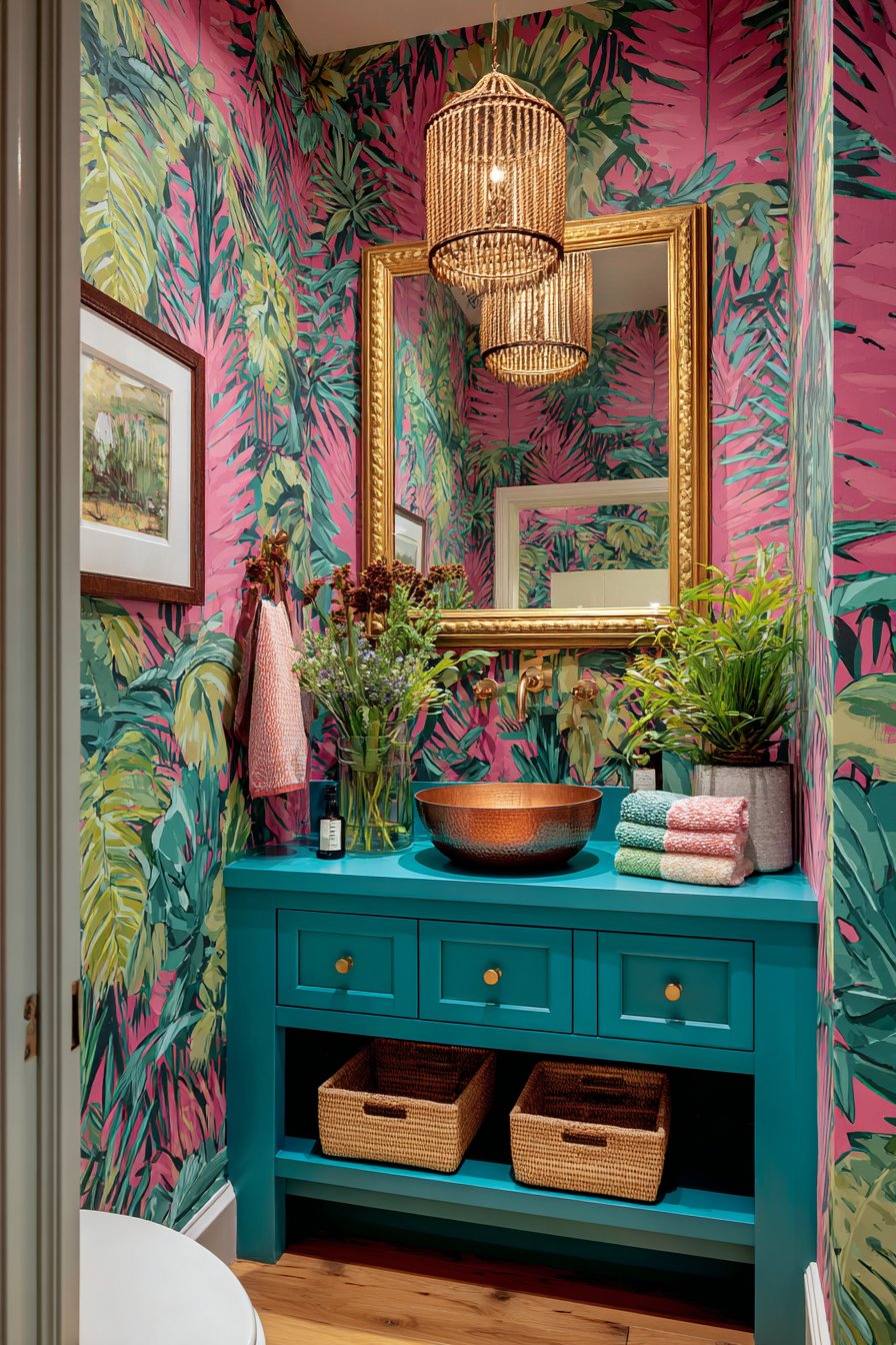 First impressions matter, and this entryway delivers immediate visual impact through fearless pattern and color application. The walls showcase bold geometric wallpaper in a striking combination of teal and coral, featuring large-scale shapes—perhaps overlapping circles, angular chevrons, or interlocking hexagons—that create movement and energy in what’s often a transitional space. This dramatic backdrop transforms a functional area into a memorable design statement that sets the tone for the entire home. A vintage console table painted in glossy yellow lacquer provides both practical surface space for keys and mail while serving as a functional sculpture. The high-gloss finish reflects light and adds contemporary polish to the vintage form.