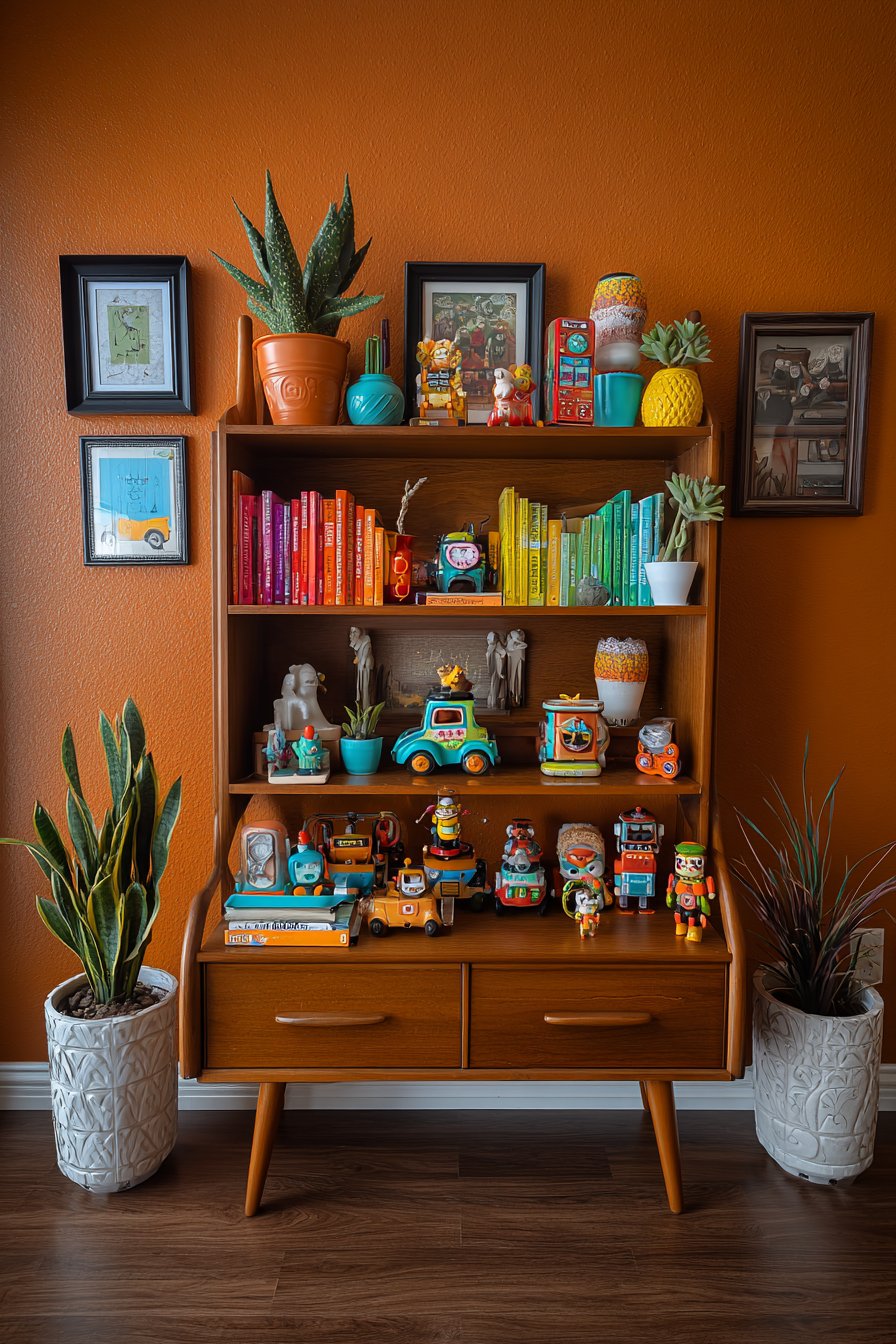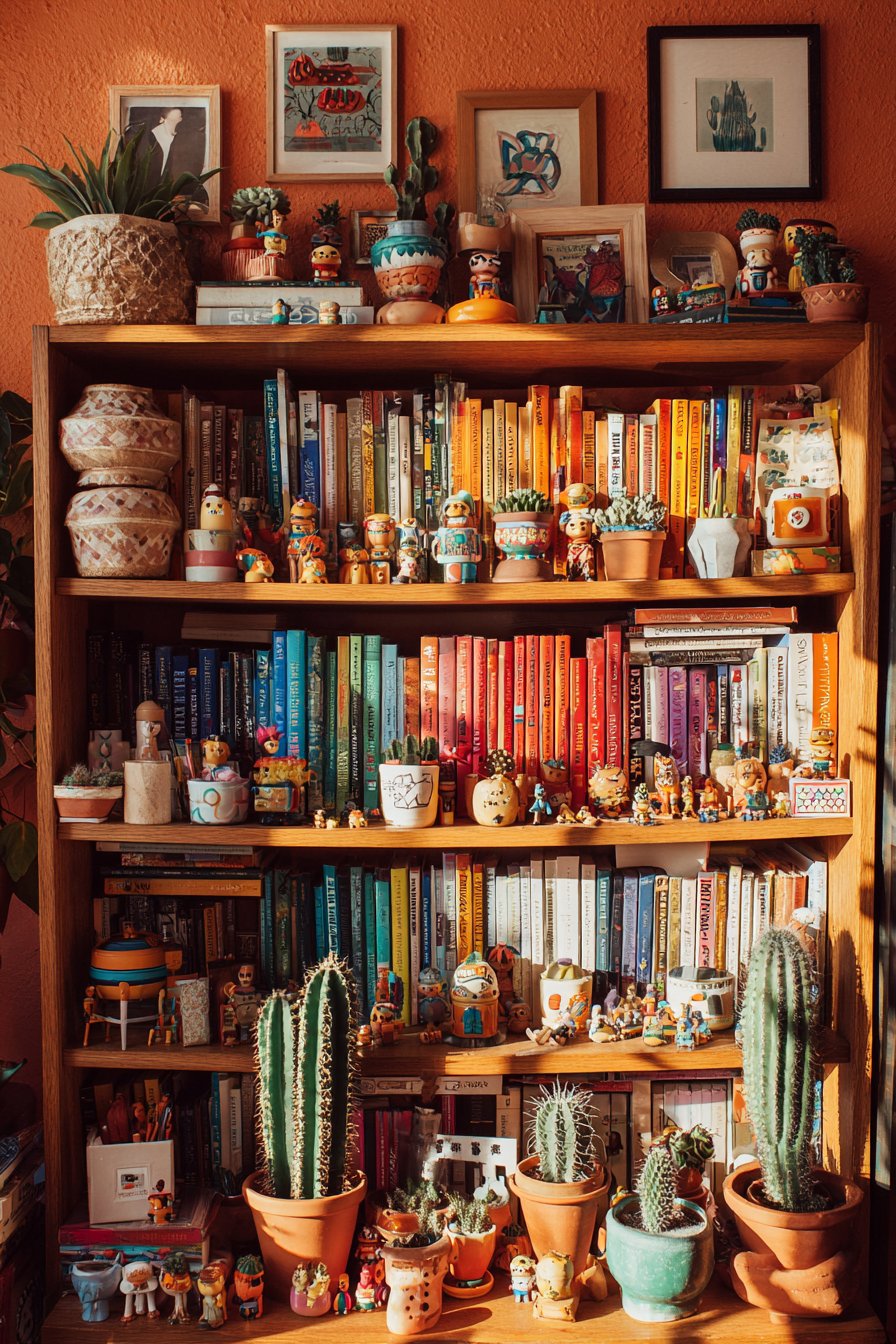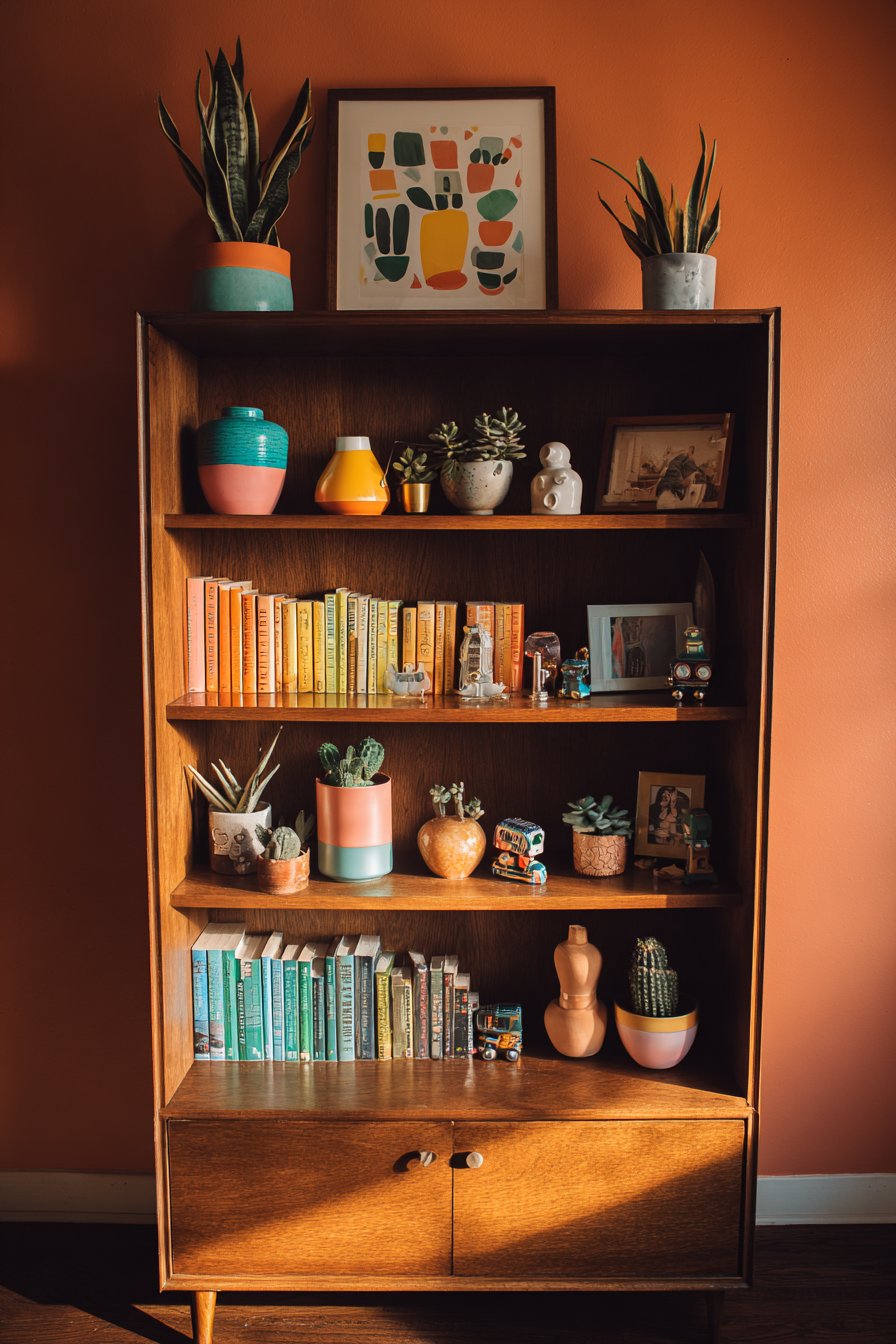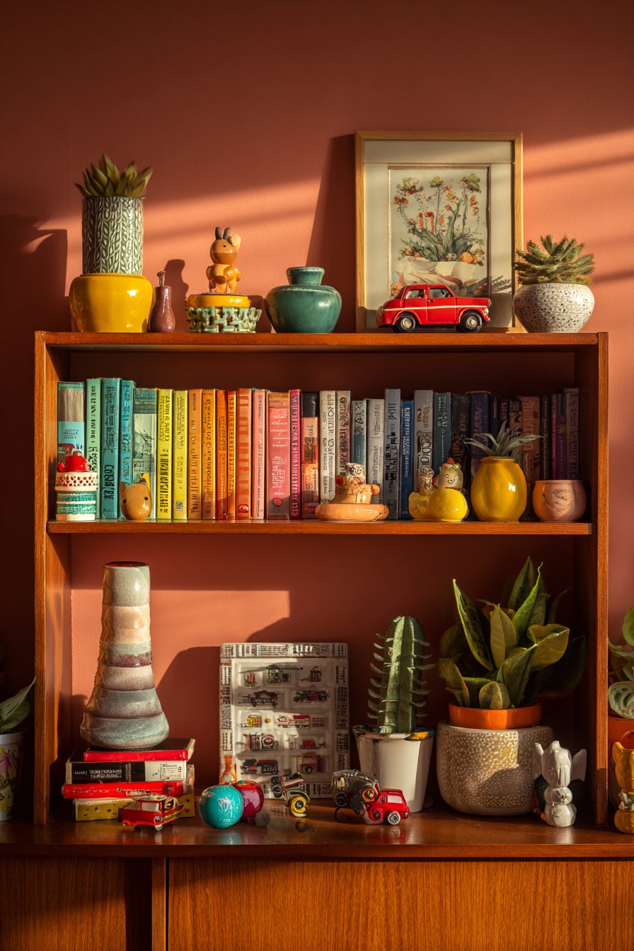 Plants in colorful pots add living greenery that softens the hard edges of books and objects while introducing organic forms to the structured grid. These might include trailing pothos that cascade down the shelf front, upright snake plants providing vertical interest, or small succulents in bright ceramic containers. Quirky collectibles reveal the inhabitant’s interests and travels—perhaps vintage toys, small souvenirs from different countries, miniature musical instruments, or found objects elevated to display-worthy status through thoughtful placement. The bookshelf itself appears to be a mid-century modern piece in warm walnut, its clean lines and quality craftsmanship providing a worthy foundation for the colorful display. The wall behind painted in warm terracotta creates a cohesive backdrop that makes both books and objects pop while adding earthy warmth. Detail-focused interior photography with natural side lighting creates depth and highlights the thoughtful yet playful curation, showing how each object casts small shadows and how the varied textures—smooth book spines, rough pottery, glossy ceramic, living plants—create tactile interest.