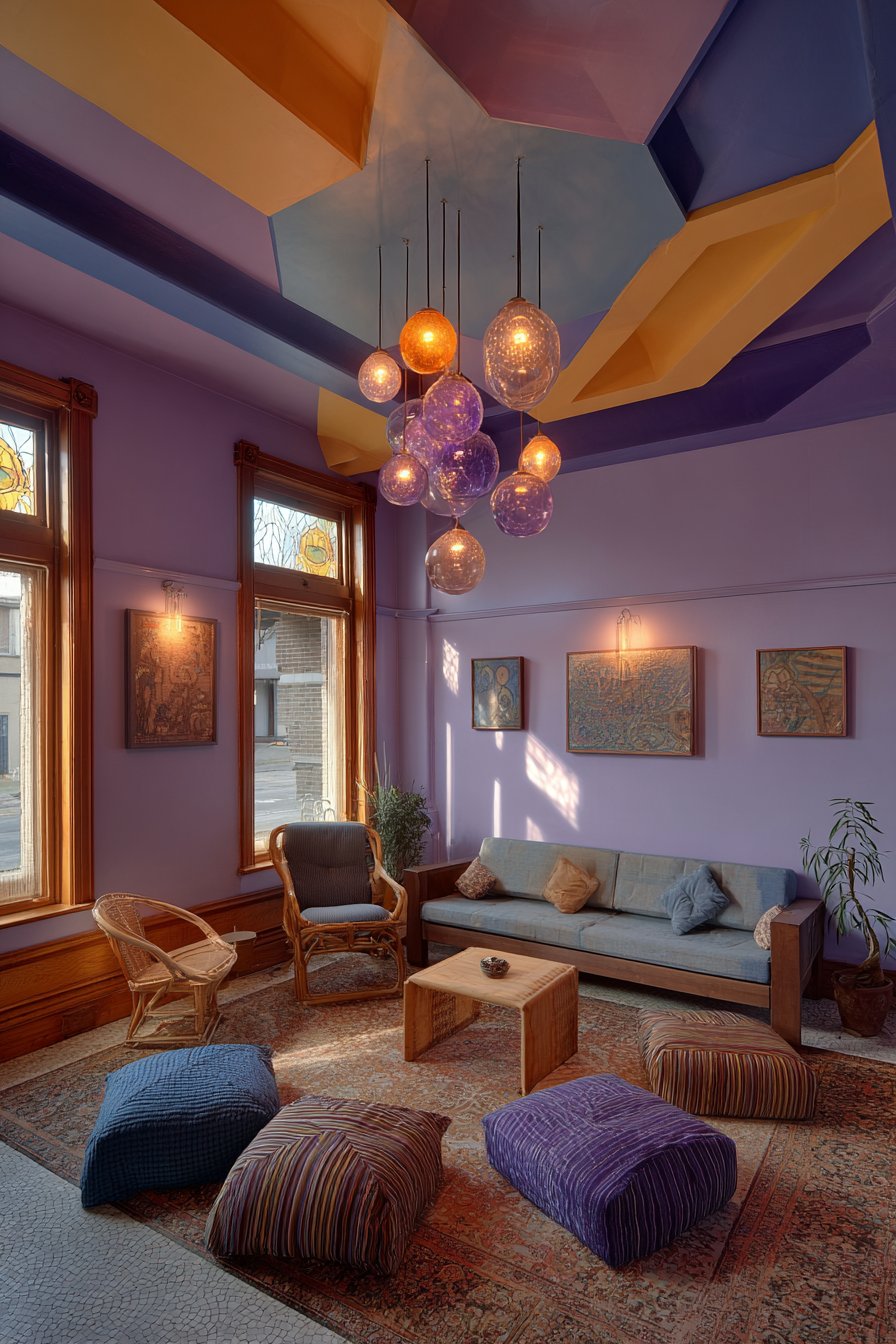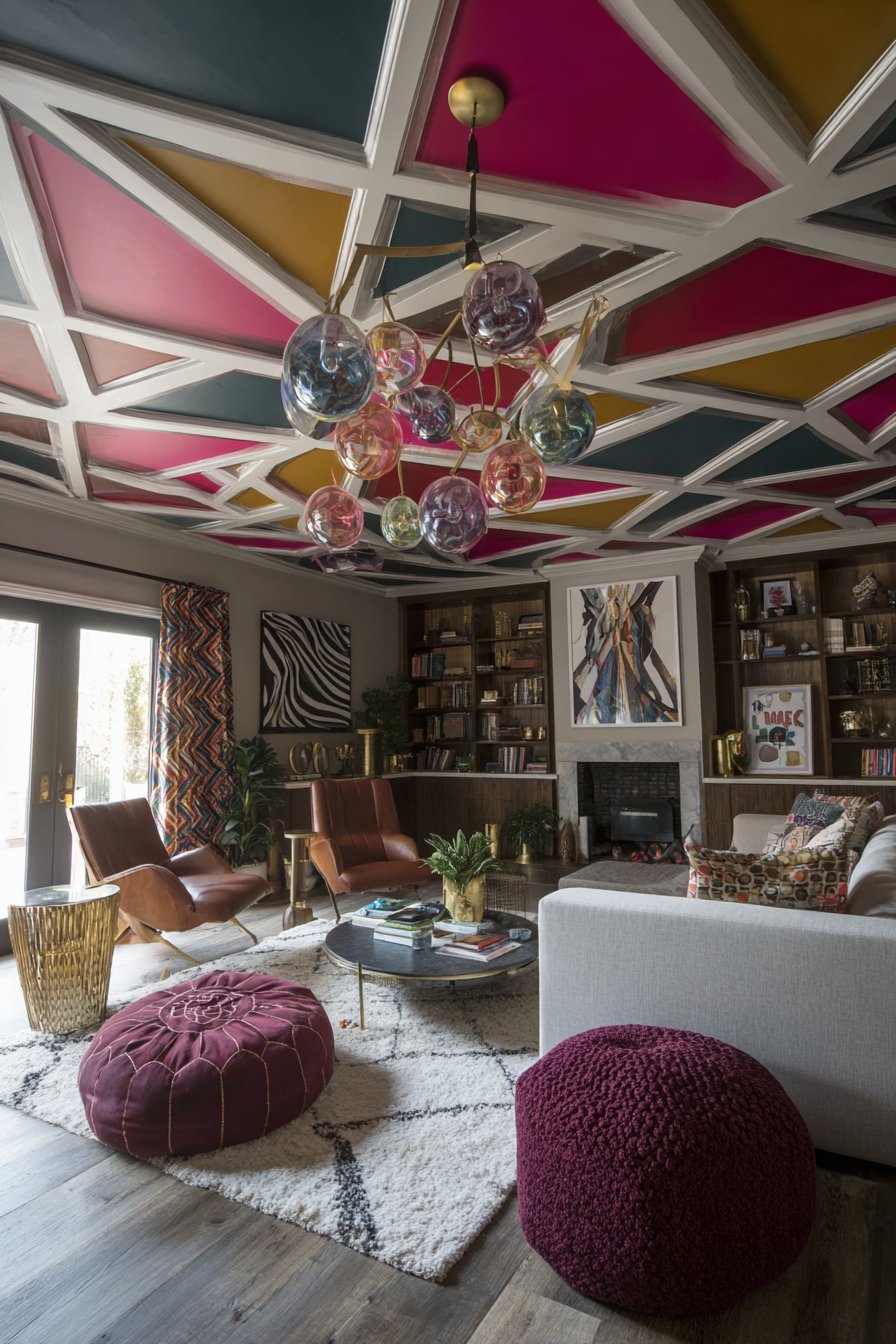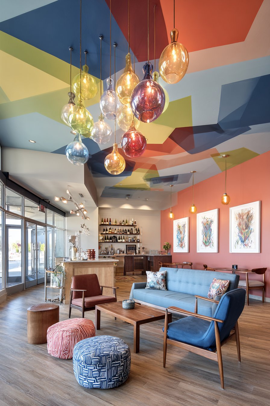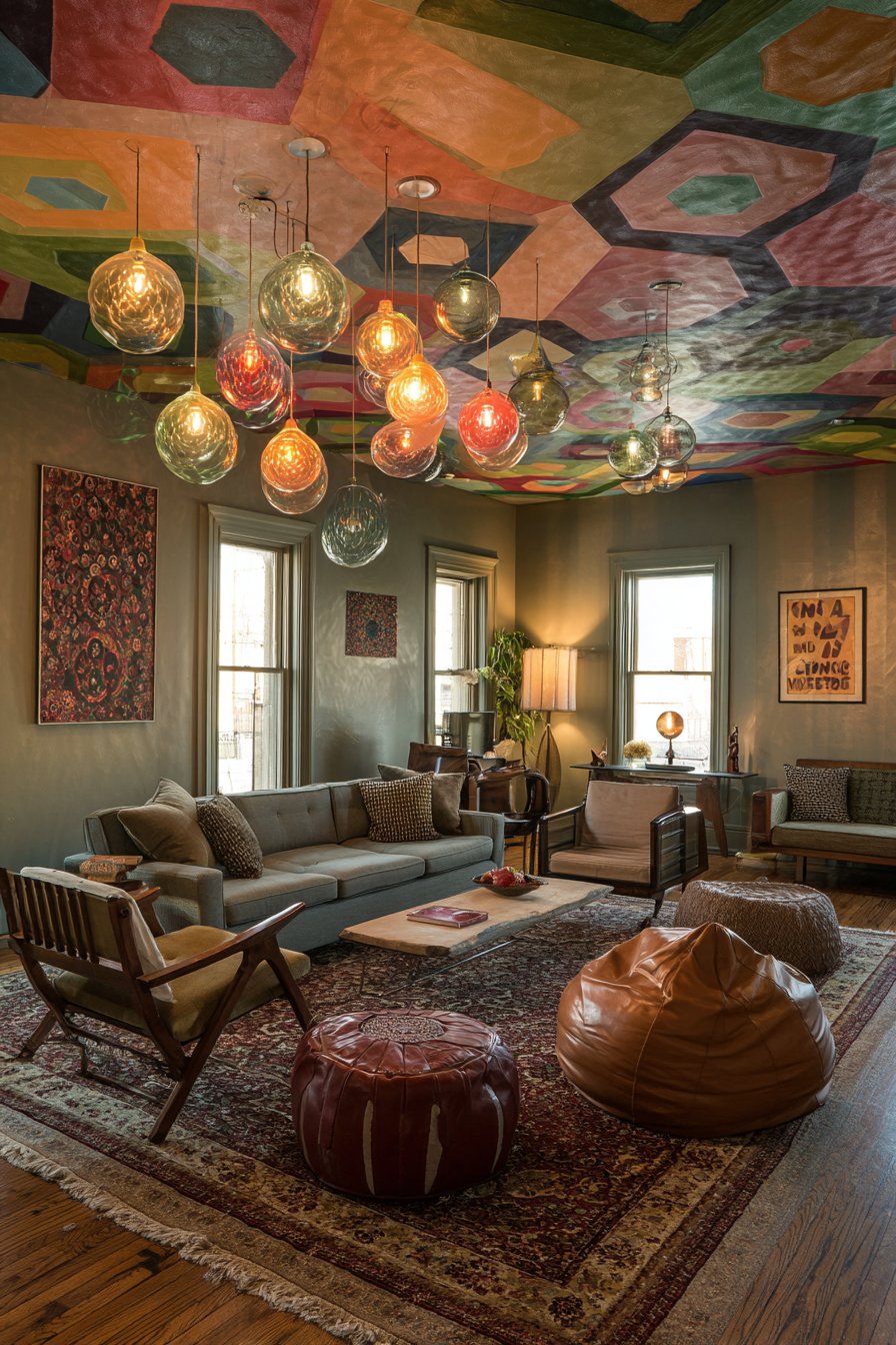 Walls display eclectic art that picks up colors from the painted ceiling, creating visual connections between horizontal and vertical surfaces. This art might include abstract paintings, vintage posters, contemporary photography, and textile pieces that together reflect the inhabitant’s diverse interests and aesthetic evolution. A statement light fixture with colorful glass pendants hanging at different heights creates a sculptural element that bridges the dramatic ceiling and the living space below. The pendants might be in colors that echo the ceiling pattern—coral, teal, and mustard spheres suspended at staggered heights creating a kinetic, dynamic quality. Wide-angle interior photography captures the full room including the dramatic ceiling with balanced exposure that shows how the overhead pattern influences color choices throughout the space, creating a cohesive design story that unfolds from top to bottom.