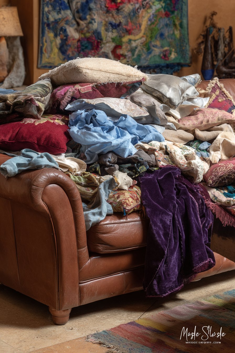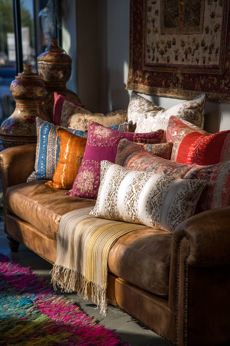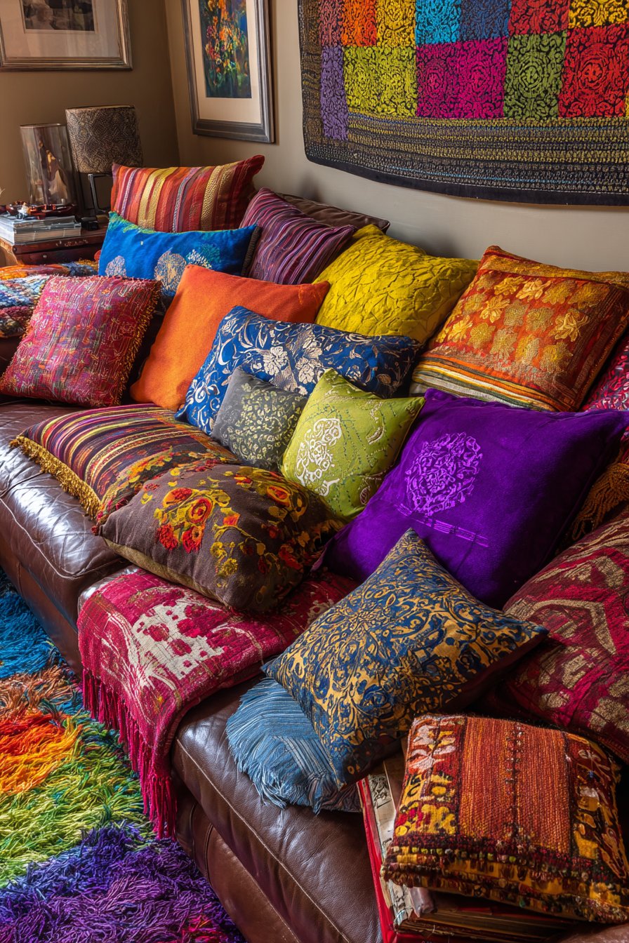 This living space demonstrates the pinnacle of textile layering, transforming a simple leather sofa into a cocoon of comfort through strategic pillow and throw placement. The leather sofa itself provides a substantial, neutral foundation—perhaps in rich cognac or deep chocolate brown—its smooth, slightly worn surface suggesting quality and longevity while providing a simpler backdrop that makes the textile layering possible without creating visual chaos. The pillow collection represents a masterclass in pattern, texture, and color mixing: velvet pillows in jewel tones provide luxurious softness and light-catching sheen, silk pillows in ikat or suzani patterns contribute global sophistication and smooth texture, linen pillows in natural tones offer casual, washable practicality, embroidered pillows showcase handcrafted detail and dimensional texture, printed pillows feature everything from geometric to floral to abstract patterns in various color palettes, and fringed pillows add playful trim detail and additional texture.