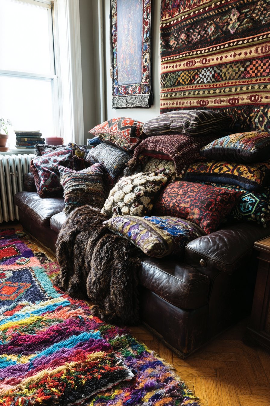 A shaggy rug in bright colors—perhaps a Moroccan-inspired style with geometric patterns in fuchsia, orange, and turquoise—anchors the seating area, its deep pile providing soft landings for bare feet and creating textural contrast with the smooth leather sofa and various woven throws. The nearby wall features tapestry art—perhaps a vintage textile piece or contemporary fiber art—that continues the textile theme vertically and adds cultural or artistic depth. Interior design photography with soft natural lighting emphasizes the tactile quality and richness of the layered fabrics and materials, showing how different textile weights, weaves, and textures create dimensional interest while maintaining a cohesive color story that prevents the abundance from feeling chaotic. The lighting catches the sheen of silk, the depth of velvet pile, the texture of embroidery, and the shadows within the shaggy rug, creating a composition that makes viewers want to reach out and touch.