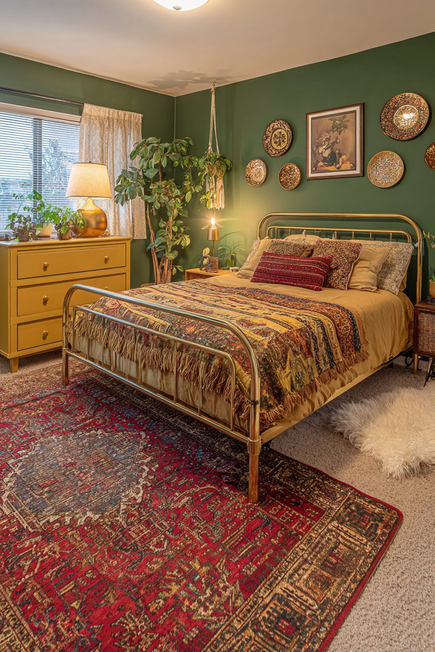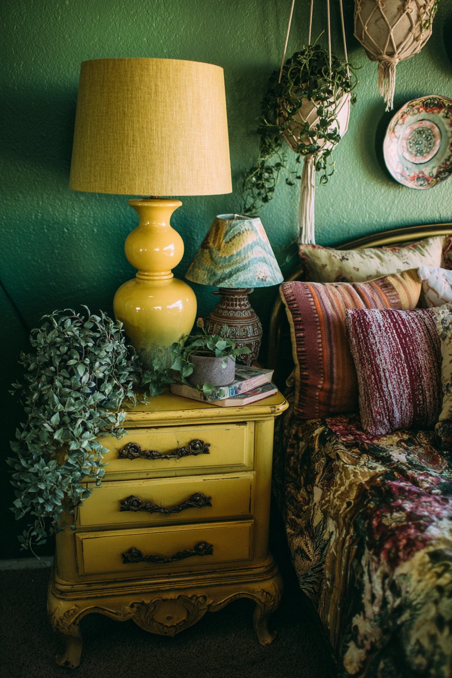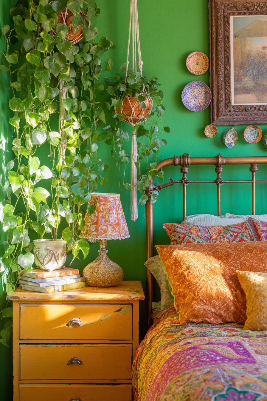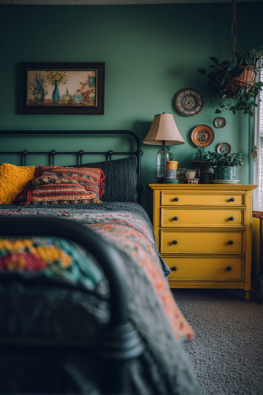 One wall painted in a lush, deep emerald green provides a dramatic backdrop for a curated collection of vintage ceramic plates mounted in a carefully casual arrangement. These plates, varying in size, pattern, and origin—perhaps including majolica, transferware, and hand-painted ceramics from different continents—create a three-dimensional wall installation that celebrates craftsmanship and travel. The refurbished vintage dresser painted in a warm mustard yellow adds another bold color note while providing essential storage. Atop this piece sits a collection of quirky table lamps with mismatched shades—perhaps one with fringe, another with beading, and a third with vintage fabric—each contributing to the room’s layered lighting scheme.