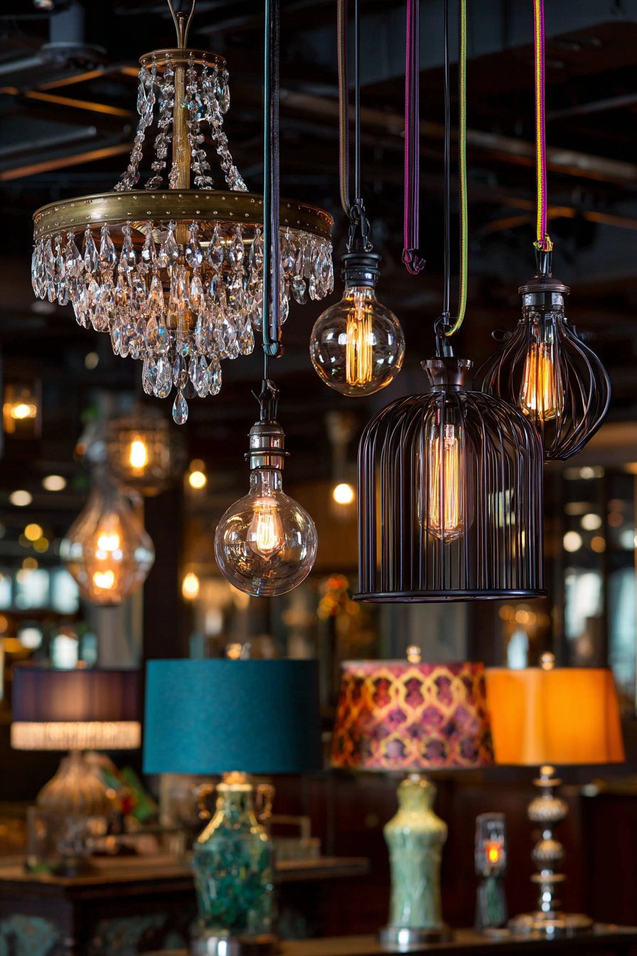 Each fixture differs dramatically in style, era, and finish, yet they work together cohesively because they share similar scale proportions and because the surrounding eclectic room provides context for their diversity. The room’s other elements visible in the frame—perhaps velvet seating, patterned wallpaper, collected artwork—demonstrate that the mismatched lighting fits within an intentionally curated eclectic aesthetic rather than appearing accidentally assembled. Interior photography taken during evening hours with all lights illuminated shows the warm ambient glow and how different lighting styles create layered illumination that can be adjusted for various activities and moods. The image captures how the crystal chandelier creates sparkle and elegance, the industrial pendants provide focused task lighting, the arc lamp offers flexible directional light, and the table lamps contribute cozy pools of warm illumination, together creating a lighting scheme that’s both practical and theatrical.