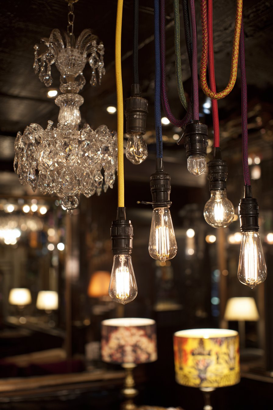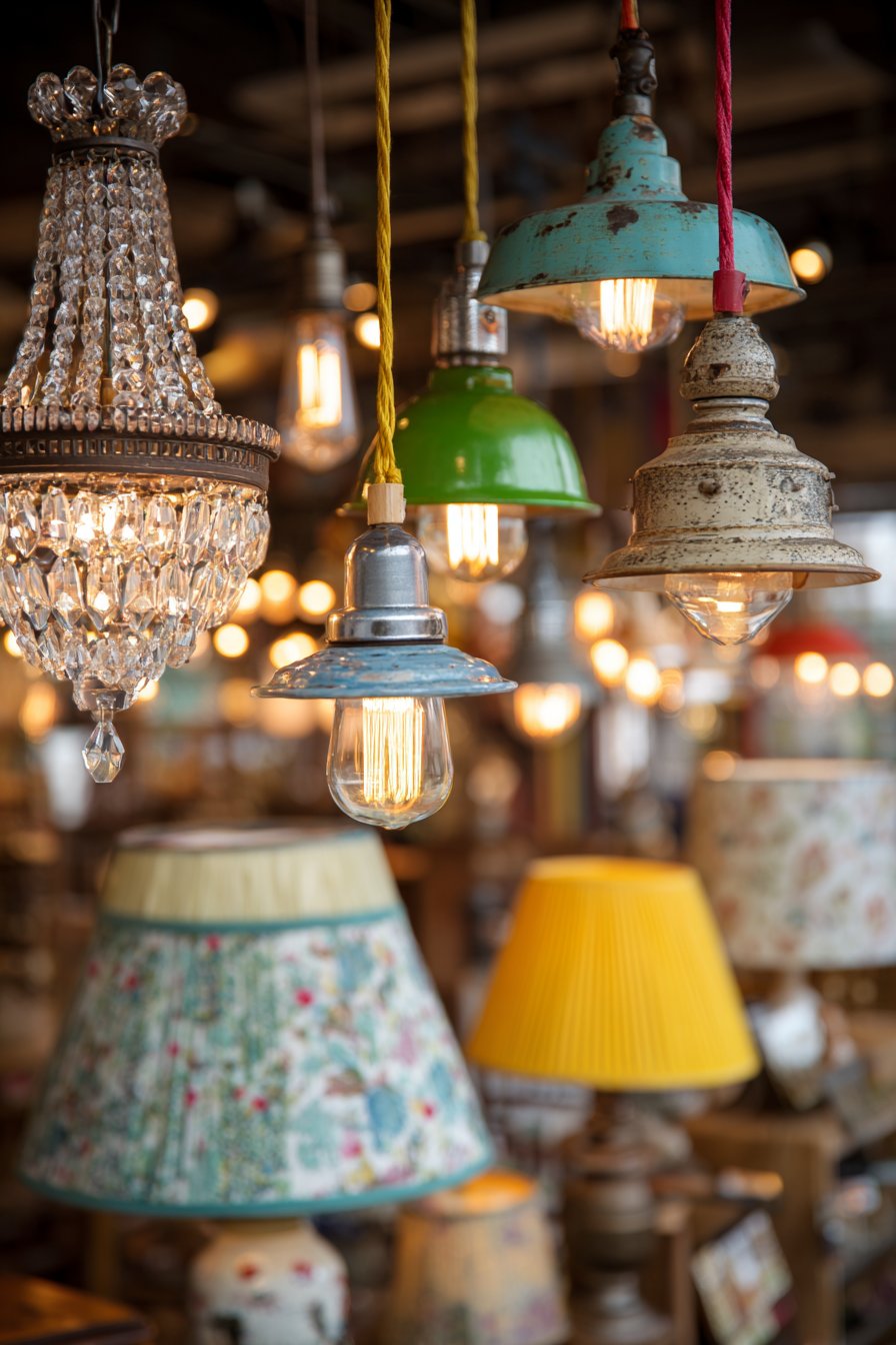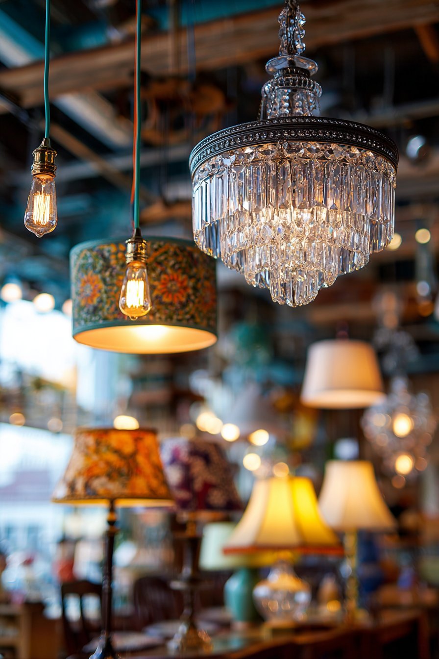 This space showcases sophisticated lighting design that layers multiple fixture types, styles, and eras to create flexible, functional, and aesthetically compelling illumination. The mix begins with a vintage crystal chandelier serving as the room’s jewelry piece—perhaps a multi-tiered European antique with faceted glass drops that catch and refract light into rainbow prisms across walls and ceiling. This formal, traditional fixture establishes one lighting character and provides ambient illumination for the entire space. Contrasting this elegant centerpiece are industrial pendant lights with colored fabric cords—perhaps in mustard yellow, turquoise, and coral—that hang over a work surface or dining table. These pendants might feature simple metal shades with exposed Edison bulbs, their utilitarian aesthetic creating intentional style clash with the ornate chandelier.
