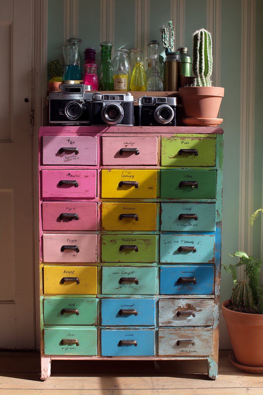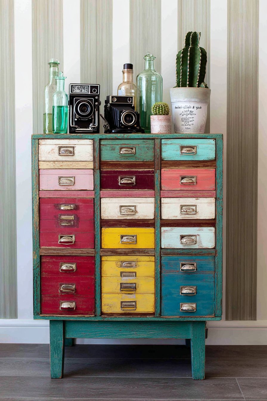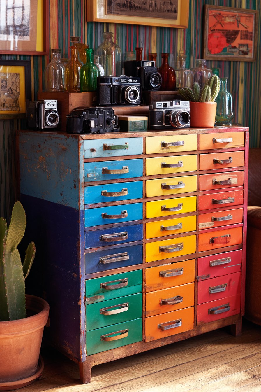 This storage solution proves that functional pieces can serve as sculptural focal points through bold color application and vintage character. The vintage apothecary cabinet features multiple small drawers—perhaps twenty or more—arranged in a grid formation, each drawer painted a different color creating a rainbow gradient effect that transitions smoothly from warm to cool tones. Reds at the top progress through oranges and yellows, transitioning to greens, blues, and finally purples at the bottom, creating a vertical chromatic spectrum that turns practical storage into functional art. Each drawer might feature original brass or glass pulls, their vintage hardware adding authentic period detail while maintaining functionality.