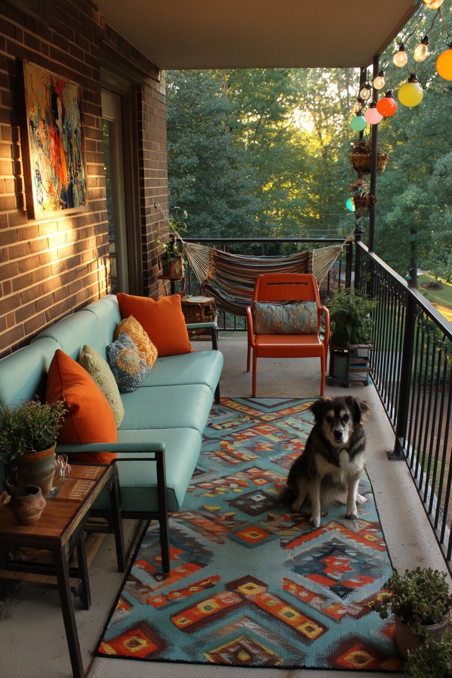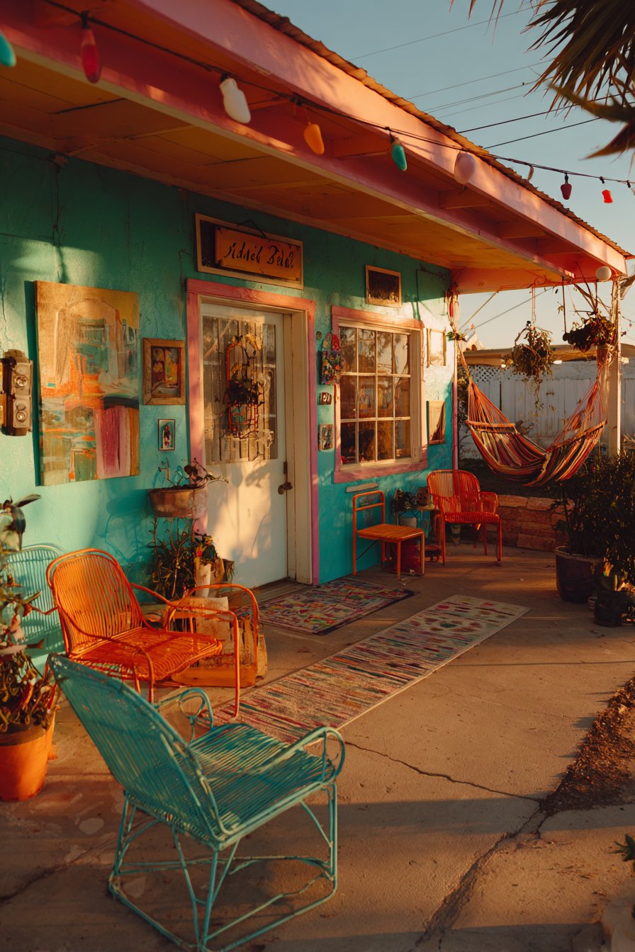 This outdoor patio proves that eclectic design principles translate beautifully beyond interior walls, creating an exterior living space with personality equal to any indoor room. The furniture collection deliberately mismatches styles, eras, and materials: a vintage metal glider painted cheerful turquoise provides nostalgic seating with gentle rocking motion, its powder-coated finish protecting the metal from weather while the bright color energizes the outdoor space. Modern molded plastic chairs in traffic-cone orange offer stackable, durable seating with mid-century modern silhouettes, their weather-resistant material and bold color providing contemporary contrast to the vintage glider. A hammock with colorful woven pattern—perhaps featuring traditional Mayan striping in rainbow hues or Mexican-style macramé with fringe—hangs between posts or trees, creating a relaxed lounging option that adds South American or Caribbean character.