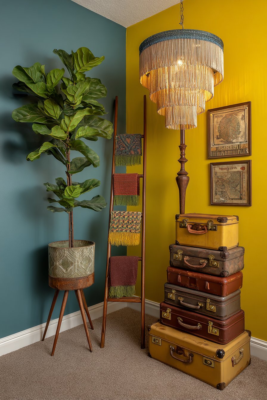 Stacked vintage suitcases on the floor provide practical storage while adding nostalgic travel-inspired character. These might include a robin’s egg blue hard-shell case from the 1960s, a tan leather weekender with brass hardware and travel stickers, and a floral tapestry overnight bag, each contributing color, texture, and suggestion of adventure and journey. A floor lamp with beaded fringe shade—perhaps wooden beads or colorful glass beads creating a curtain effect—illuminates the corner with soft, diffused light while the fringe creates movement and shadow patterns. Interior photography with soft directional lighting emphasizes textures—the wood grain of the ladder, the woven blanket fibers, the smooth suitcase surfaces, the broad plant leaves—while showing the creative use of vintage pieces and the fearless color blocking that makes this small corner feel like its own destination within the larger room.