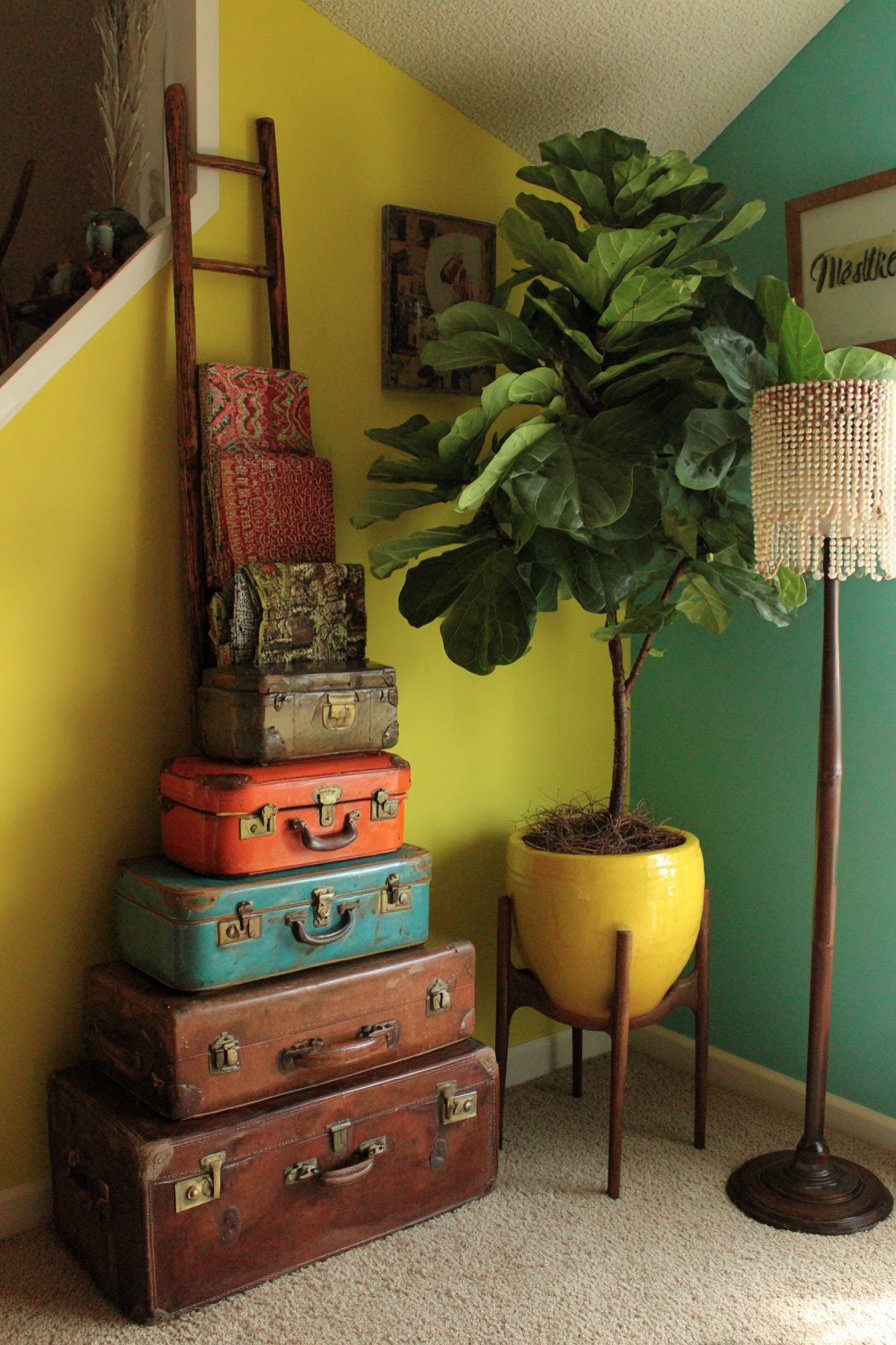 - Create vertical storage solutions with stacked vintage luggage